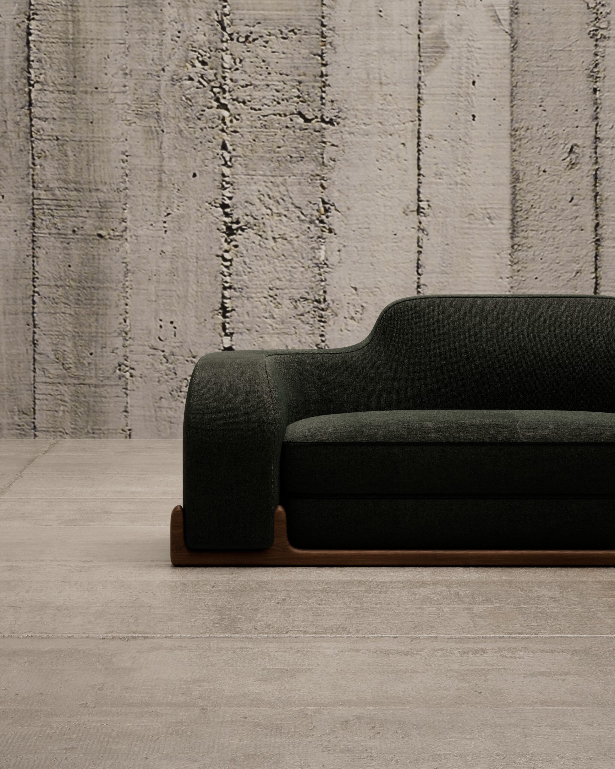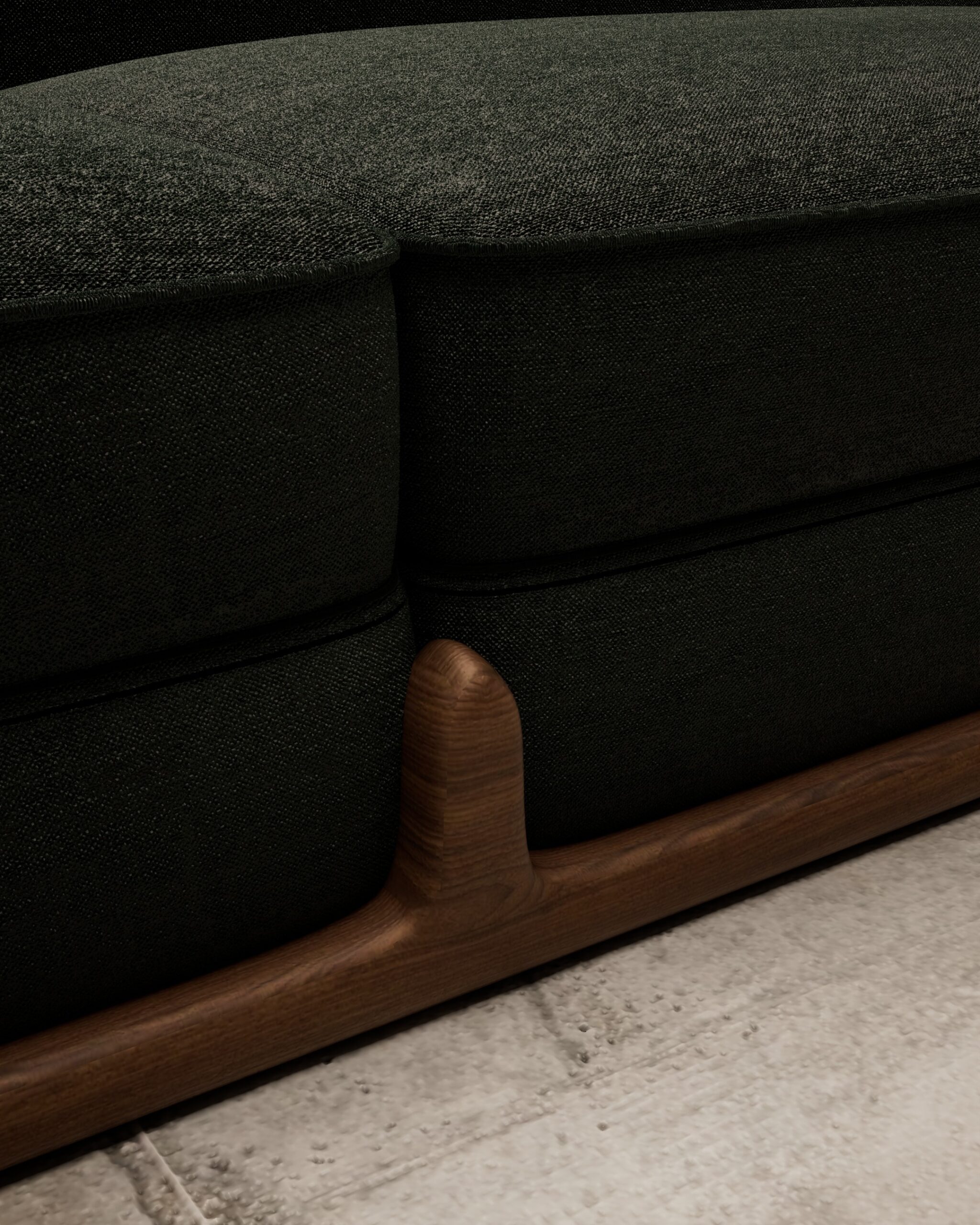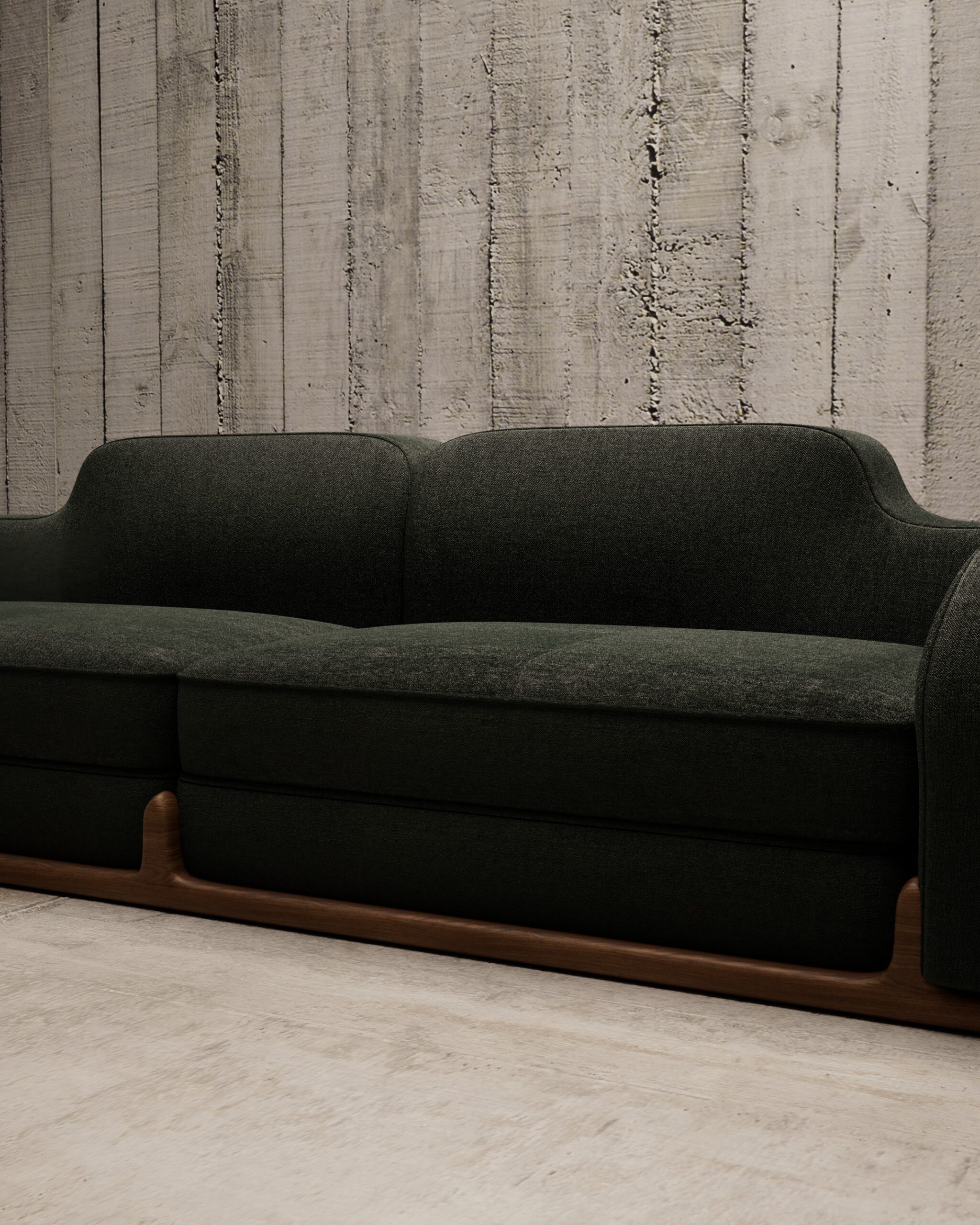 The HEWN sofa is a sculptural dialogue between nature and comfort. Its defining feature is the exposed solid wood base that cradles the upholstered form, featuring organic, branch-like joints that rise to embrace the seat. Upholstered in a deep forest green textured fabric, the silhouette flows in a continuous, gentle wave from the low arms to the higher backrest, grounding the piece in earthy, artisanal elegance.