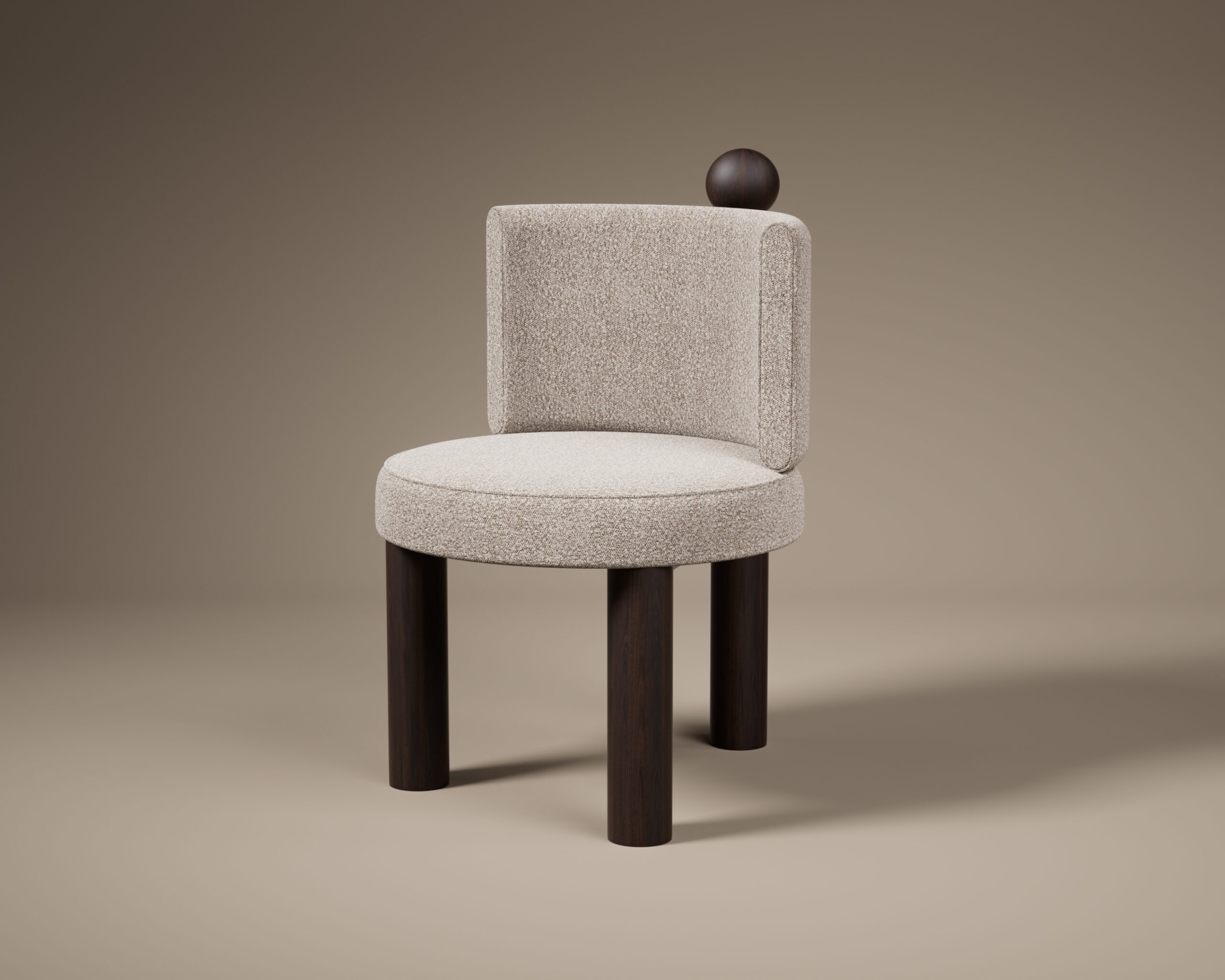 Upholstered in a high-density oatmeal bouclé, the thick circular seat and enveloping backrest offer a rich, tactile experience that balances the dark, polished timber. The DOT balances its bold, volumetric forms with refined artisanal details, serving as a sculptural and ergonomic focal point for high-end dining environments and creative residential spaces.
