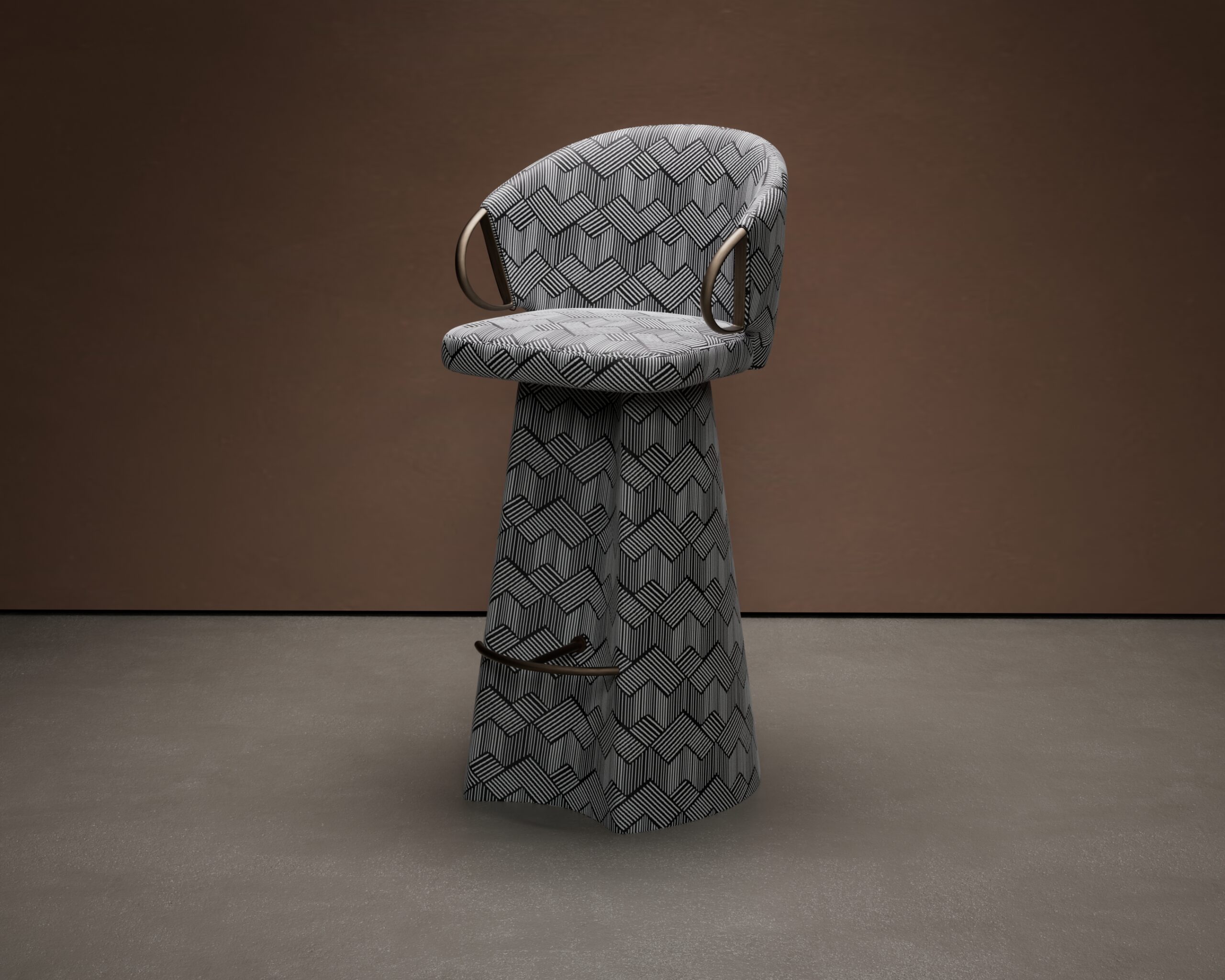 The AALTO bar stool is an exploration of seamless upholstery and fluid, organic geometry. Part of our Design Studio Collection, the piece is characterized by its monolithic silhouette, where the seat and the sculptural, fluted pedestal are unified in a single, continuous wrap of sand-toned bouclé. The design is punctuated by refined antique bronze accents, including ergonomic side handles and a minimalist footrest, balancing the stool’s soft, draped appearance with sharp architectural jewelry.