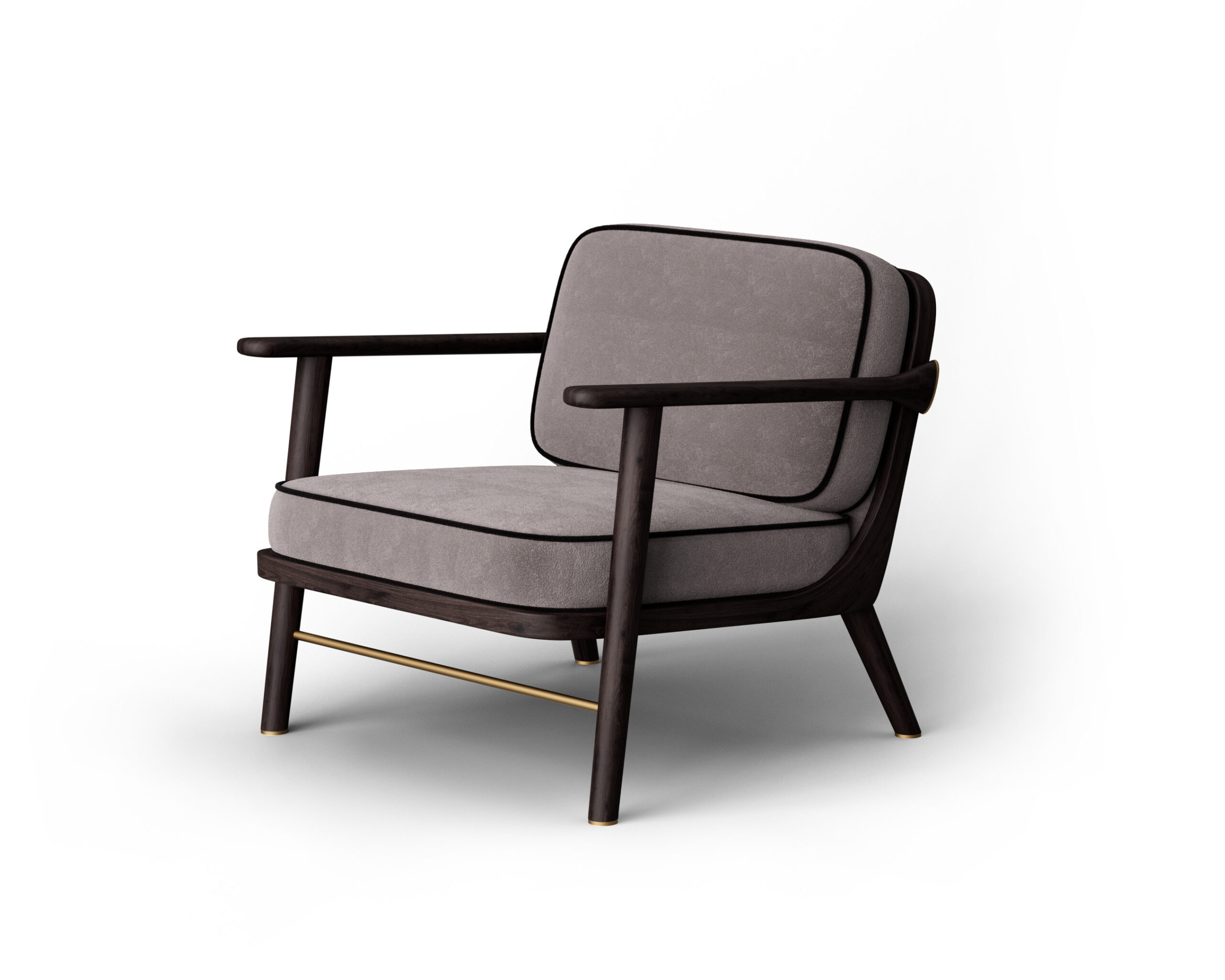 The visual narrative is driven by the contrast between the rigid, dark timber and the plush interior seating. Upholstered in a premium natural charcoal weave, the deep rectilinear seat and the slightly recessed, “floating” backrest provide an enveloping ergonomic embrace. A distinctive design detail is found in the way the backrest is nested within the wooden frame, creating a sense of visual lightness despite the chair’s monumental materiality. The ALON balances its bold architectural lines with sophisticated tactile warmth, serving as a commanding focal point for high-end residential lounges and modern executive offices.