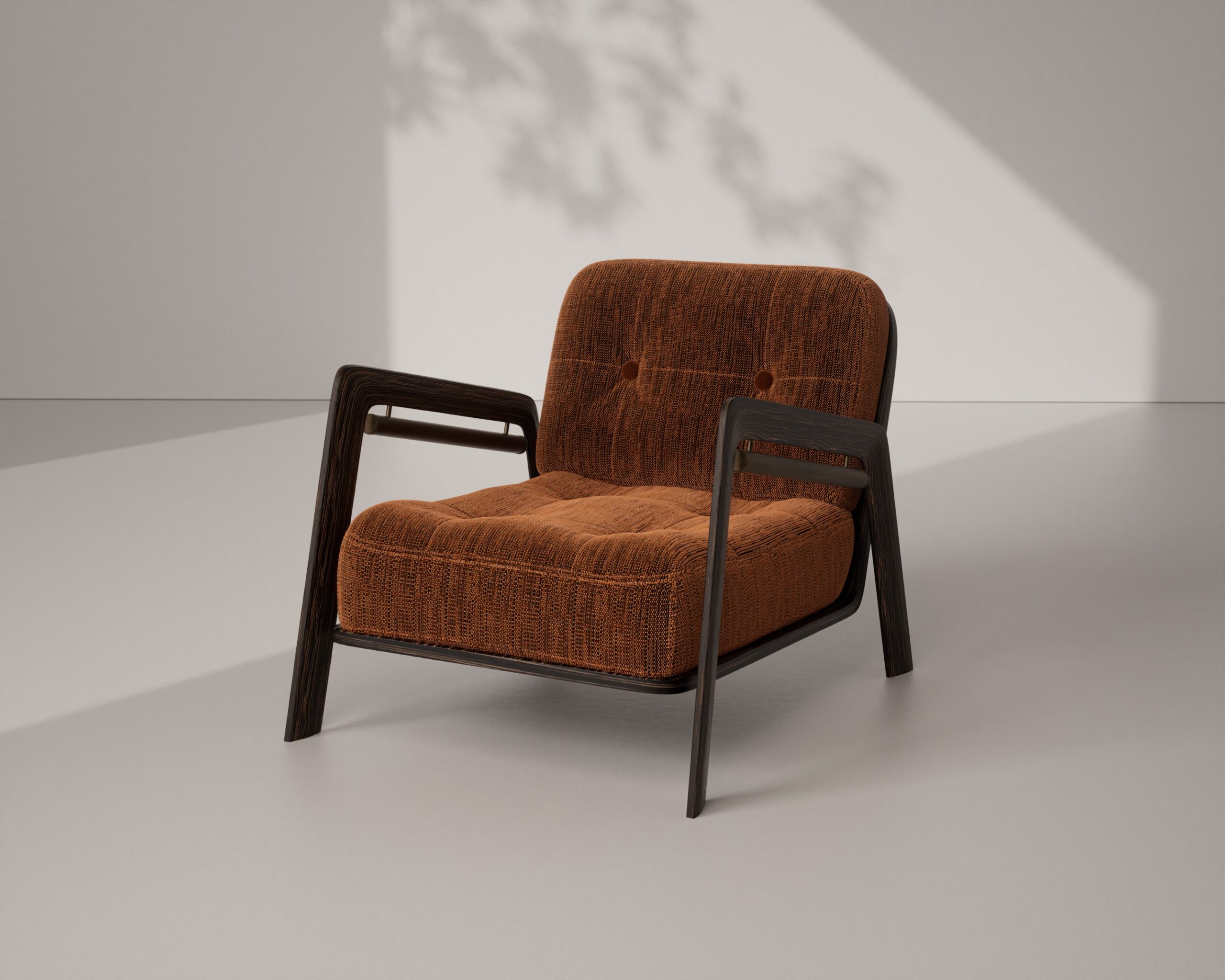 The ALVIAN chair is a refined expression of mid-century modern design tailored for contemporary comfort. Its structured, angular wooden frame features a distinctive open-arm silhouette, accented by a subtle brass rod detail that adds a touch of industrial elegance. The plush seat and back are upholstered in a premium cream pebbled leather, softened by classic button tufting that creates a welcoming, tactile surface against the clean lines of the dark wood.