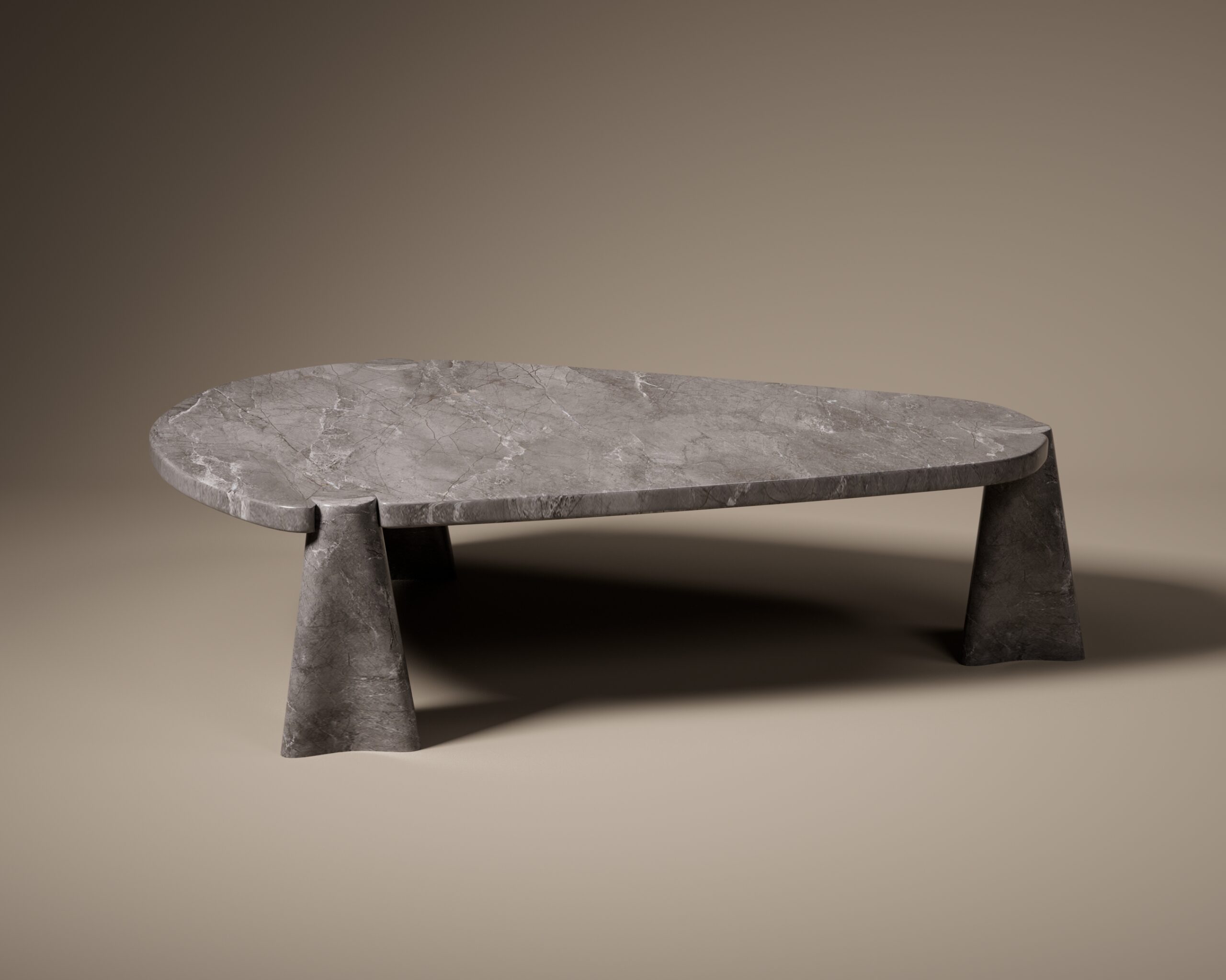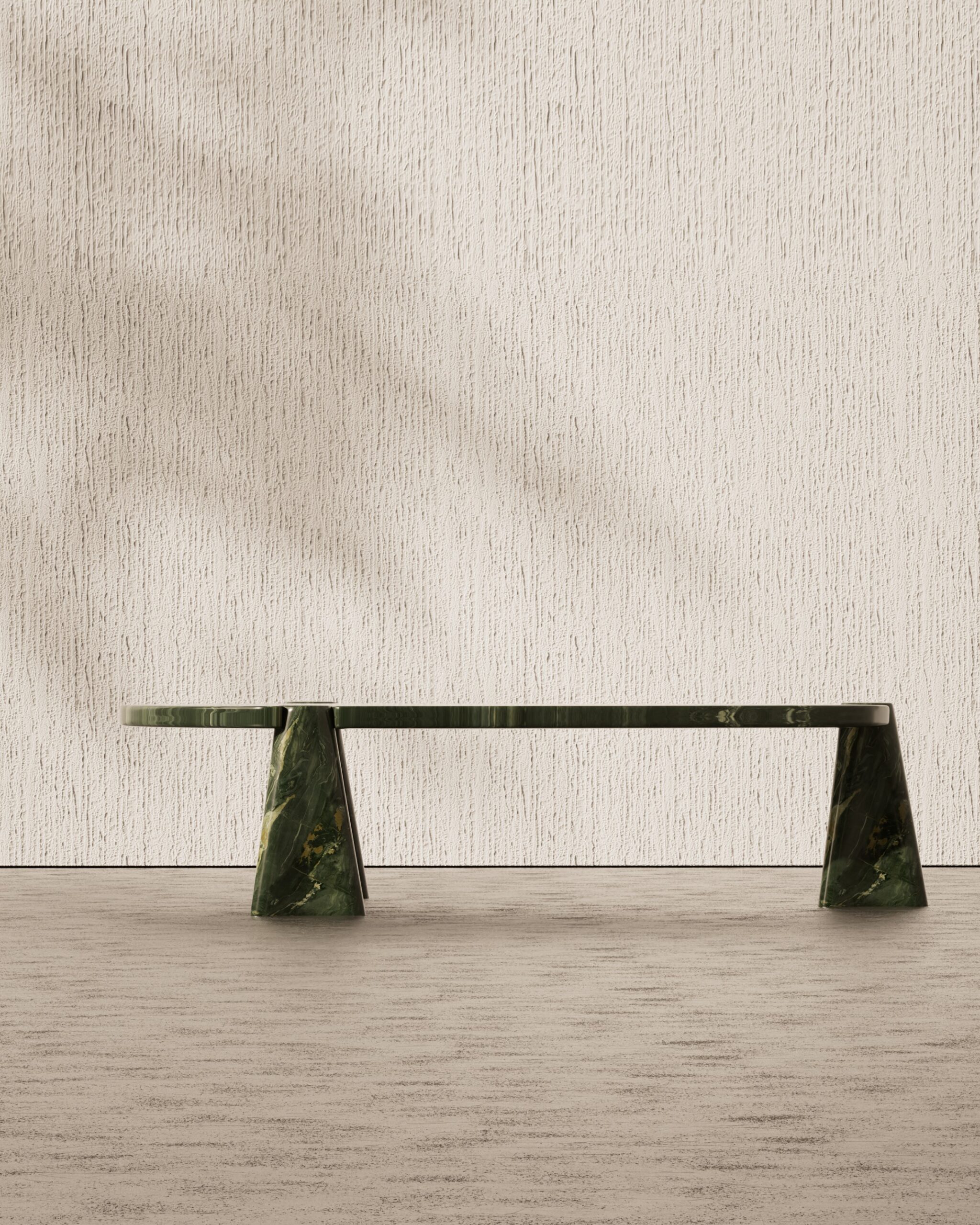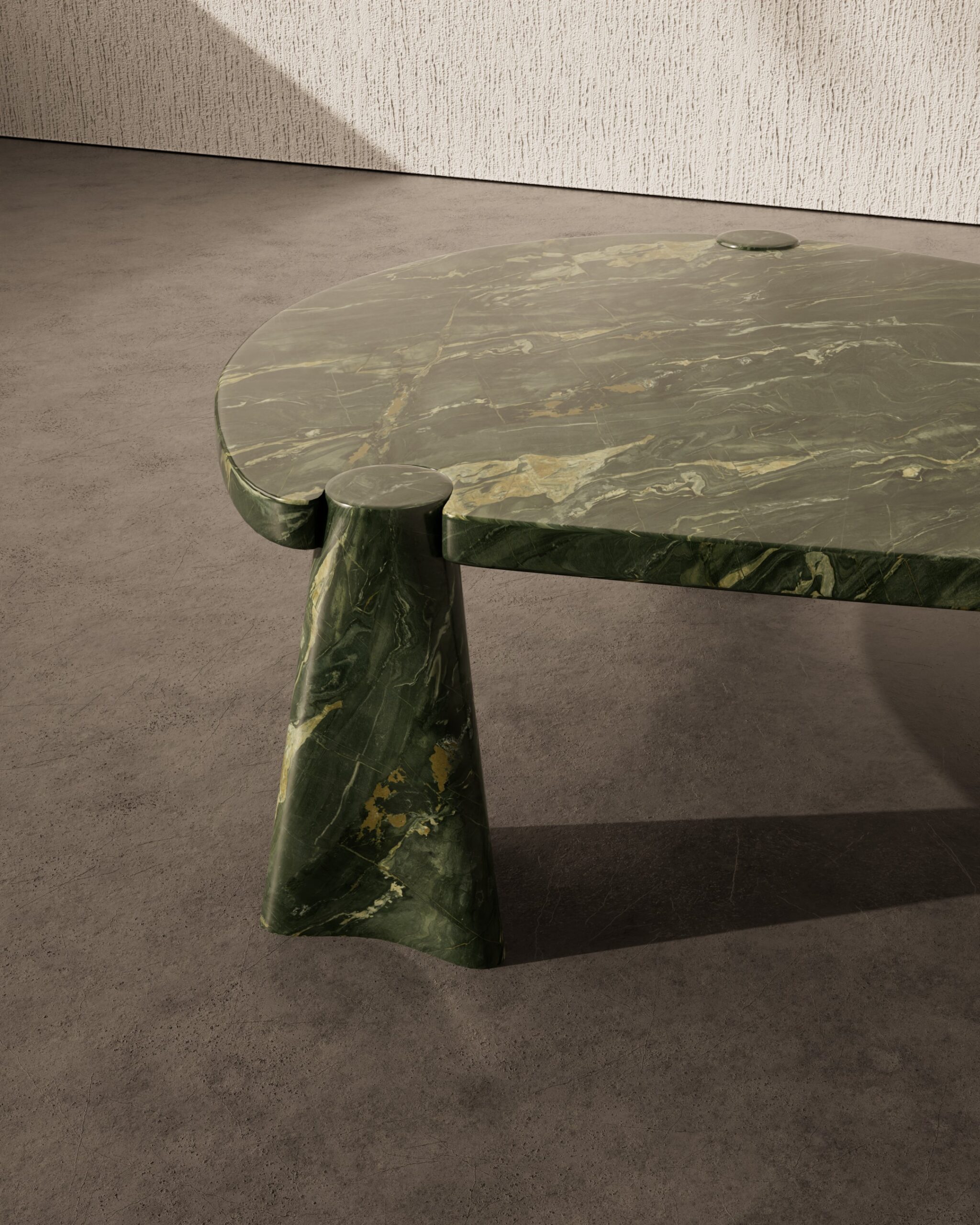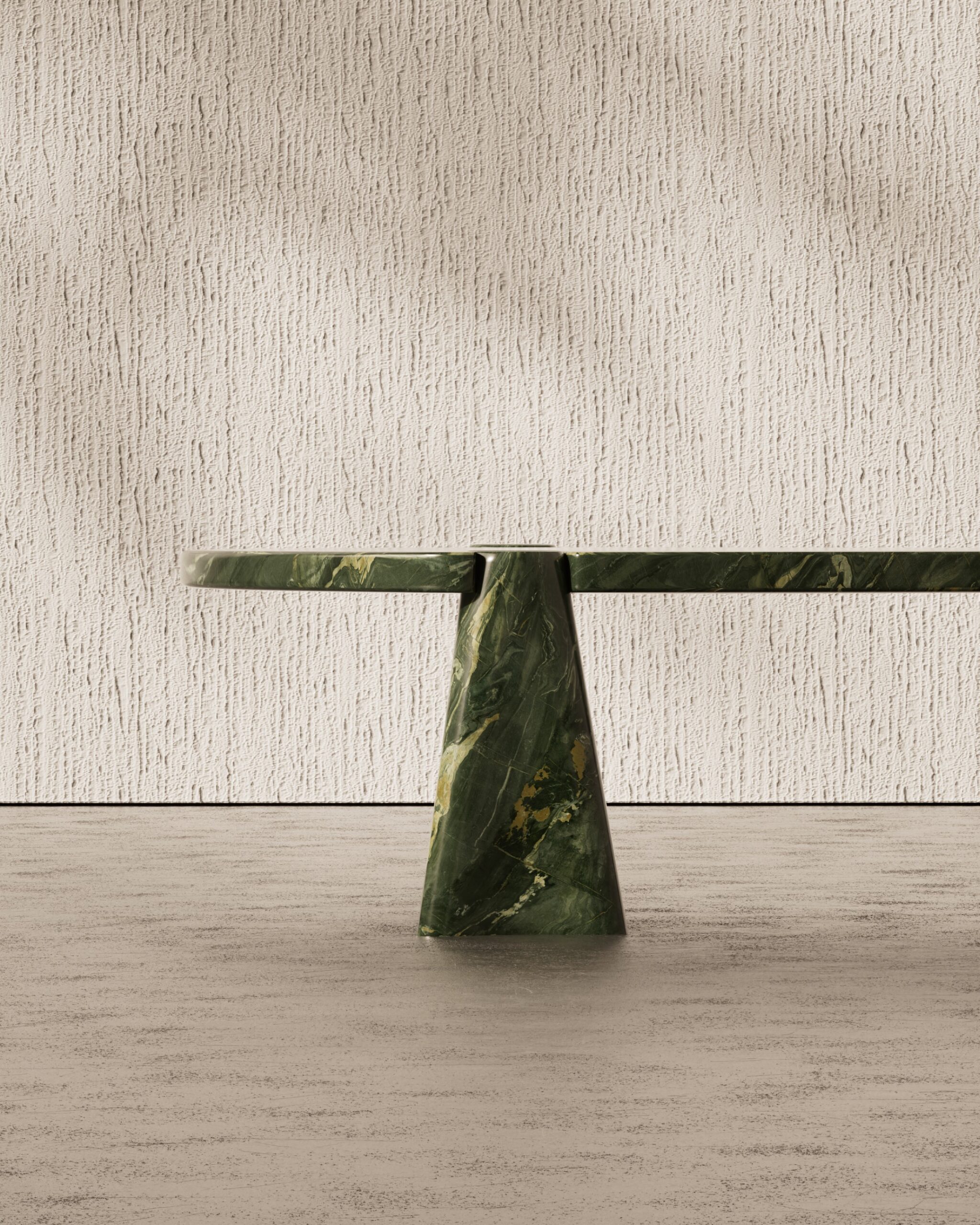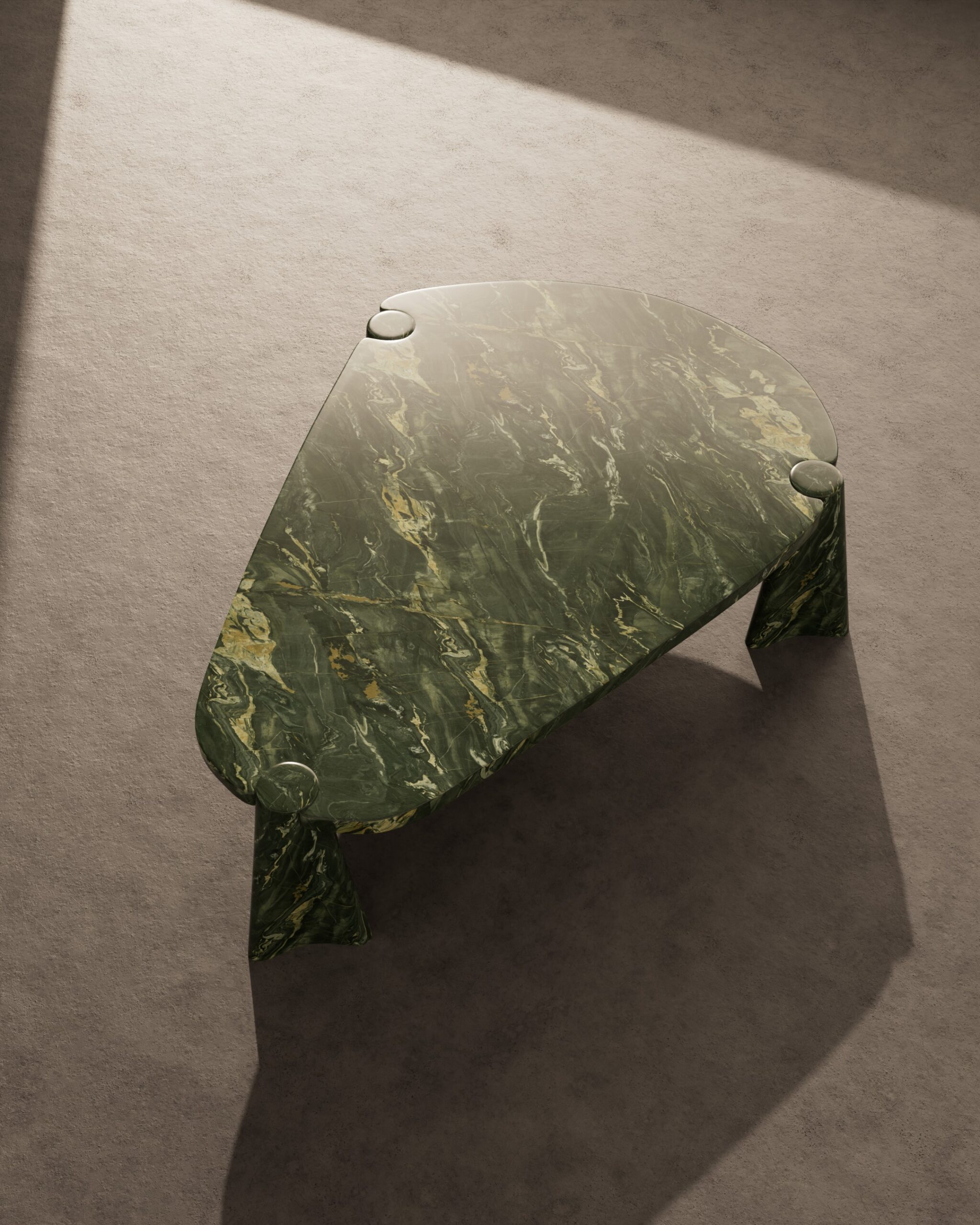 The ANCHOR center table is a study in monolithic presence and organic geometry. Part of our Design Studio Collection, the piece is characterized by its bold, asymmetrical teardrop silhouette, expertly carved from a singular forest green marble rich with dramatic gold veining. The design is punctuated by three substantial conical pedestals that are seamlessly integrated into the tabletop, creating flush-mounted stone circular details on the surface that balance the table’s heavy, architectural weight with a fluid and continuous material narrative.
