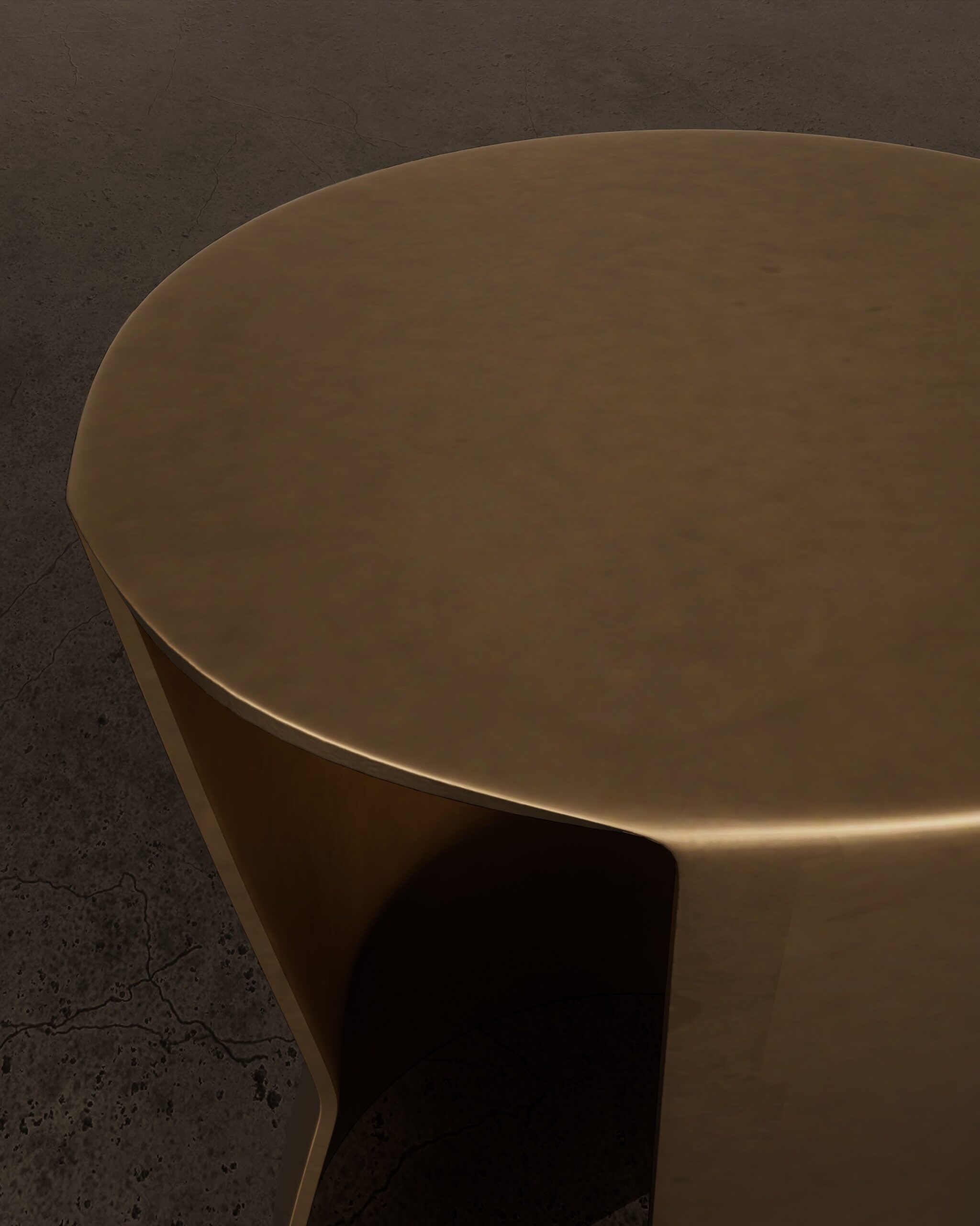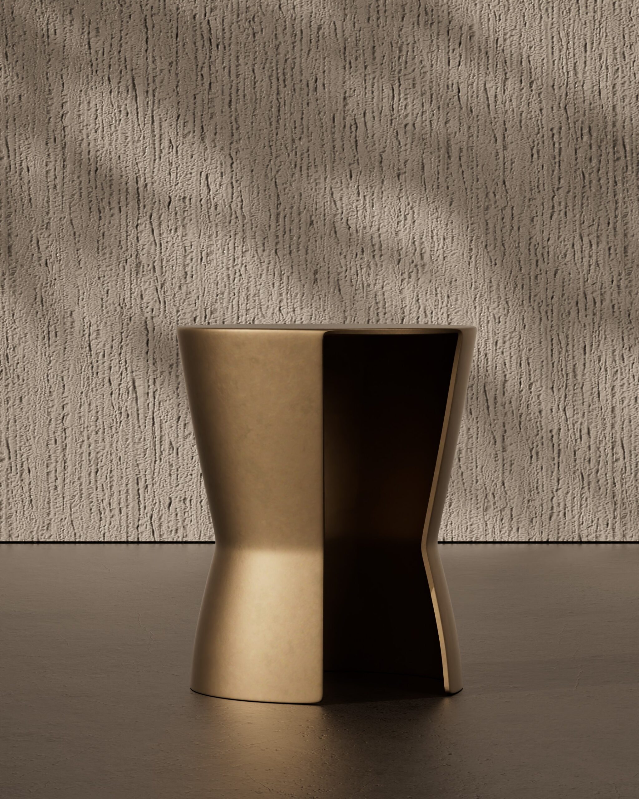 The APERTURE side table is a study in negative space and monolithic geometry. Part of our Design Studio Collection, the piece is characterized by its fluid, hourglass-like form that transitions from a wide circular base to a slender “waist” before expanding again into an integrated top surface. The design’s narrative is defined by its namesake detail—a clean, vertical slice removed from one side of the volume to reveal a hollow interior. Finished entirely in a rich aged bronze, the table displays a soft, hand-applied patina that captures light across its continuous curves. The APERTURE balances a heavy, sculptural presence with a sense of architectural lightness, making it a sophisticated accent for contemporary living spaces and galleries.