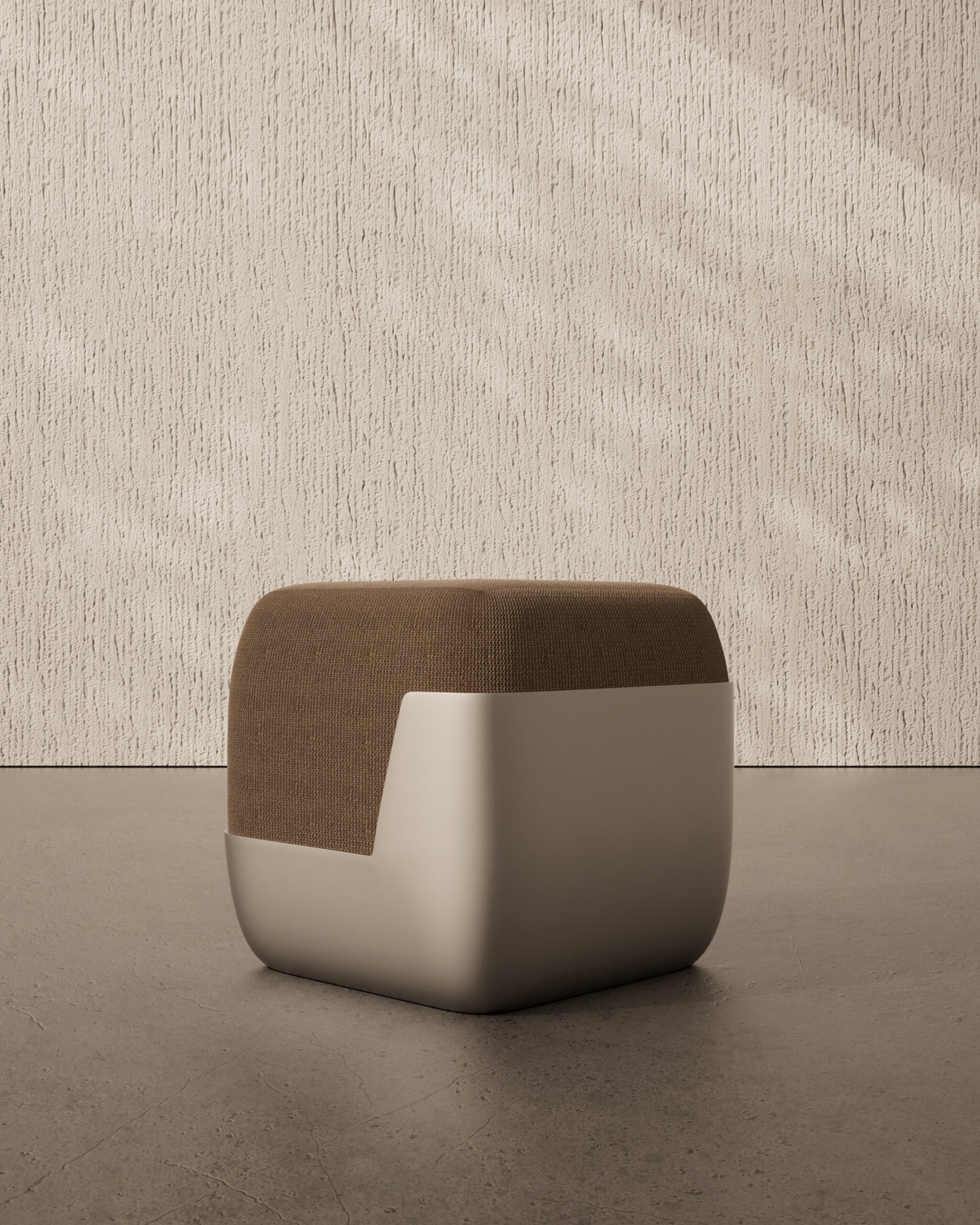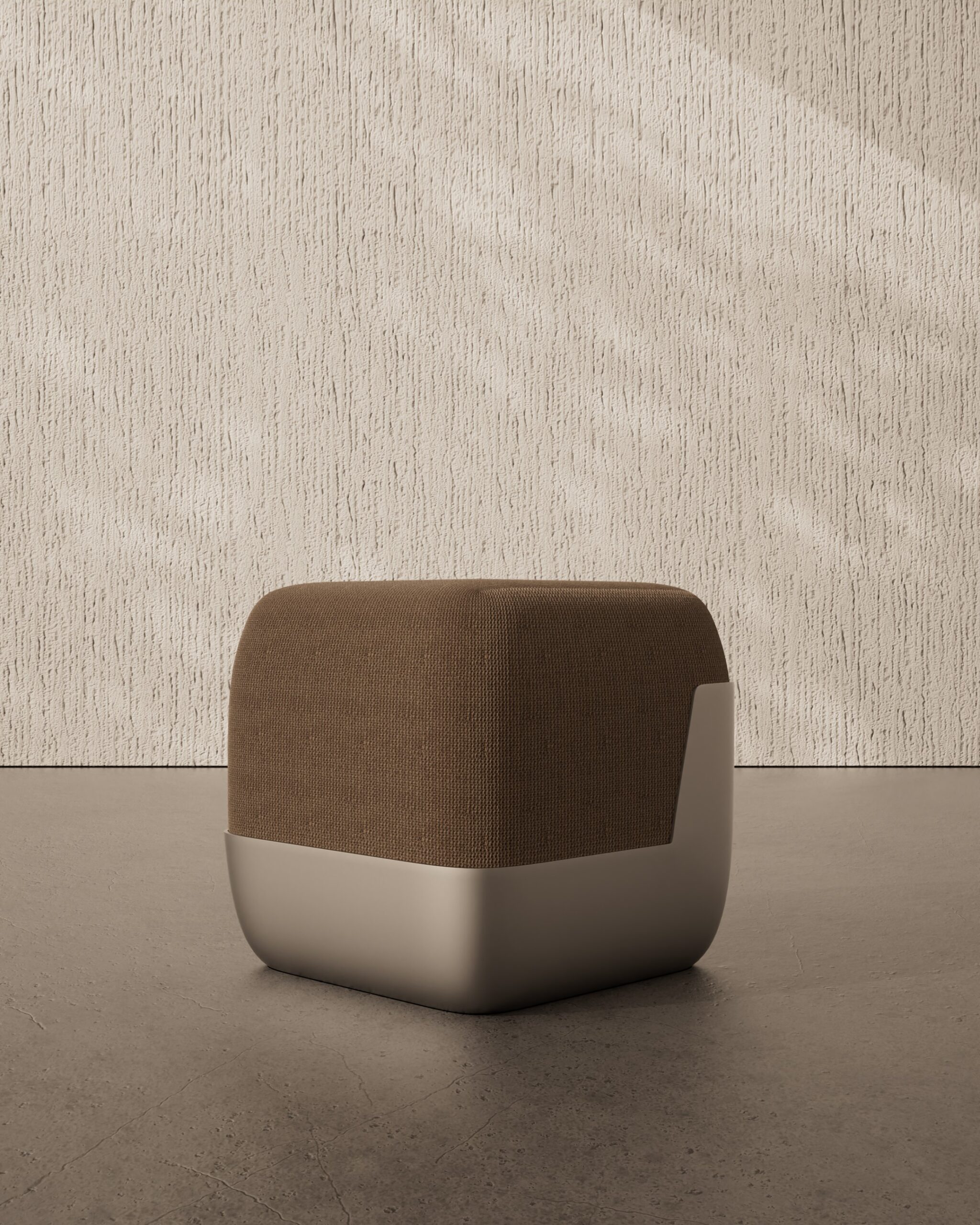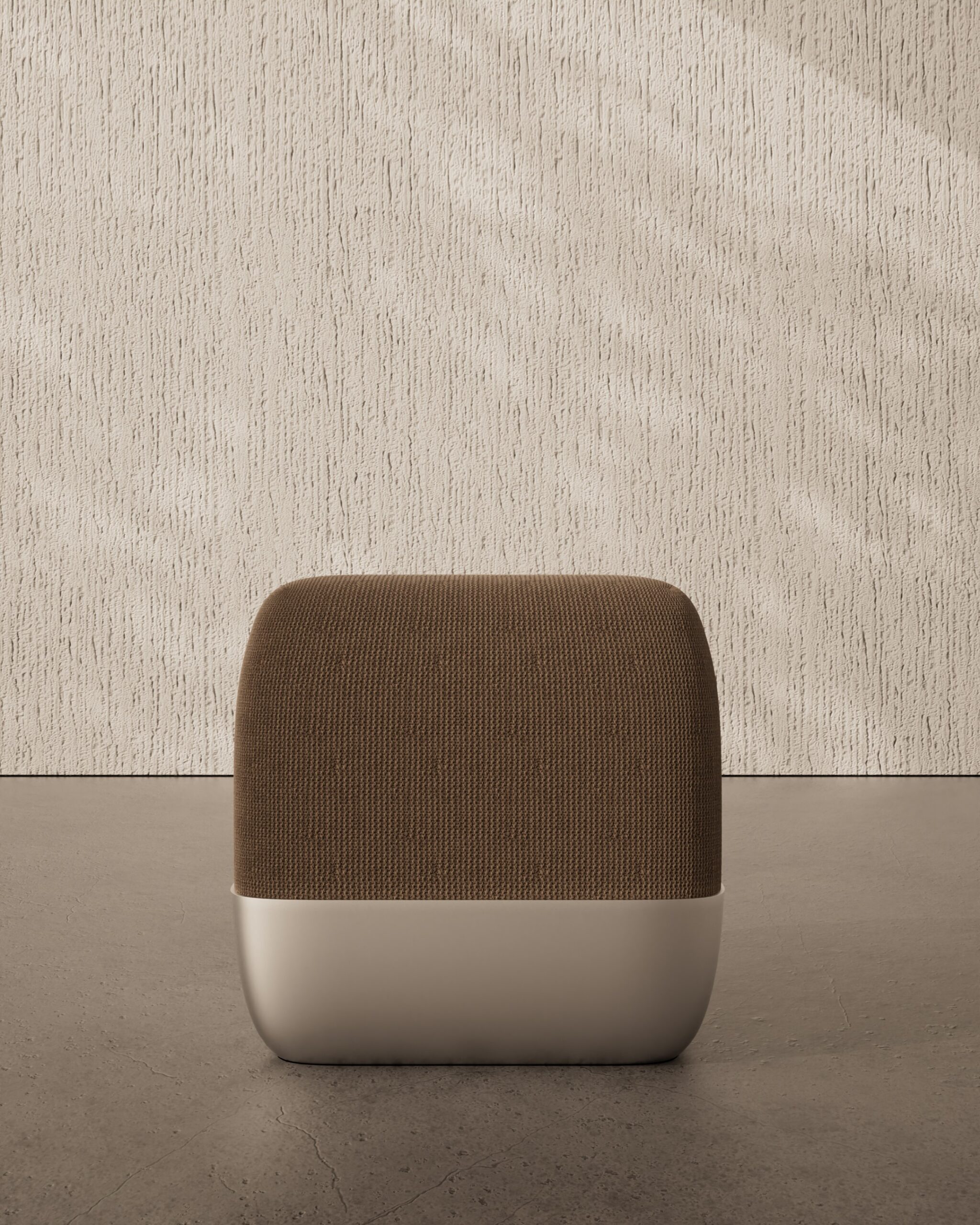 The ARBOR pouf is an exploration of material contrast and protective geometry. Part of our Design Studio Collection, the piece features a substantial, rounded cubic core upholstered in a warm, earth-toned woven textile. This soft volume is partially enveloped by a heavy, matte champagne metallic base that rises in an asymmetrical, architectural silhouette to “cradle” the seat. The design balances the visual weight of the metal with the tactile comfort of the upholstery, creating a versatile, sculptural accent that functions as both additional seating and a grounding material statement.