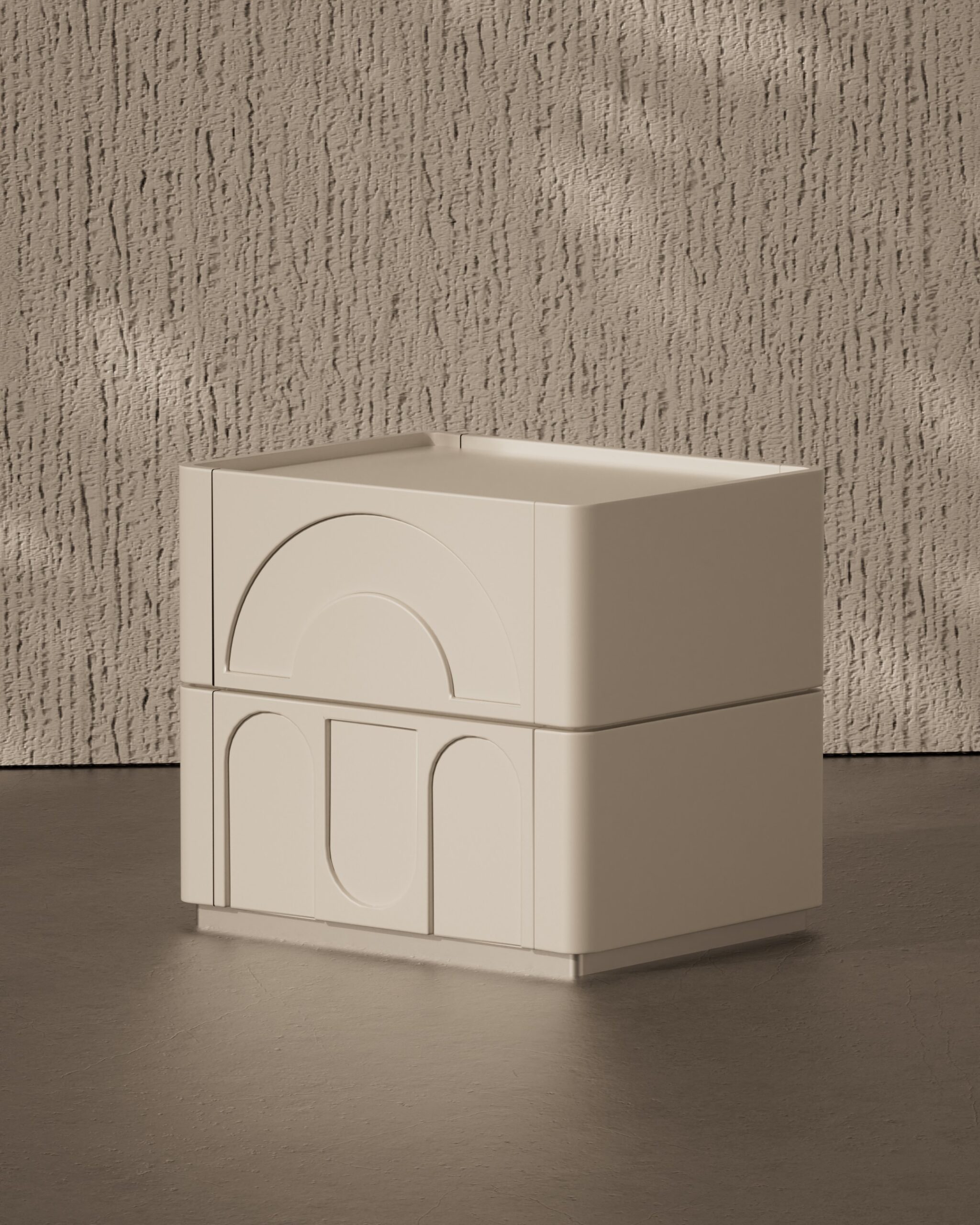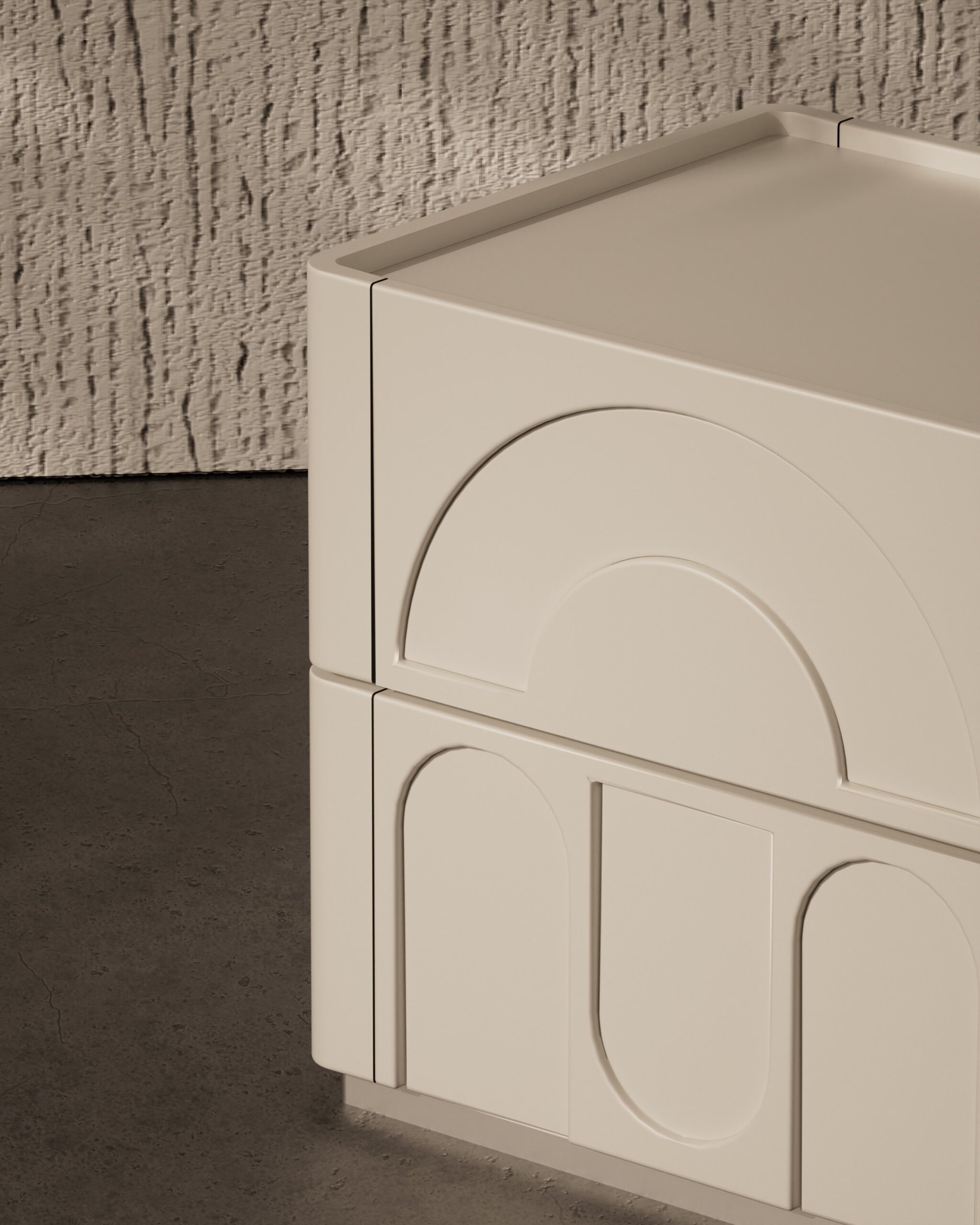 The ARC bedside table is a sculptural piece defined by its interplay of light and geometric depth. Finished in a smooth, creamy satin lacquer, the unit features a distinctive relief pattern carved across the drawer fronts, creating a continuous, stylized arch motif that gives the piece its name. Its soft, rounded corners and seamless, handle-less design enhance the modern, monolithic aesthetic, allowing the shadow lines of the carved details to take center stage.