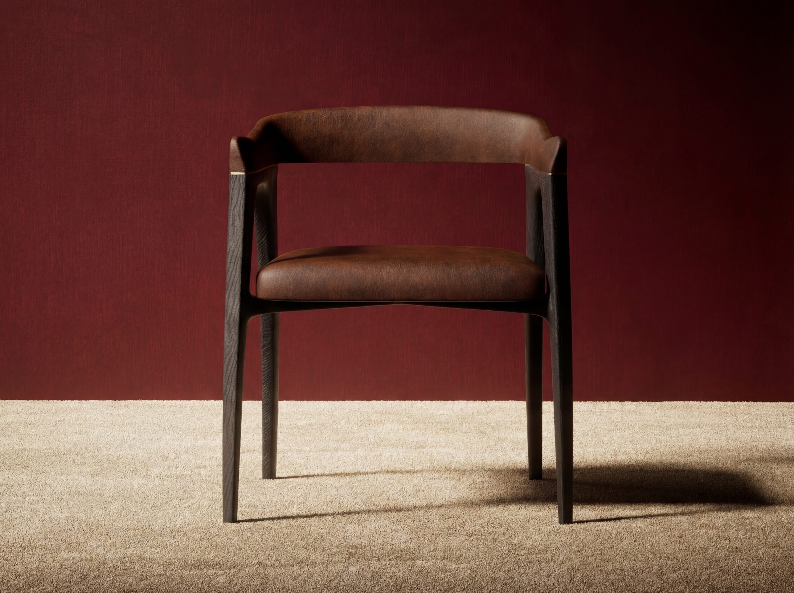 The ARCA dining chair is a study in sculptural minimalism and material harmony. Now part of our exclusive Collectable Collection, the piece is defined by its architectural charcoal black ash frame, featuring legs that taper elegantly toward the floor to create a light yet grounded silhouette. The visual narrative is driven by the fluid, wrap-around backrest upholstered in cognac brown leather, which provides a supple, organic contrast to the rigid timber structure. A singular, refined brass inlay marks the transition between the wood and leather on the arms, adding a touch of metallic precision. The ARCA balances mid-century influences with contemporary craft, offering a sophisticated and ergonomic seating solution for high-end residential and hospitality environments.