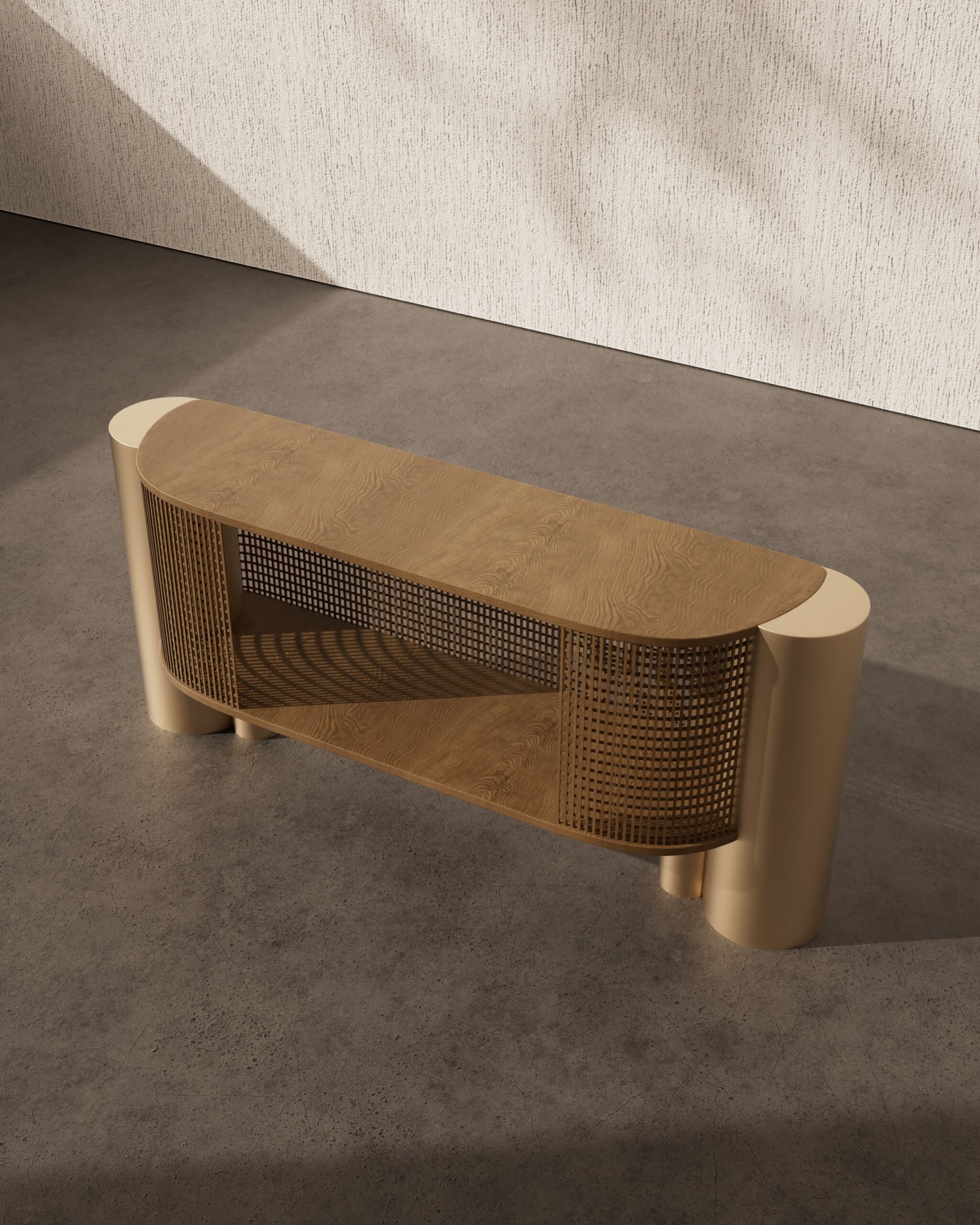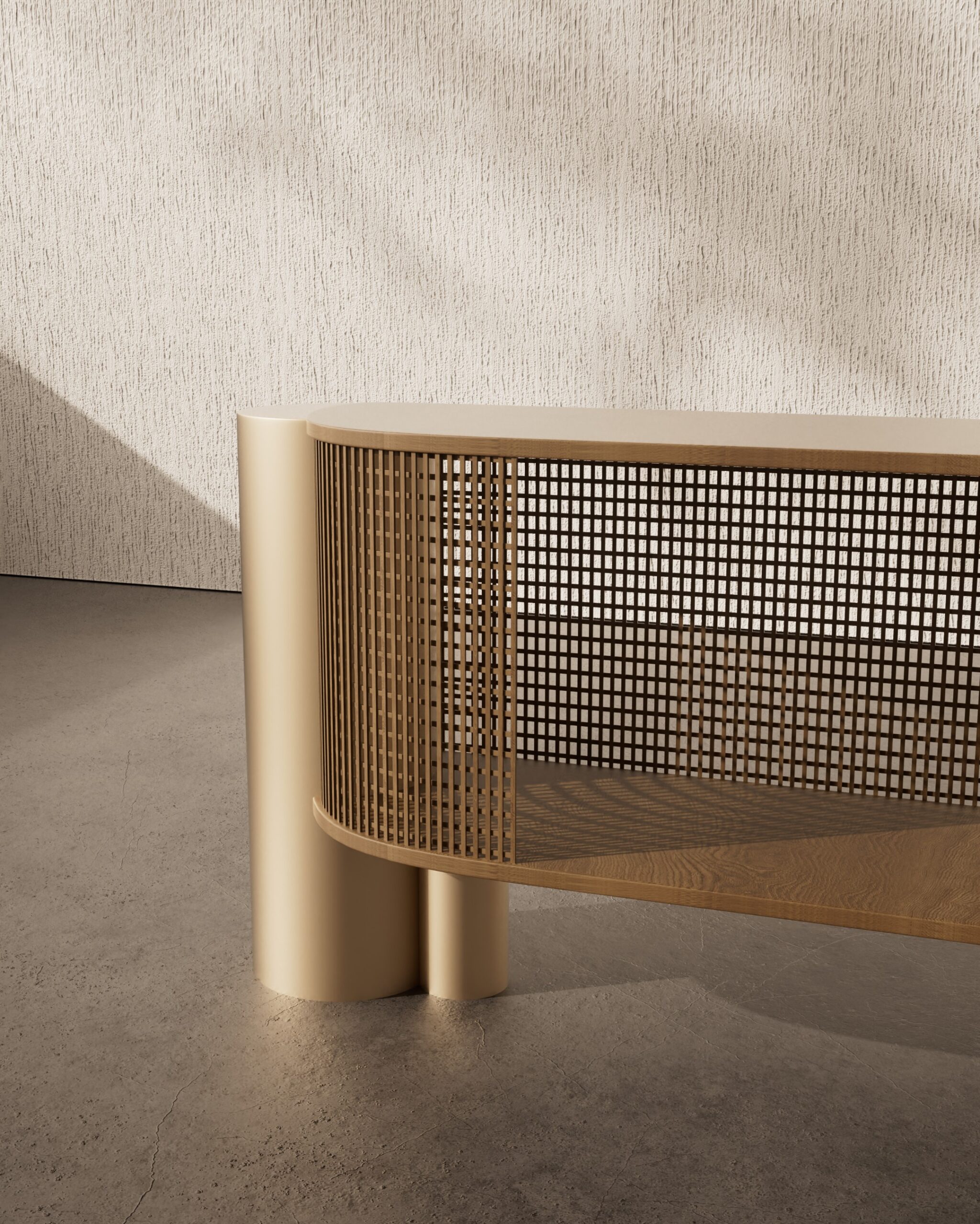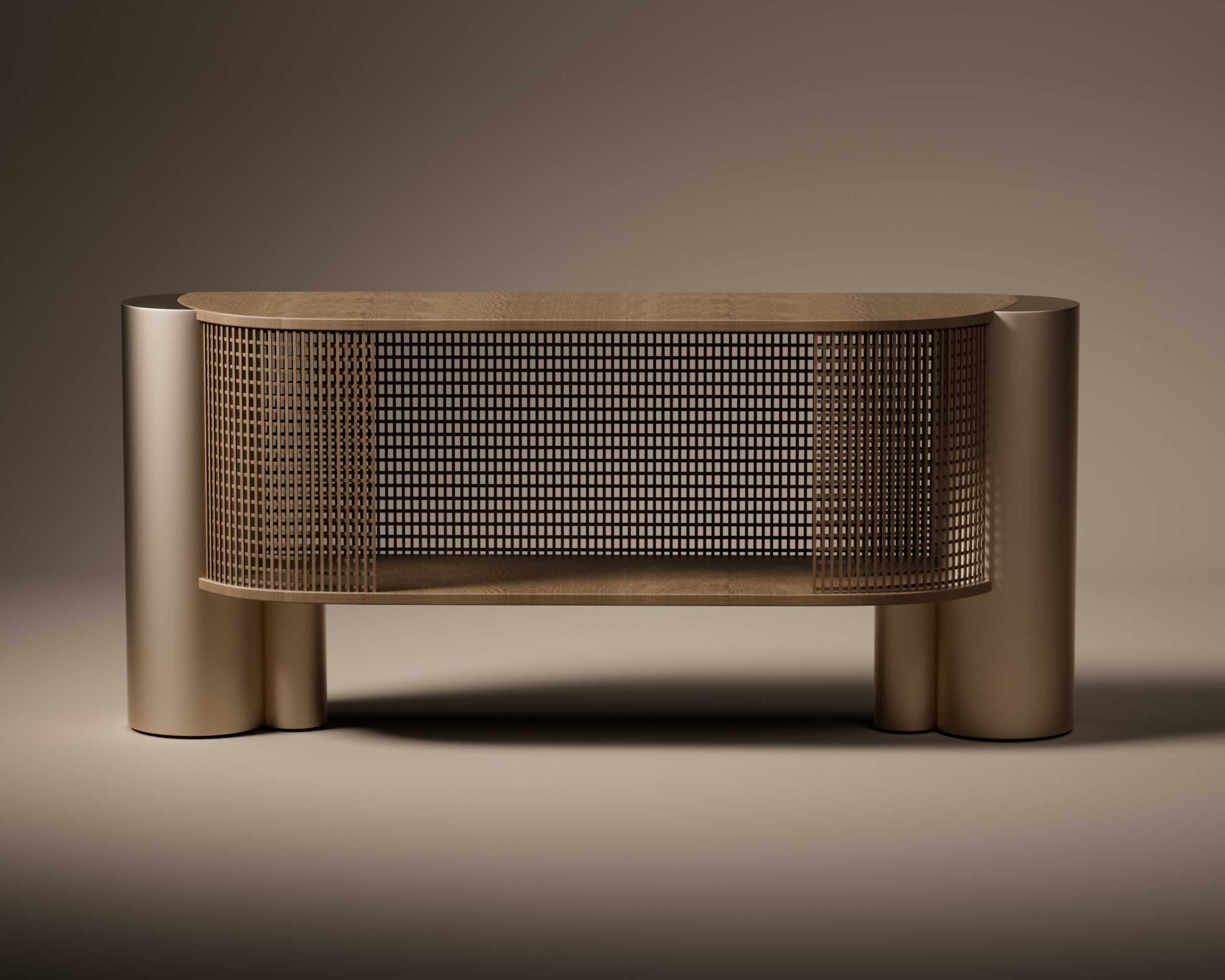 The ARCO sideboard is a study in architectural transparency and material contrast. Part of our Design Studio Collection, the piece is defined by its elegant semi-oval form, featuring a top surface and internal shelving crafted from solid natural oak with a clear, vertical grain. The wooden volume is partially encased in a delicate, wrap-around matte champagne metallic grid, which provides a rhythmic “mesh” texture while maintaining visual lightness. This intricate assembly is anchored by two substantial, asymmetrical cylindrical pedestals in a matching champagne finish, offering a grounded and modern foundation. The ARCO balances the traditional warmth of oak with a sophisticated, industrial-inspired shroud, creating a refined focal point for contemporary dining and living spaces.