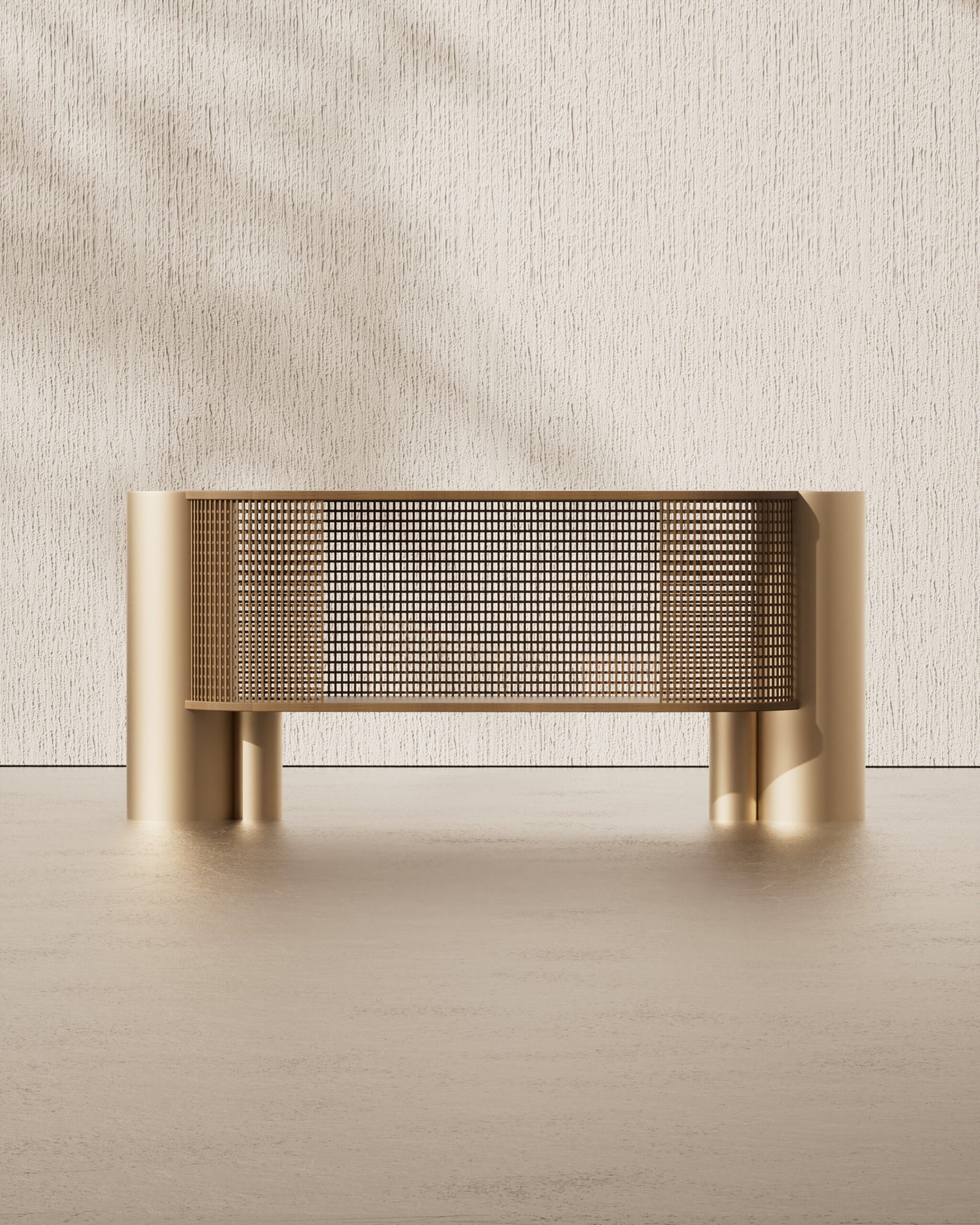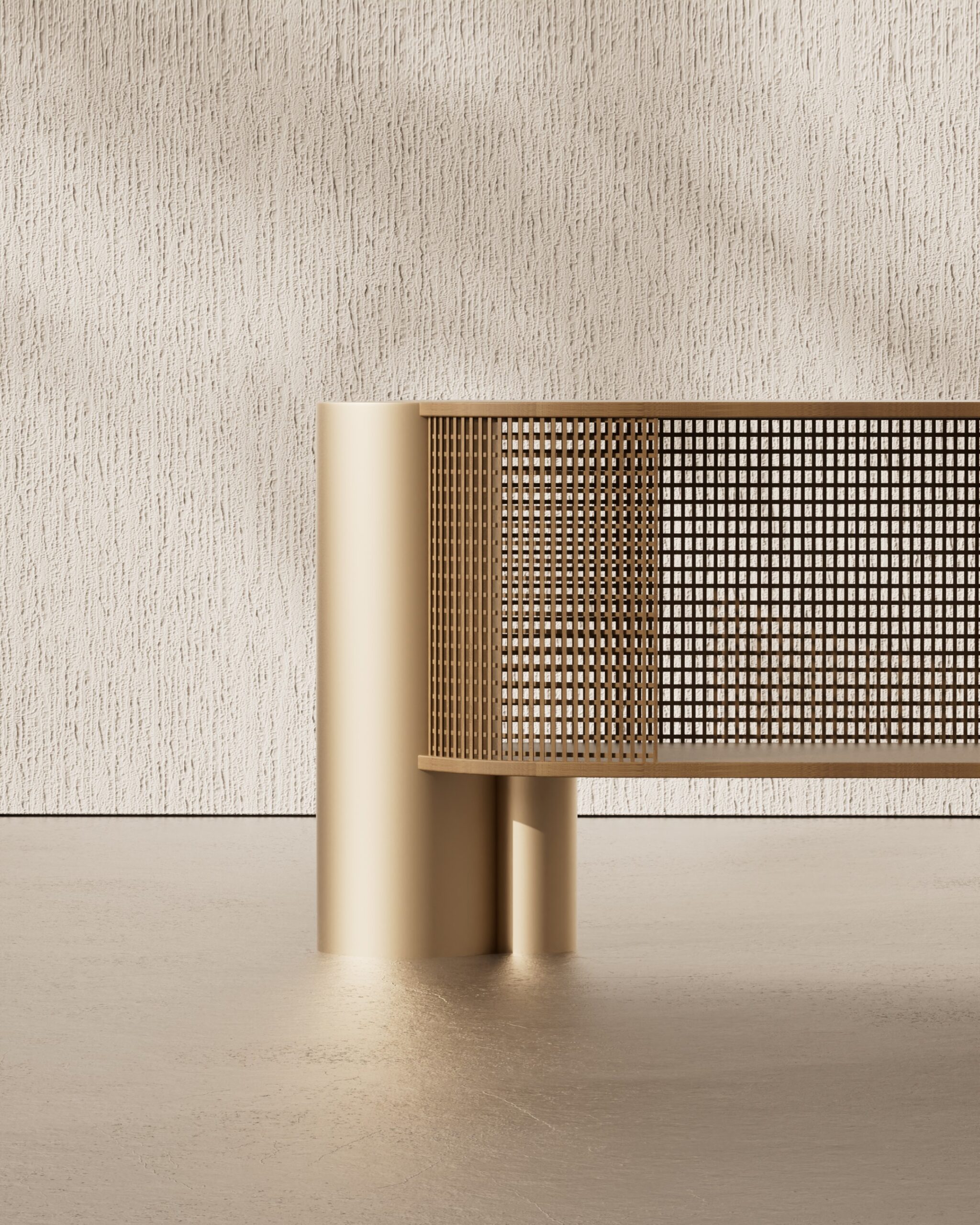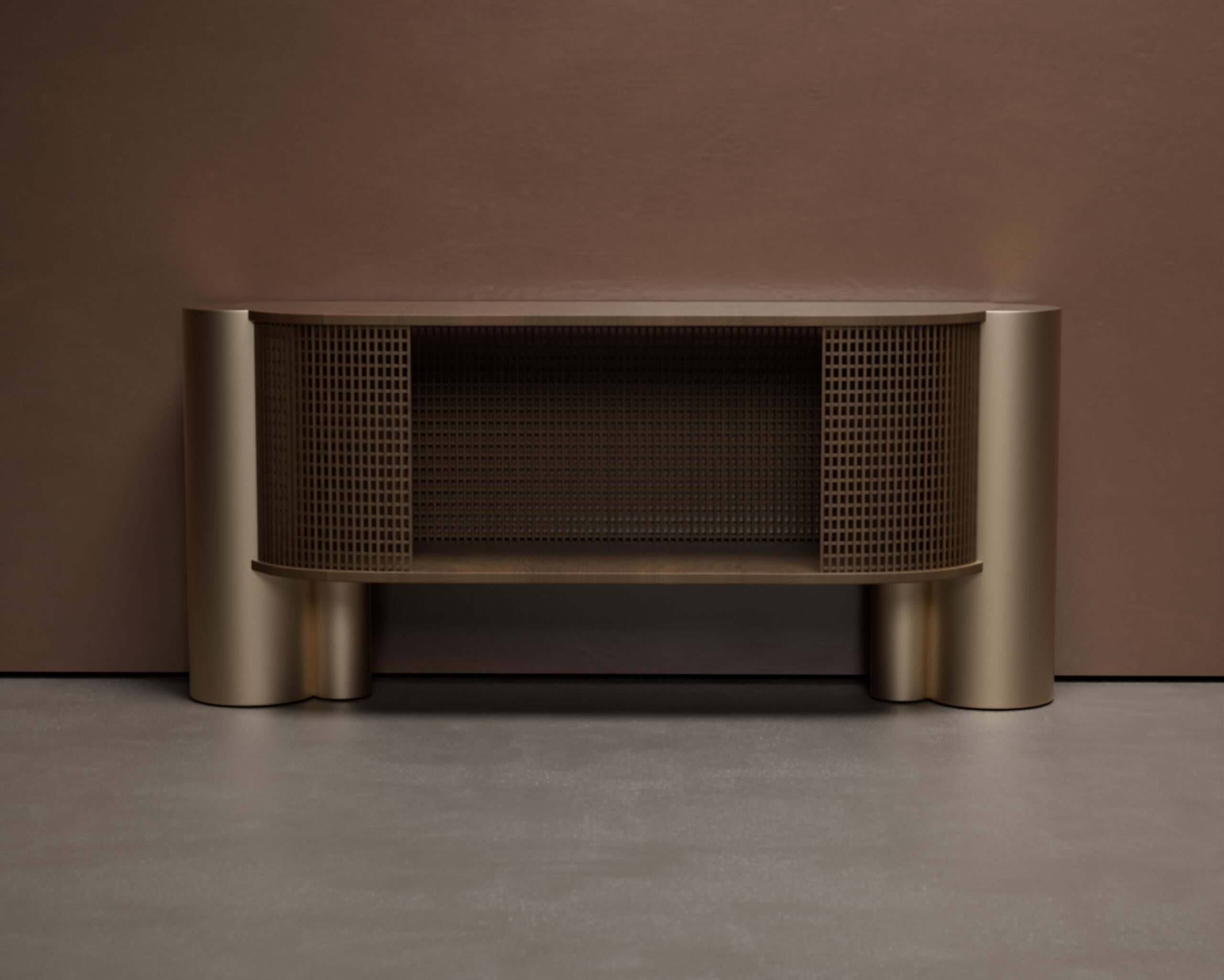 The ARCO sideboard is a study in architectural transparency and material contrast. Part of our Design Studio Collection, the piece is defined by its elegant semi-oval form, featuring a top surface and internal shelving crafted from solid natural oak with a clear, vertical grain. The wooden volume is partially encased in a delicate, wrap-around matte champagne metallic grid, which provides a rhythmic “mesh” texture while maintaining visual lightness. This intricate assembly is anchored by two substantial, asymmetrical cylindrical pedestals in a matching champagne finish, offering a grounded and modern foundation. The ARCO balances the traditional warmth of oak with a sophisticated, industrial-inspired shroud, creating a refined focal point for contemporary dining and living spaces.