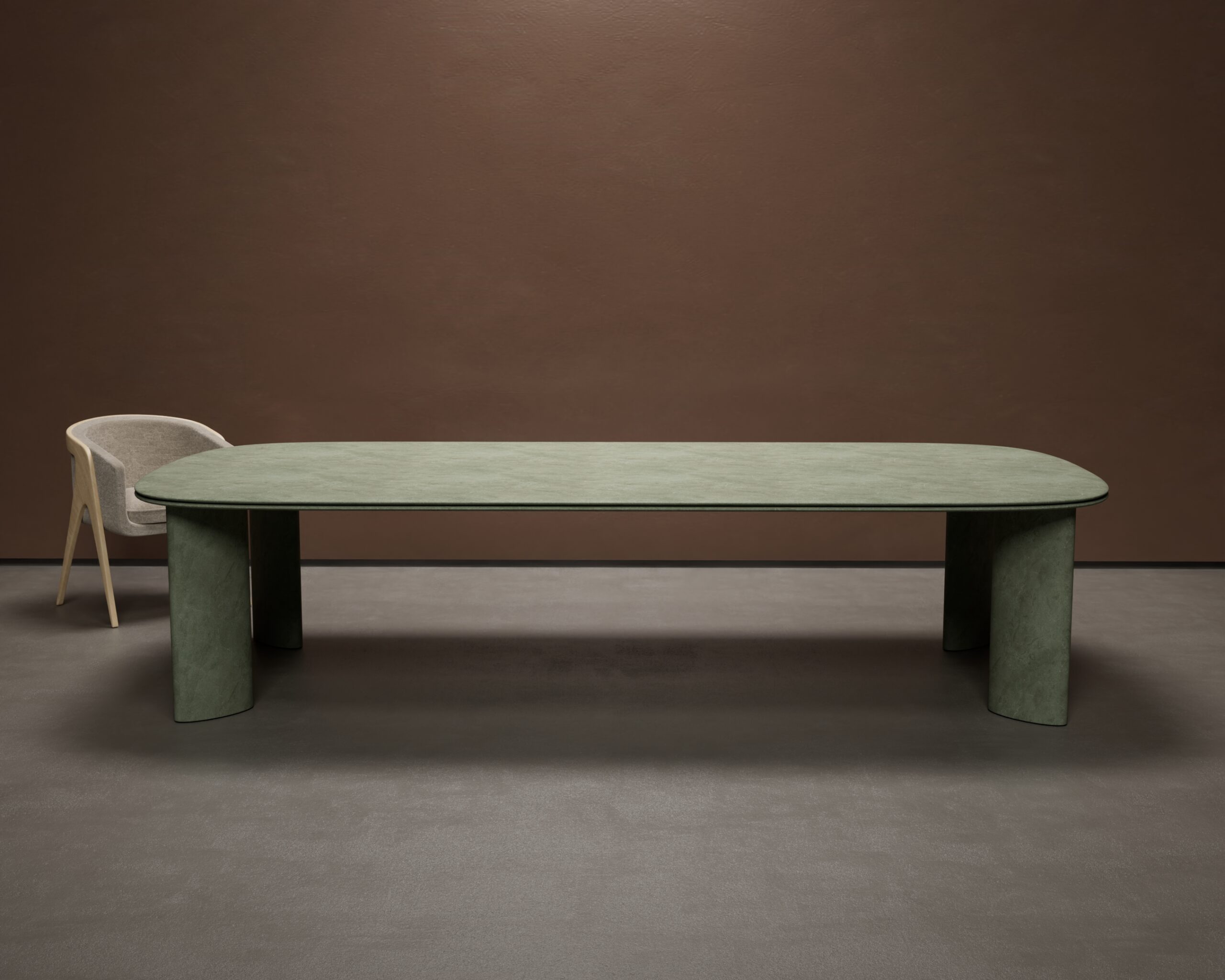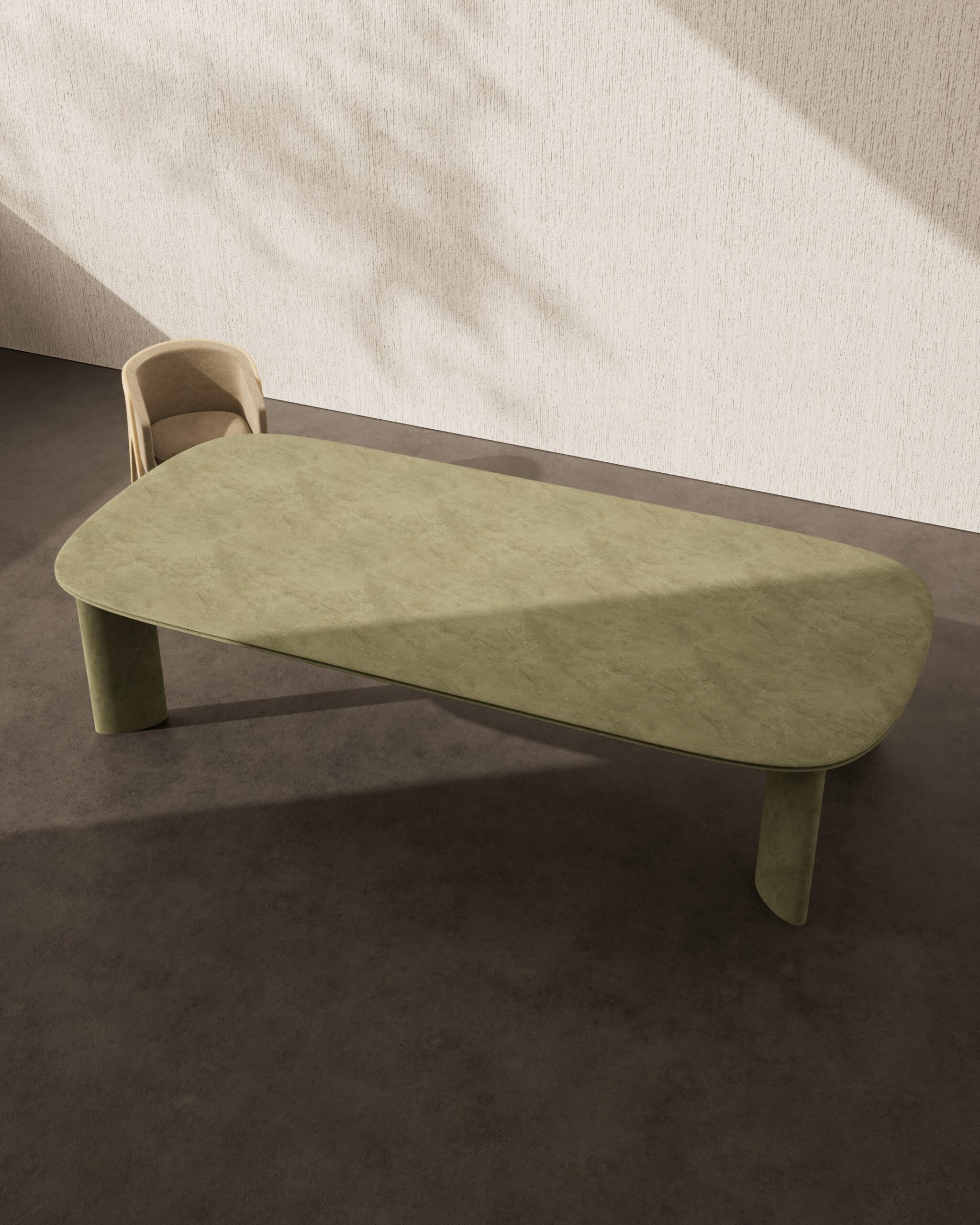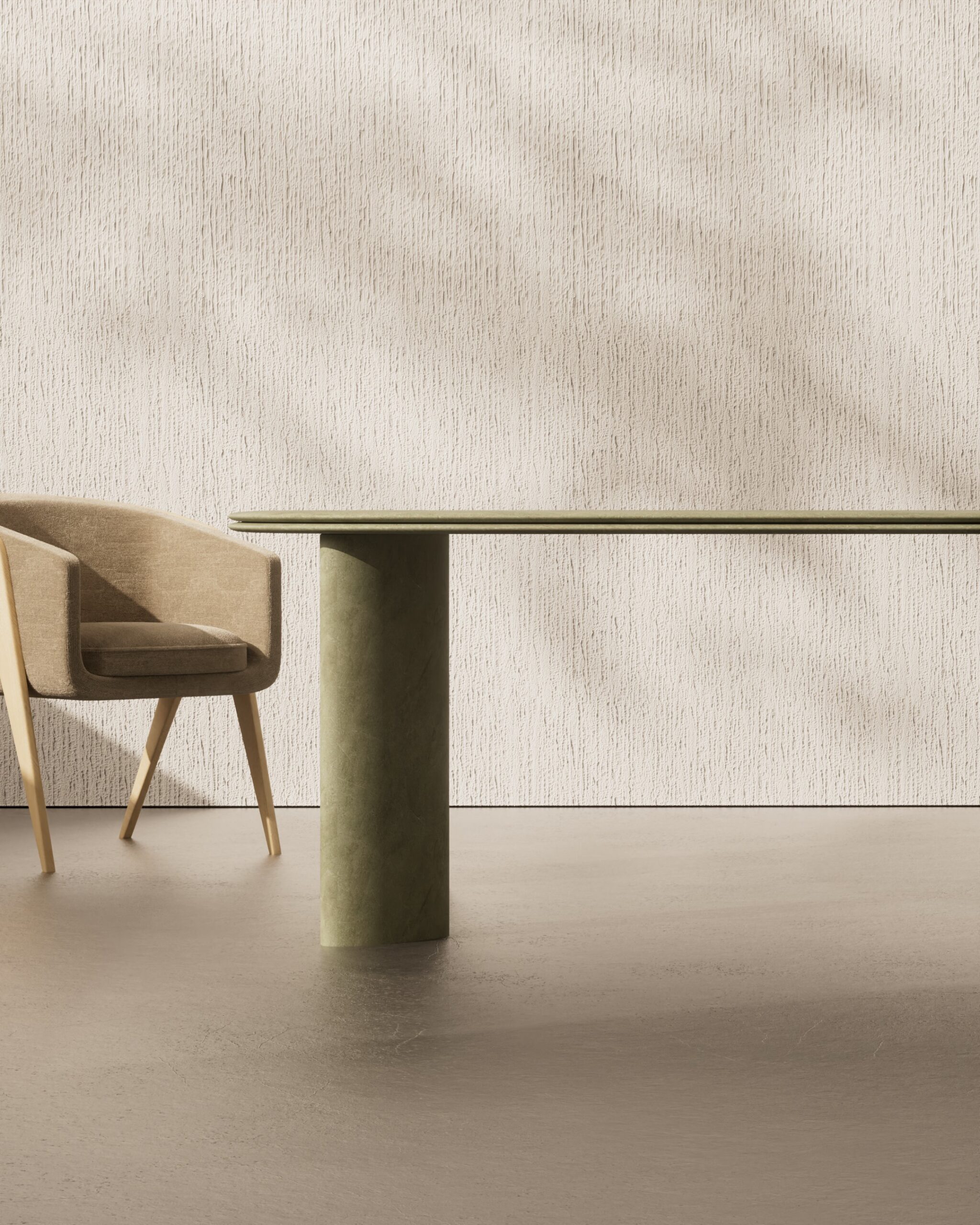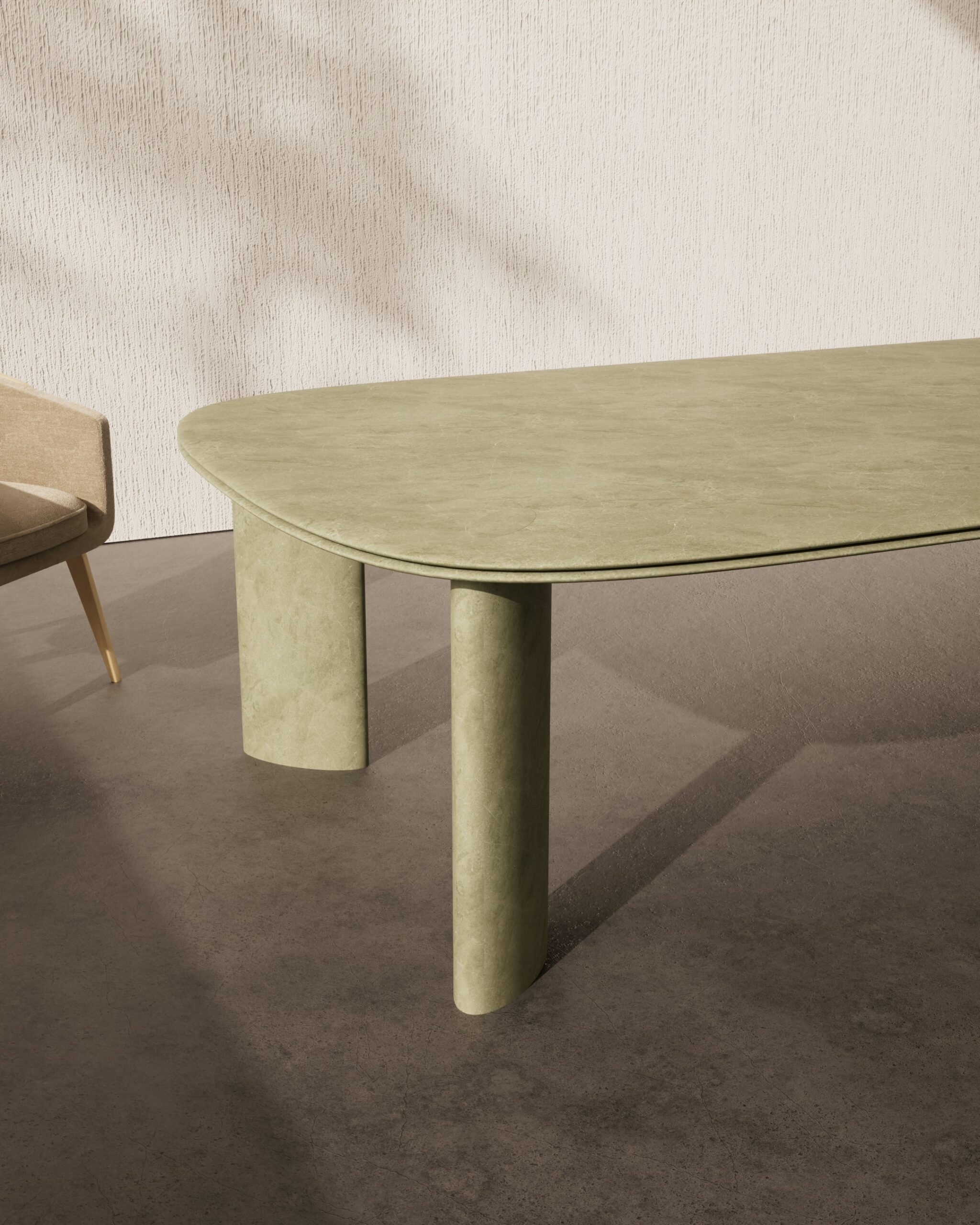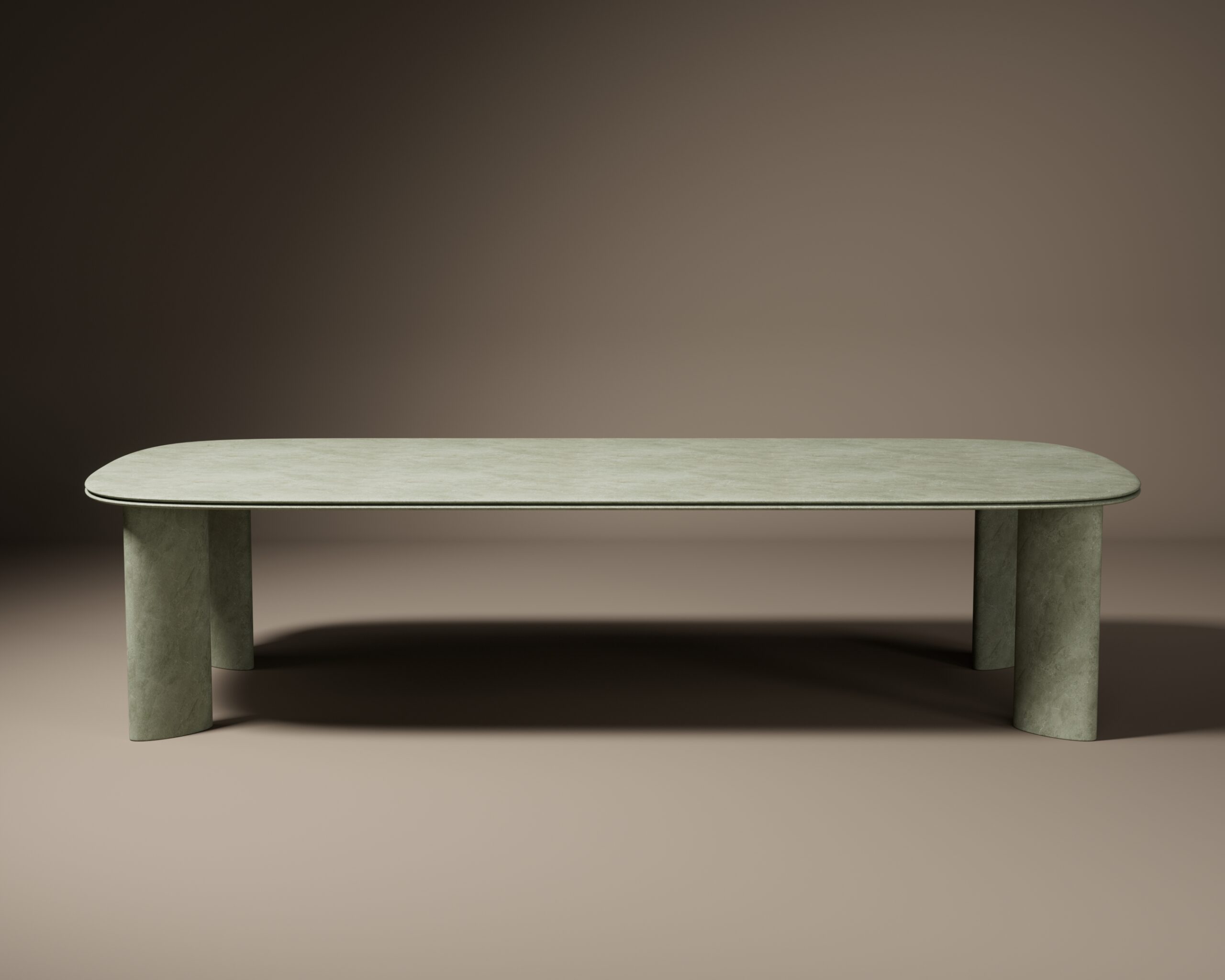 The AURELLA dining table is a study in monolithic stone craftsmanship and soft architectural scale. Carved from a singular honed sage green marble, the piece features an elongated racetrack top with a delicate, razor-thin beveled edge that highlights the natural beauty of the stone. The design is anchored by two monolithic marble pillar legs, whose perfectly rounded forms provide a grounded, serene foundation. The use of a single, continuous stone material emphasizes the purity of its silhouette, making it a tranquil and luxurious centerpiece for the modern dining room.