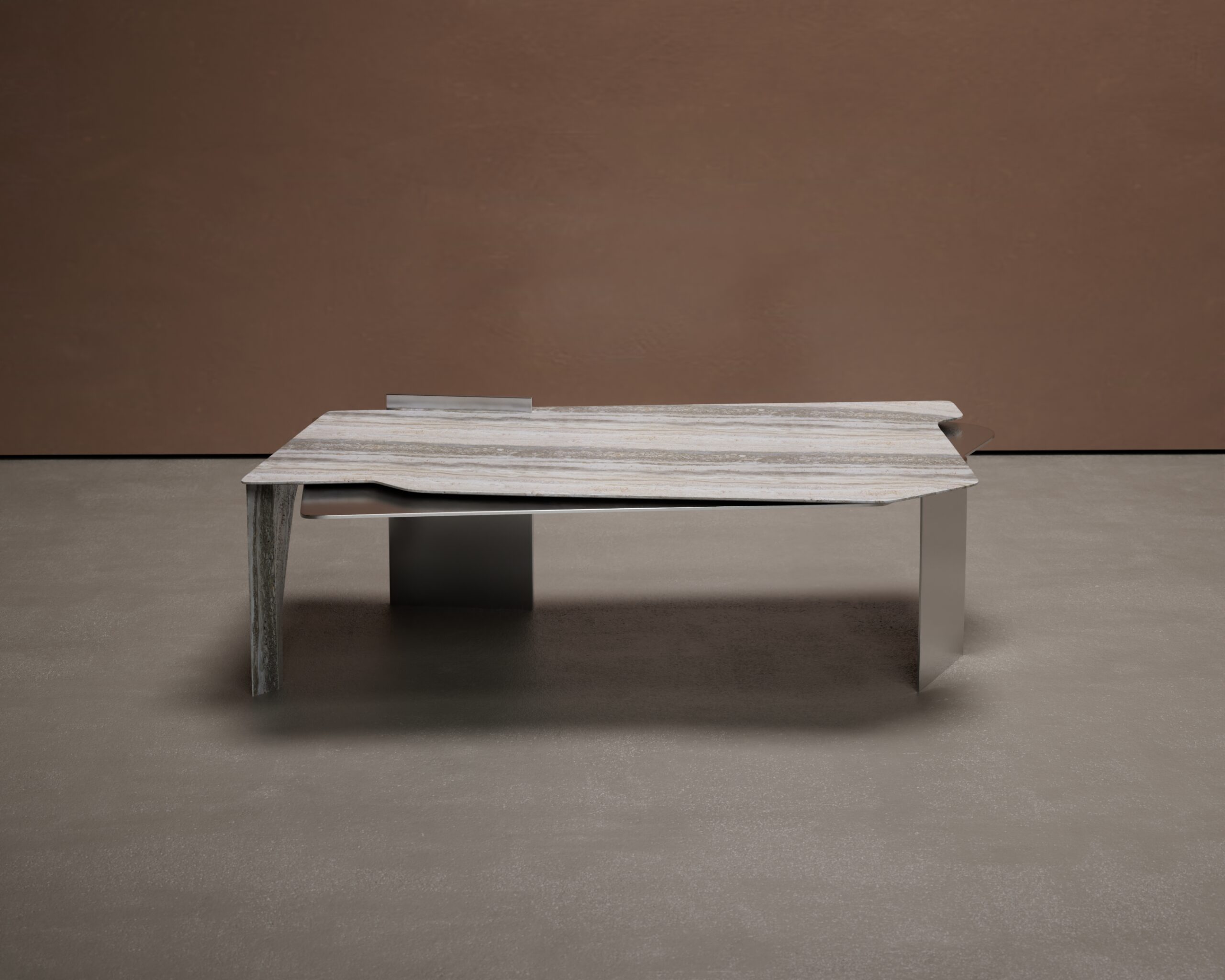 The AZURE center table is a study in geometric tension and architectural layering. Part of our Design Studio Collection, the piece features an expansive, low-profile cream travertine surface that appears to drift across a pair of contrasting, asymmetric supports—one in matching stone and the other a minimalist matte champagne plate. This composition is punctuated by a recessed satellite tier, creating a staggered horizontal landscape that balances heavy, monolithic volumes with the visual lightness of cantilevered planes.