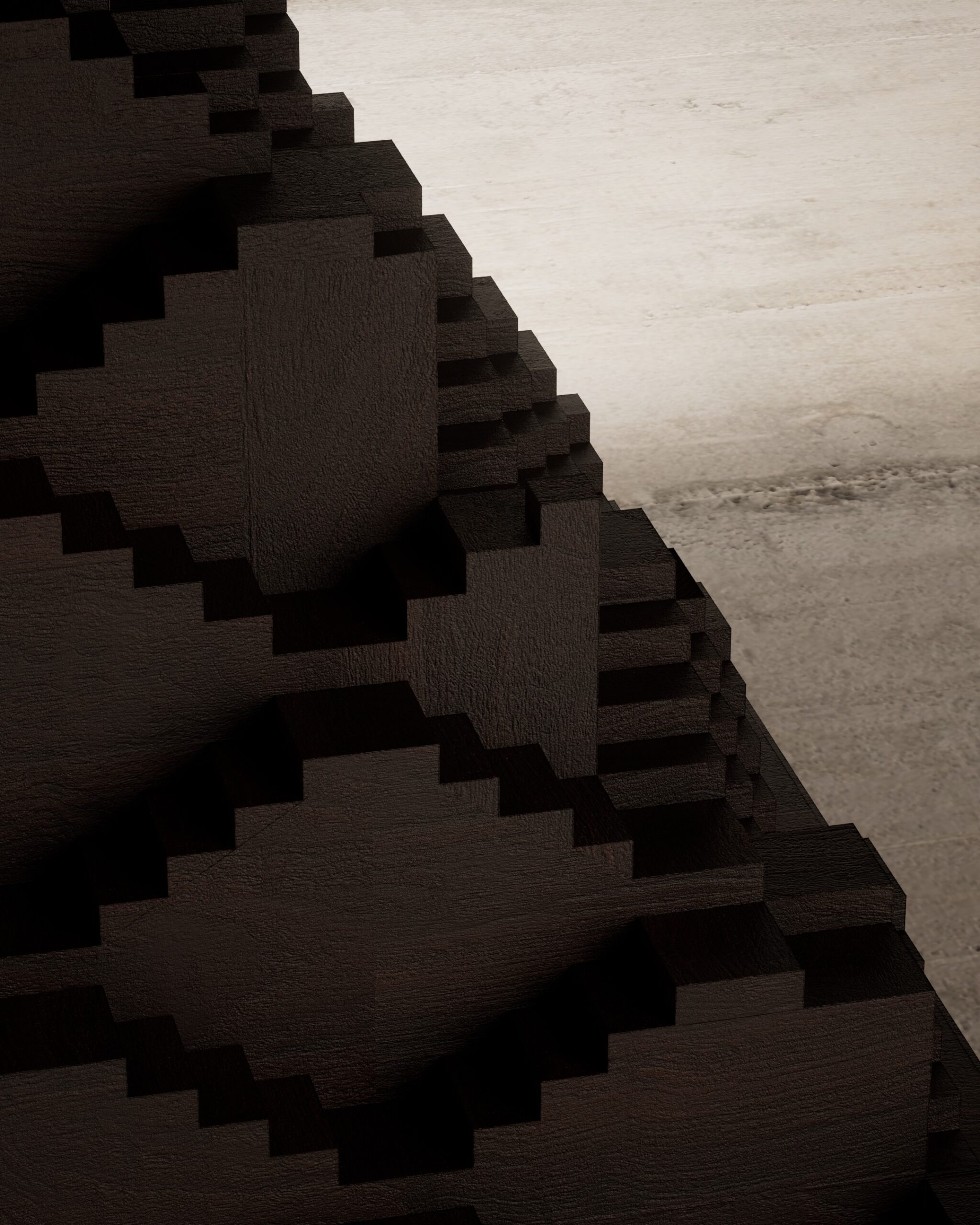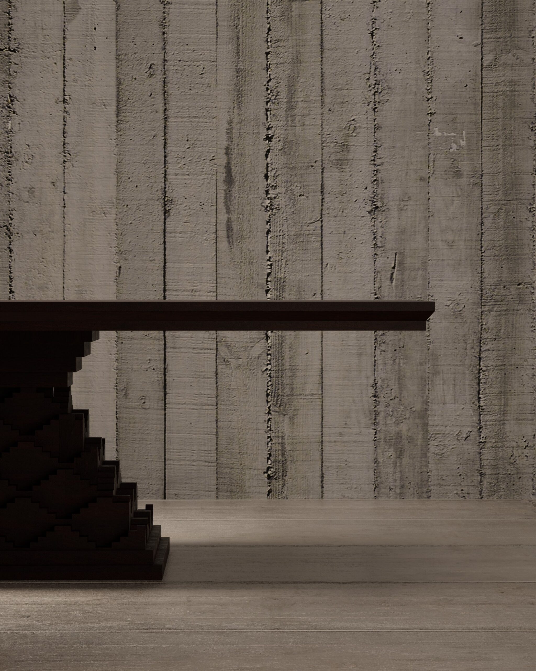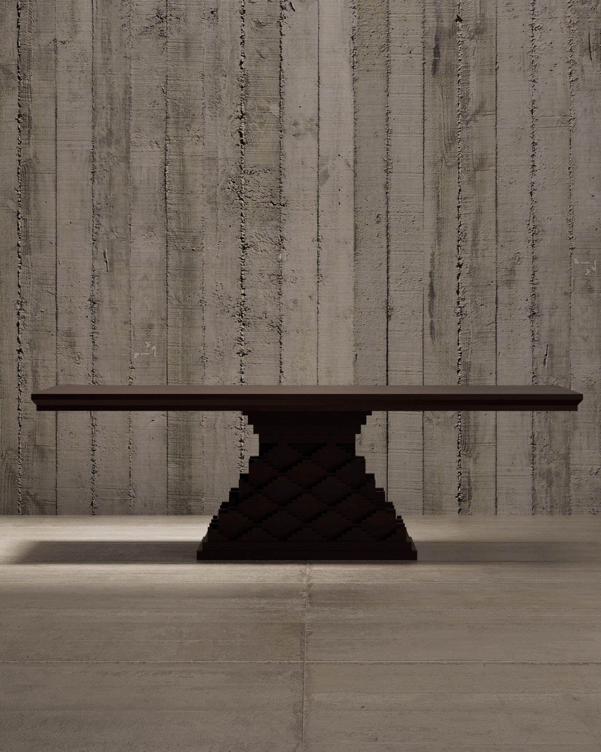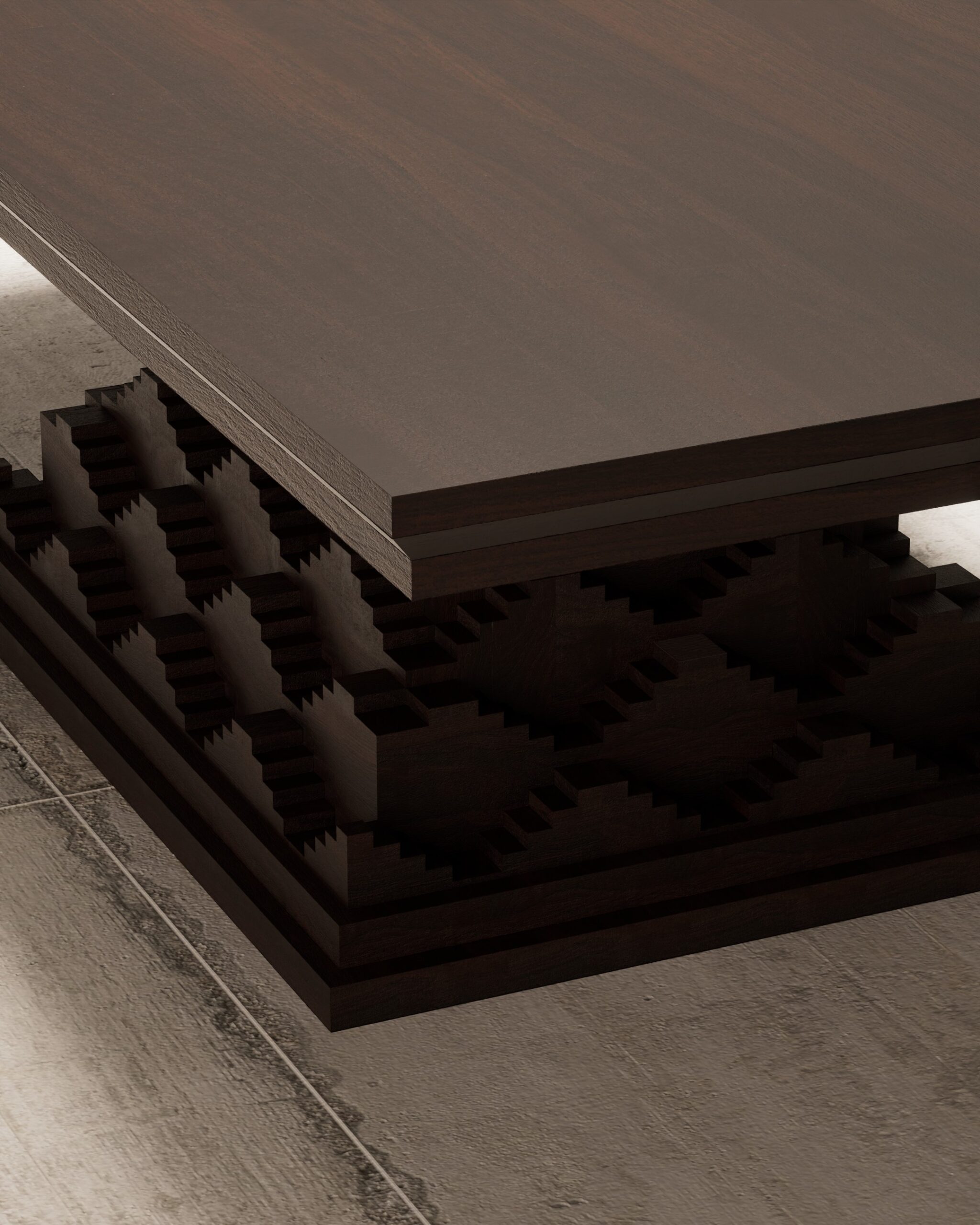 Expansive rectangular top with sharp, architectural mitered edges. Complex “step-well” inspired pedestal base featuring a rhythmic, zig-zag geometric relief. Multi-layered tectonic structure. Matte hand-rubbed oil finish to emphasize the raw, open wood grain.