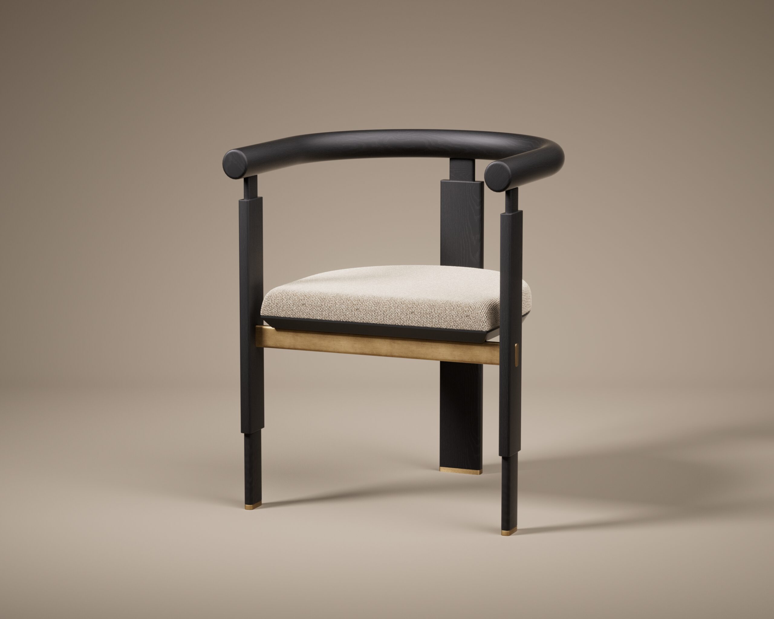 The visual narrative is driven by its unique tiered legs, which transition in thickness to create a sense of vertical movement. Upholstered in a high-density oatmeal bouclé, the thick circular seat provides a soft, tactile counterpoint to the dark, polished timber. Subtle aged brass details are integrated into the lower structural rails and leg caps, serving as refined metallic jewels that ground the chair’s monumental silhouette. The BASALT balances its bold, volumetric forms with sophisticated artisanal craft, offering a commanding and ergonomic focal point for high-end dining environments.