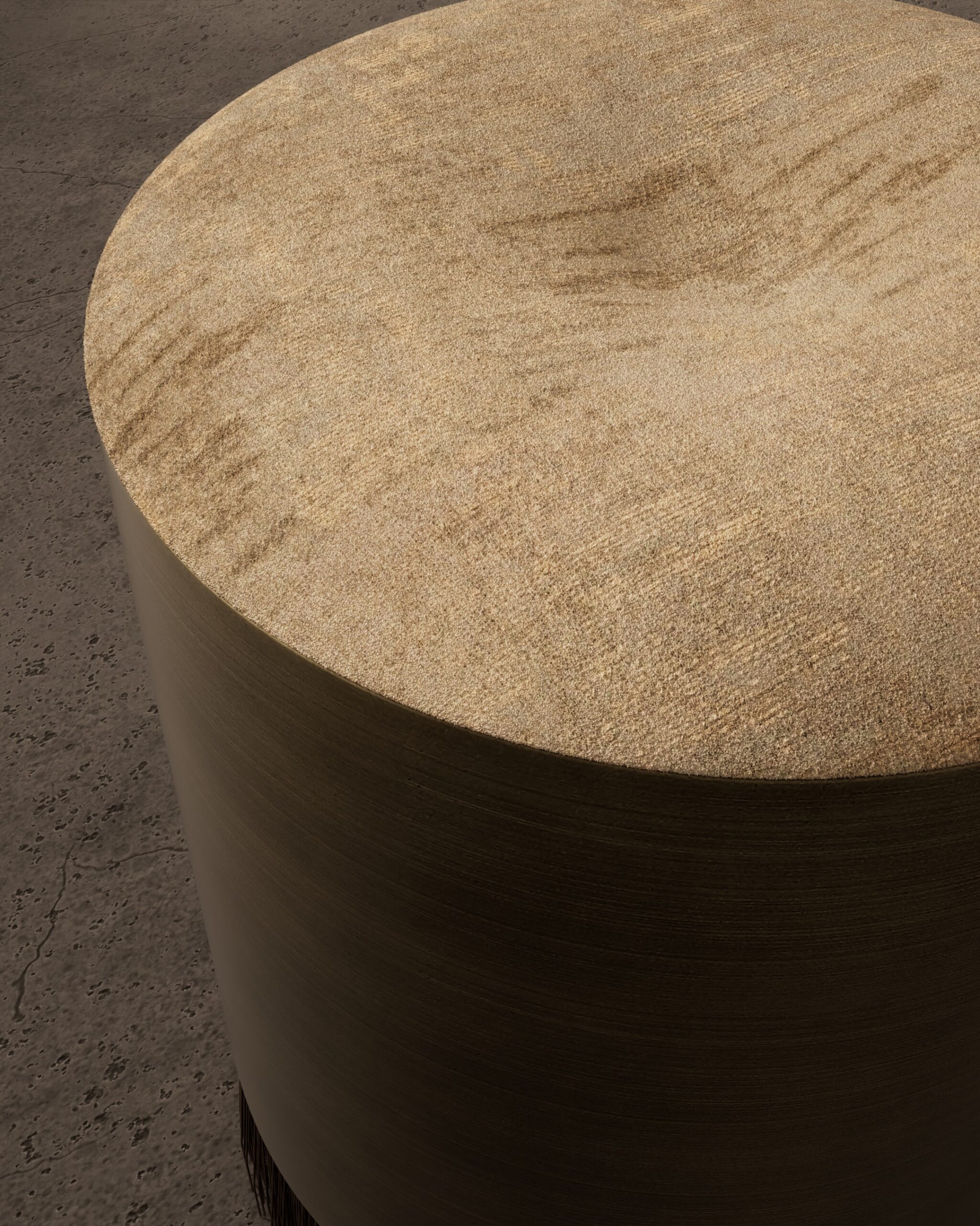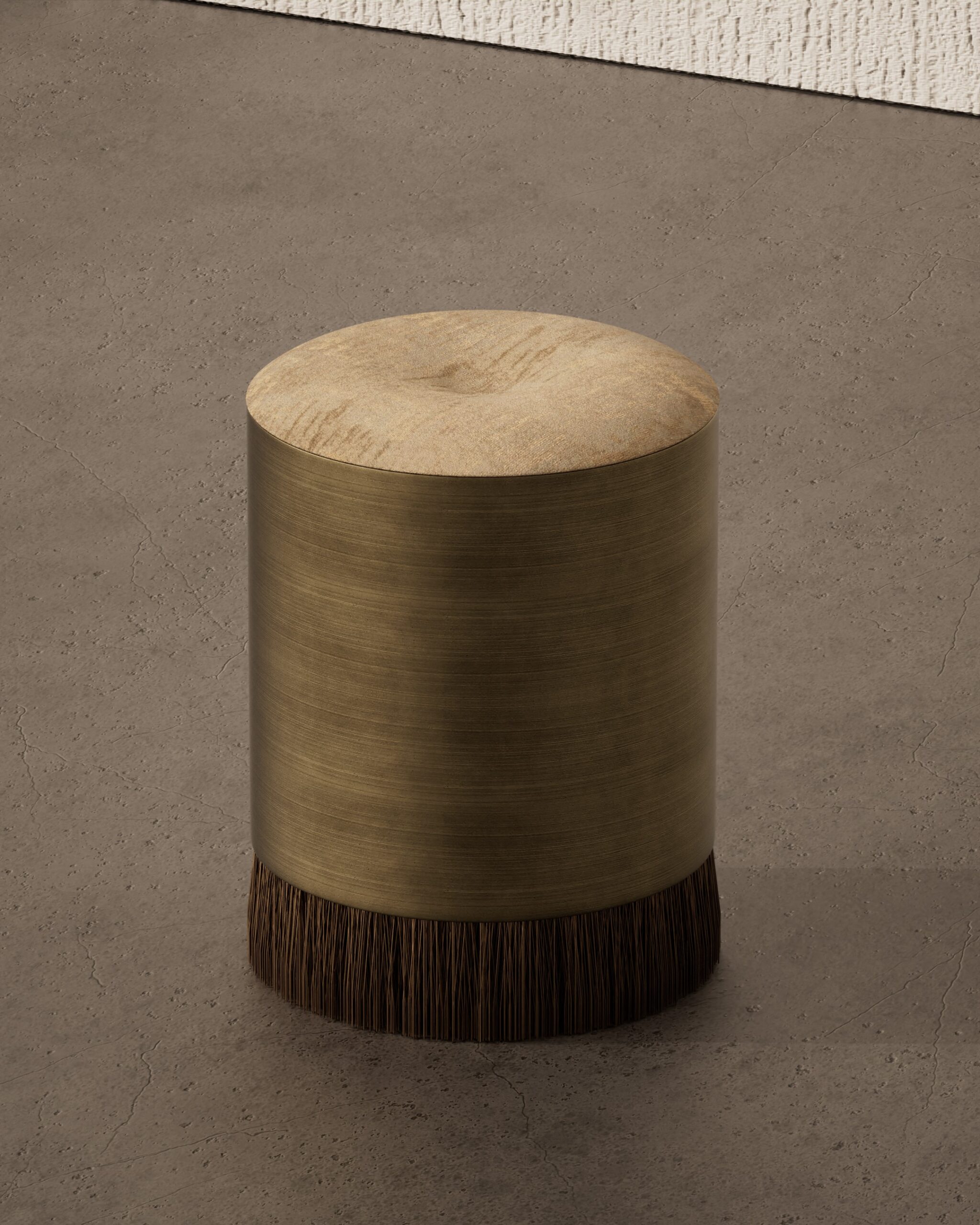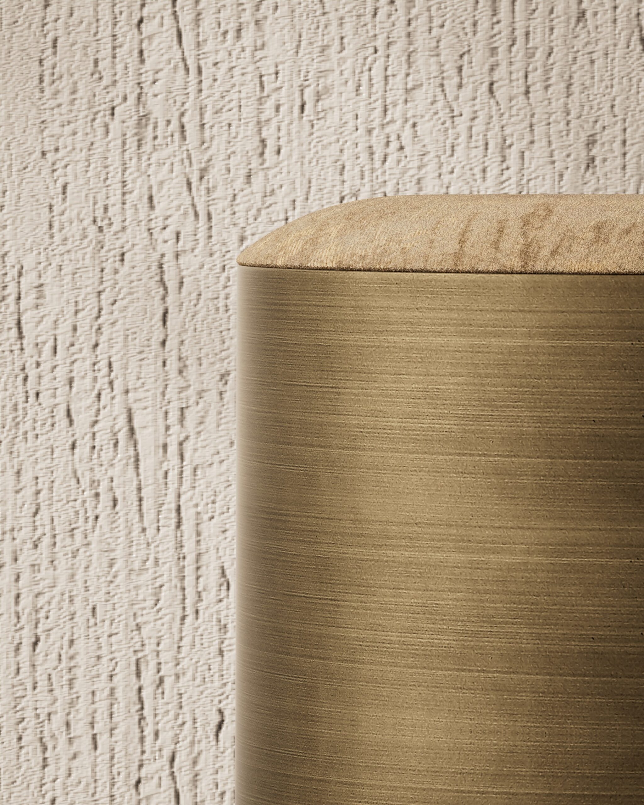 The BEAM center table is an exploration of structural transparency and material joinery. Part of our Design Studio Collection, the piece features an expansive natural oak surface with soft, rounded edges and a visible wood grain that highlights its organic origin. The table is anchored by a matching wooden pedestal base, which is architecturally reinforced by dual brushed champagne metallic rods. These rods penetrate the central support and terminate in decorative, precision-milled circular caps, creating a balanced dialogue between heavy timber mass and sleek industrial accents.