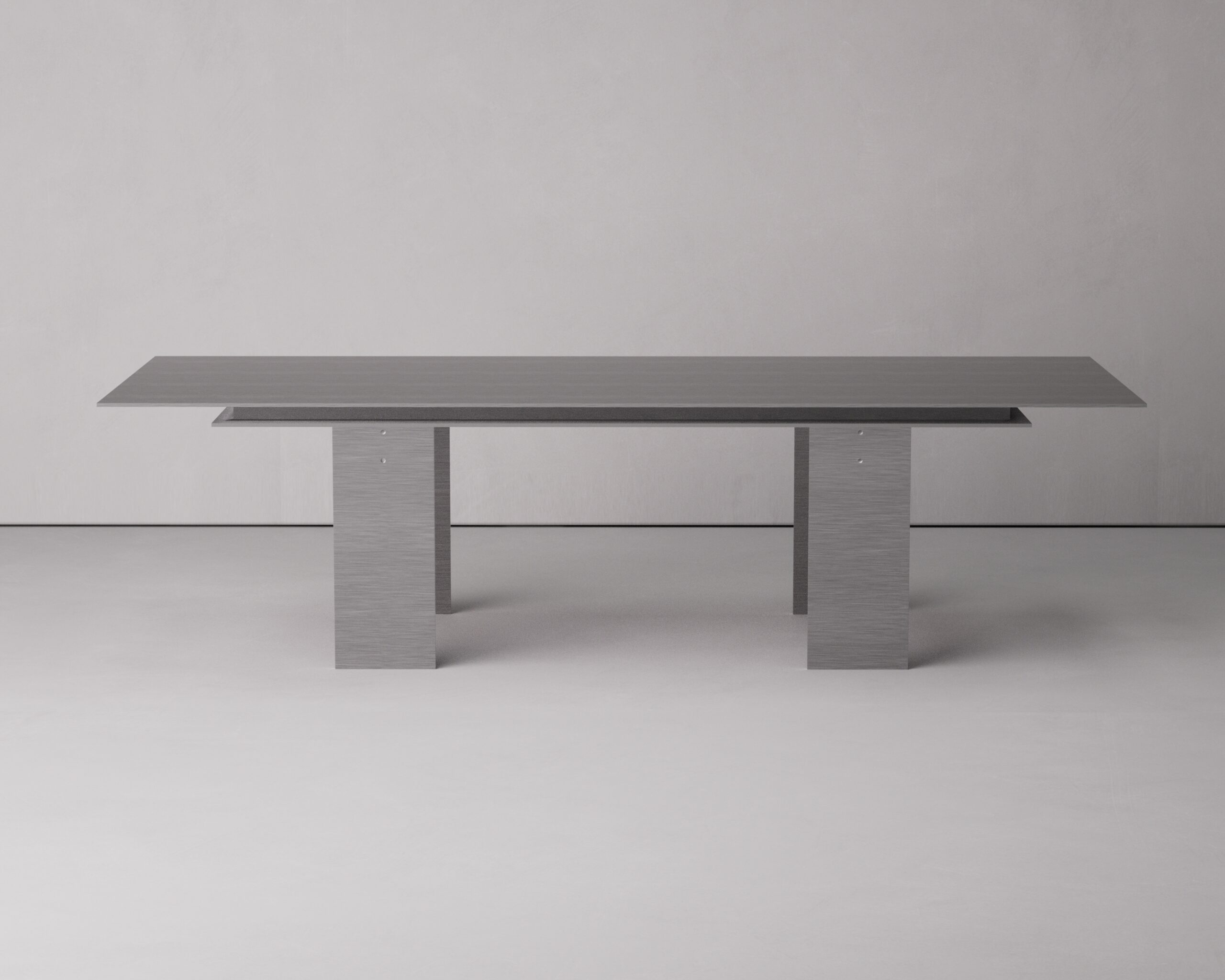 The architectural narrative centers on its four monolithic supports: thin, wide metallic plates that echo the “blade” aesthetic of the tabletop. A distinctive shadow gap is integrated at the junction where the legs meet the top, creating the illusion of a suspended, weightless surface. Small, precision-milled circular hardware details are visible on the legs, underscoring the table’s industrial heritage. The BLADE balances a commanding, wide-format presence with a refined visual lightness, serving as a sophisticated focal point for high-end modern dining environments and executive suites.