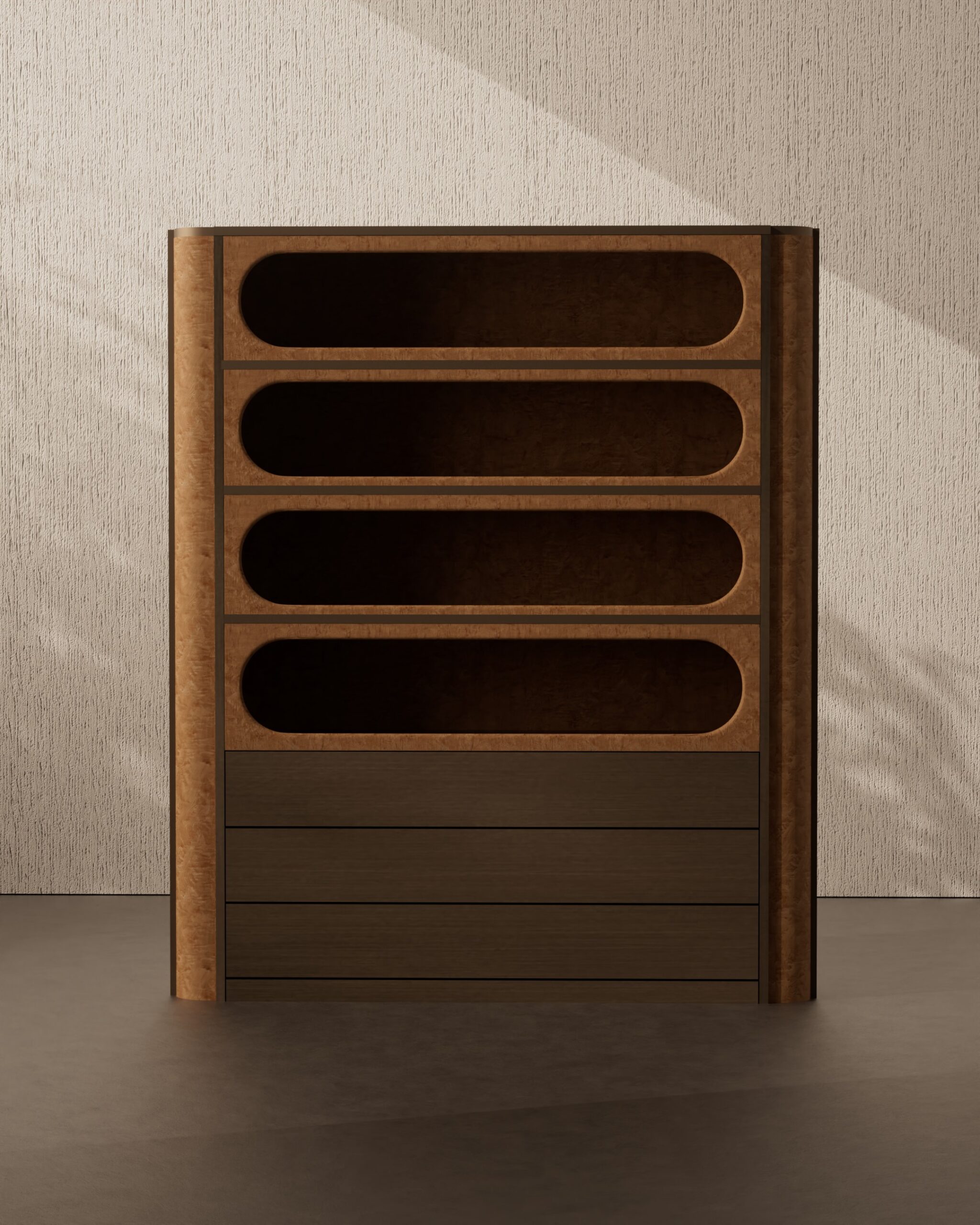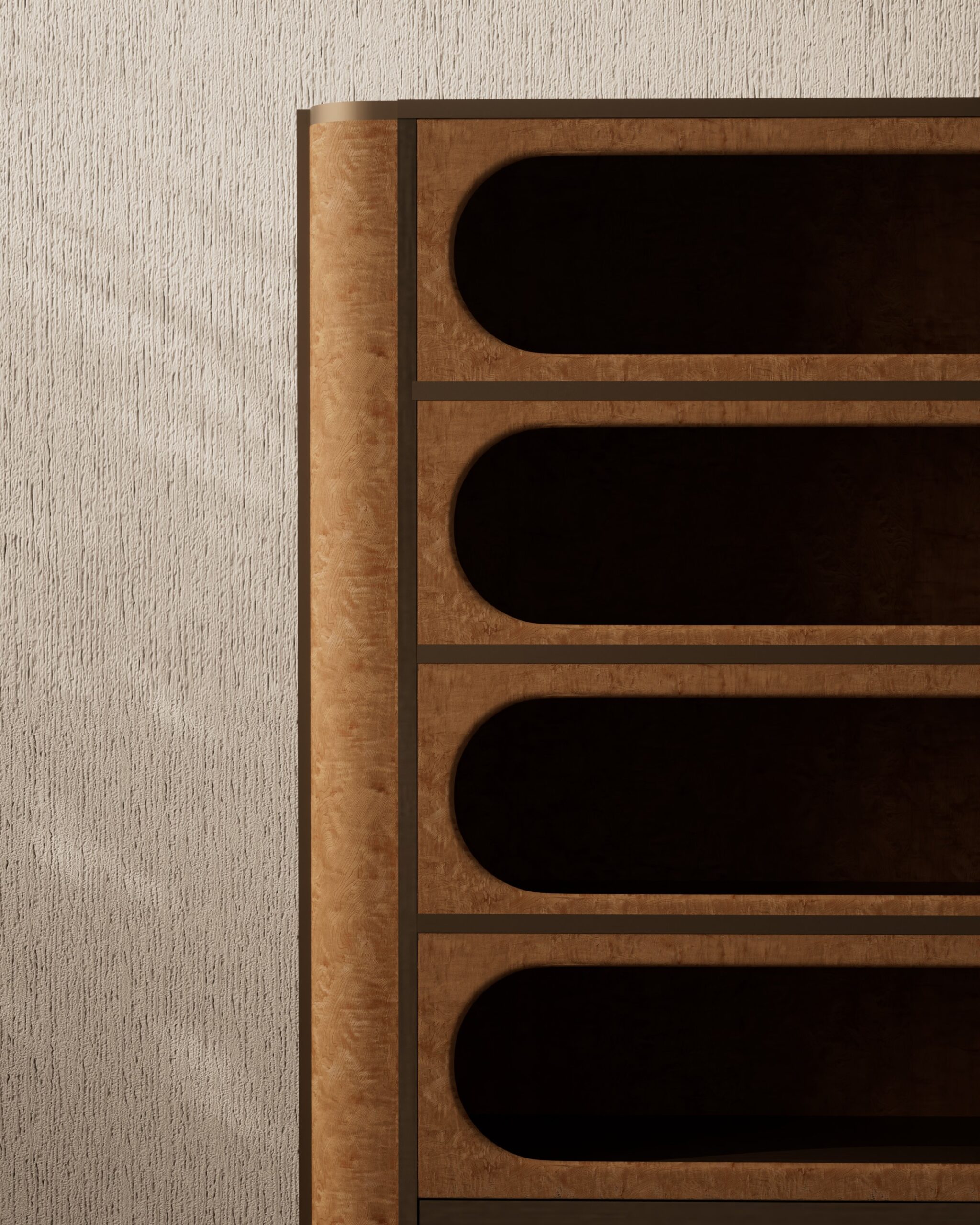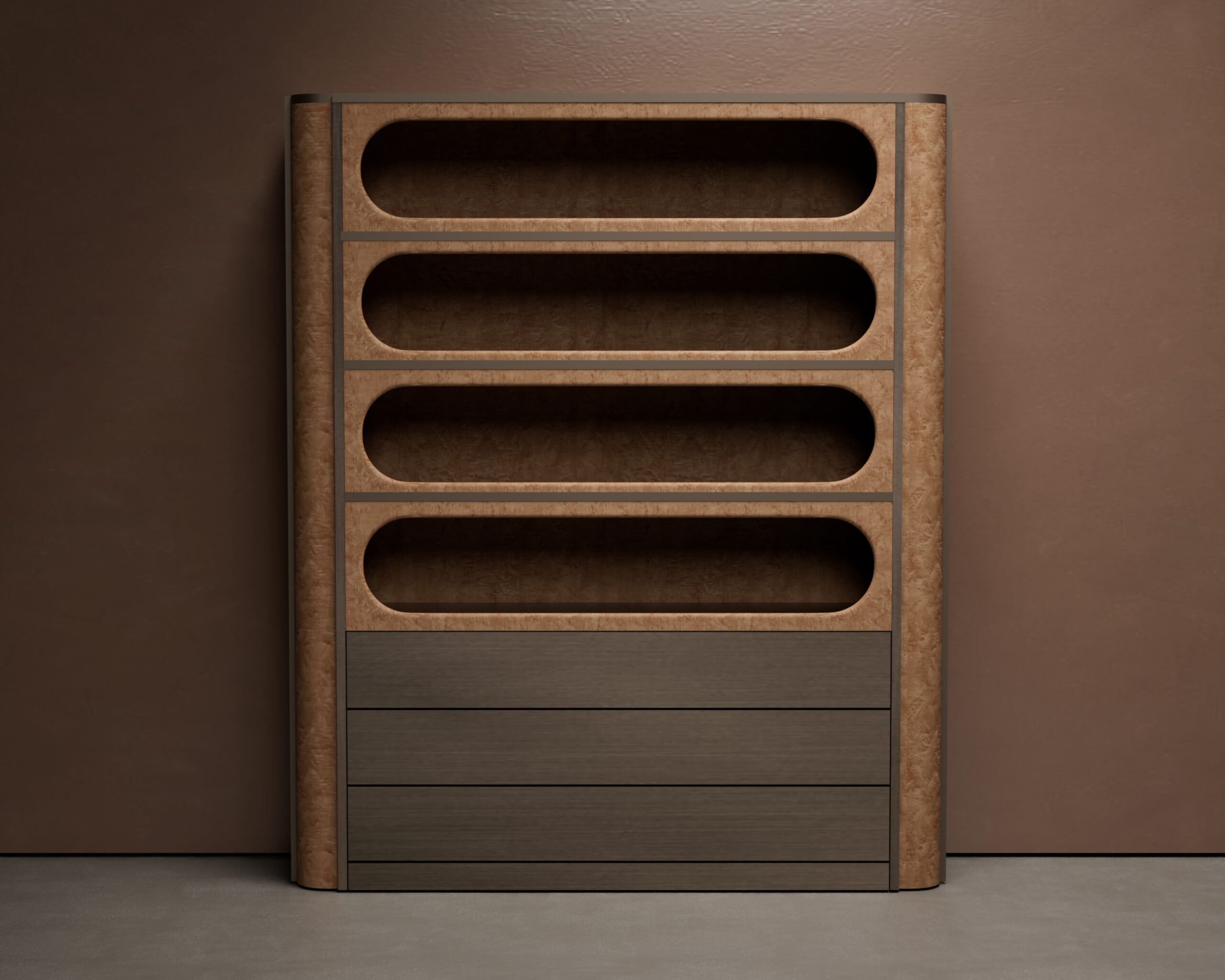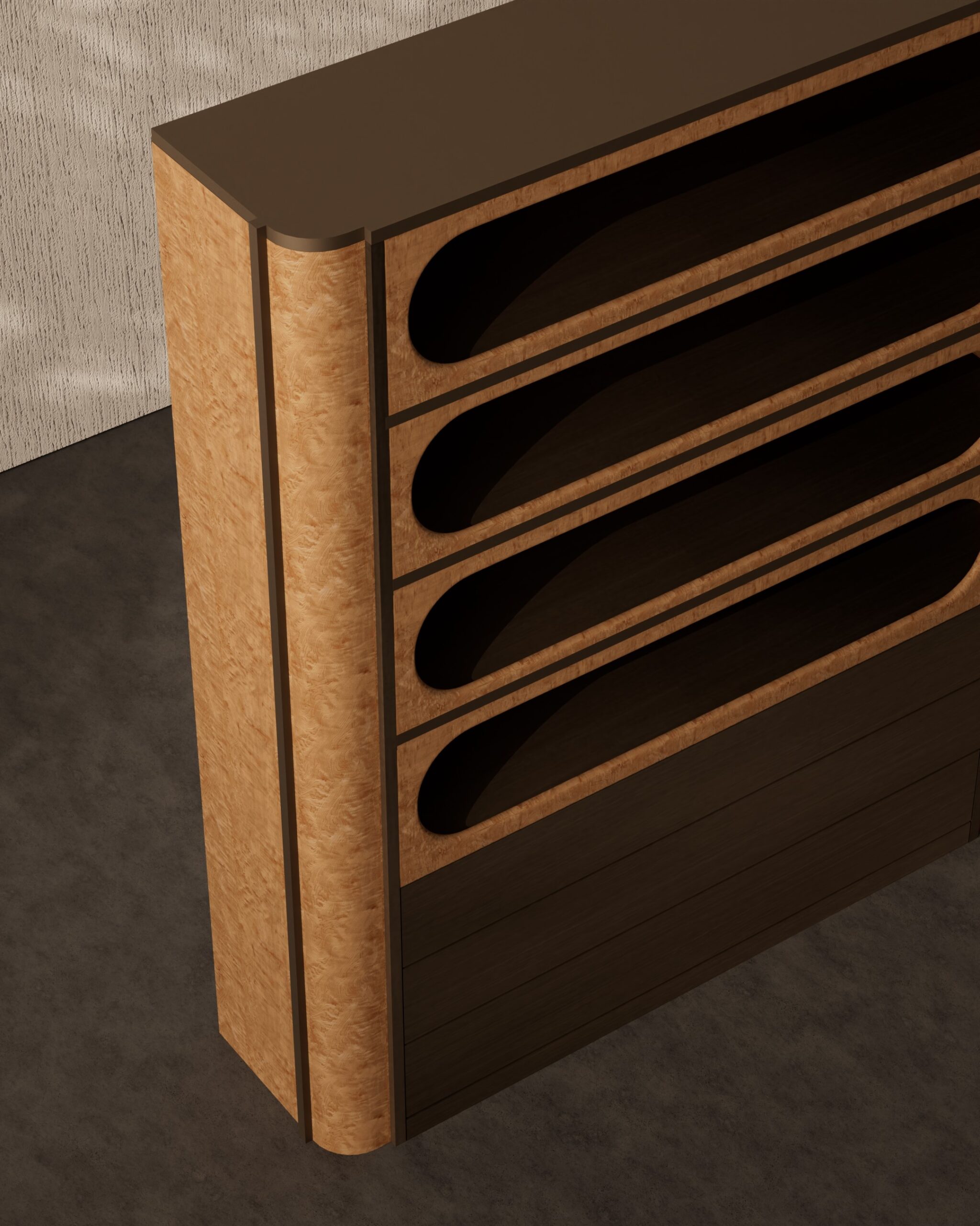 The BLUR bookshelf is a study in tonal stratification and soft-volume storage. Part of our Design Studio Collection, the piece is characterized by its substantial frame encased in figured ash veneer, showcasing a high-contrast, swirling grain that wraps seamlessly around elegantly radiused corners. The architectural narrative is defined by four recessed, pill-shaped display niches finished in a matching warm timber, providing a rhythmic and protected gallery for curated objects. The lower section transitions into a solid block of charcoal oak drawers, providing a grounded visual foundation. Capped with a thin-profile matte champagne metallic top, the BLUR balances the organic complexity of figured wood with modern, architectural precision.