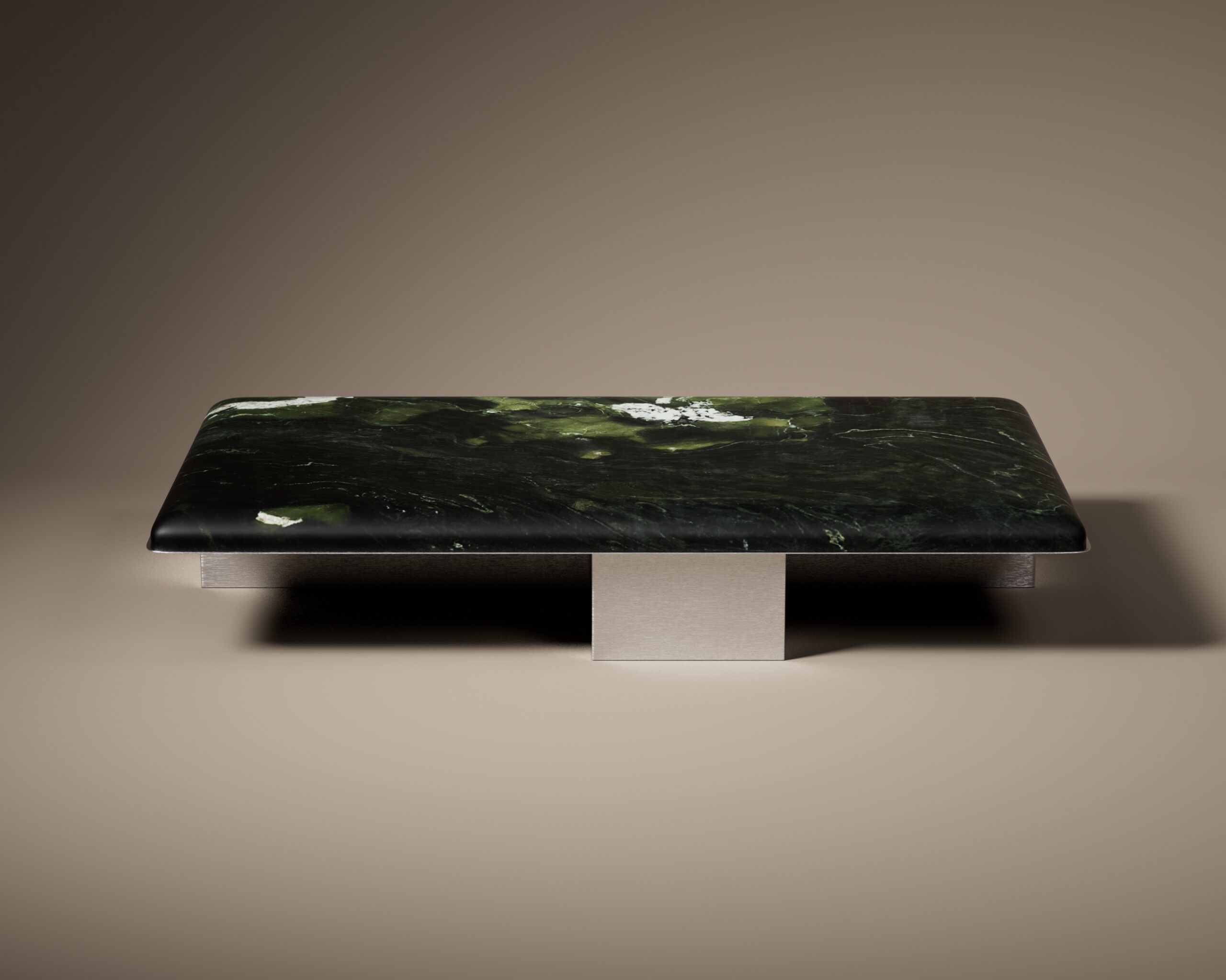The BOLSTER center table is a study in monolithic weight and visual softness. Part of our Design Studio Collection, the piece is characterized by its substantial, pillowed forest marble top, which appears to be delicately squeezed by a precision-engineered brushed stainless steel frame. This architectural assembly features a recessed plinth base that creates a floating effect, balancing the table’s heavy stone volume with a sense of suspended grace and high-contrast materiality.