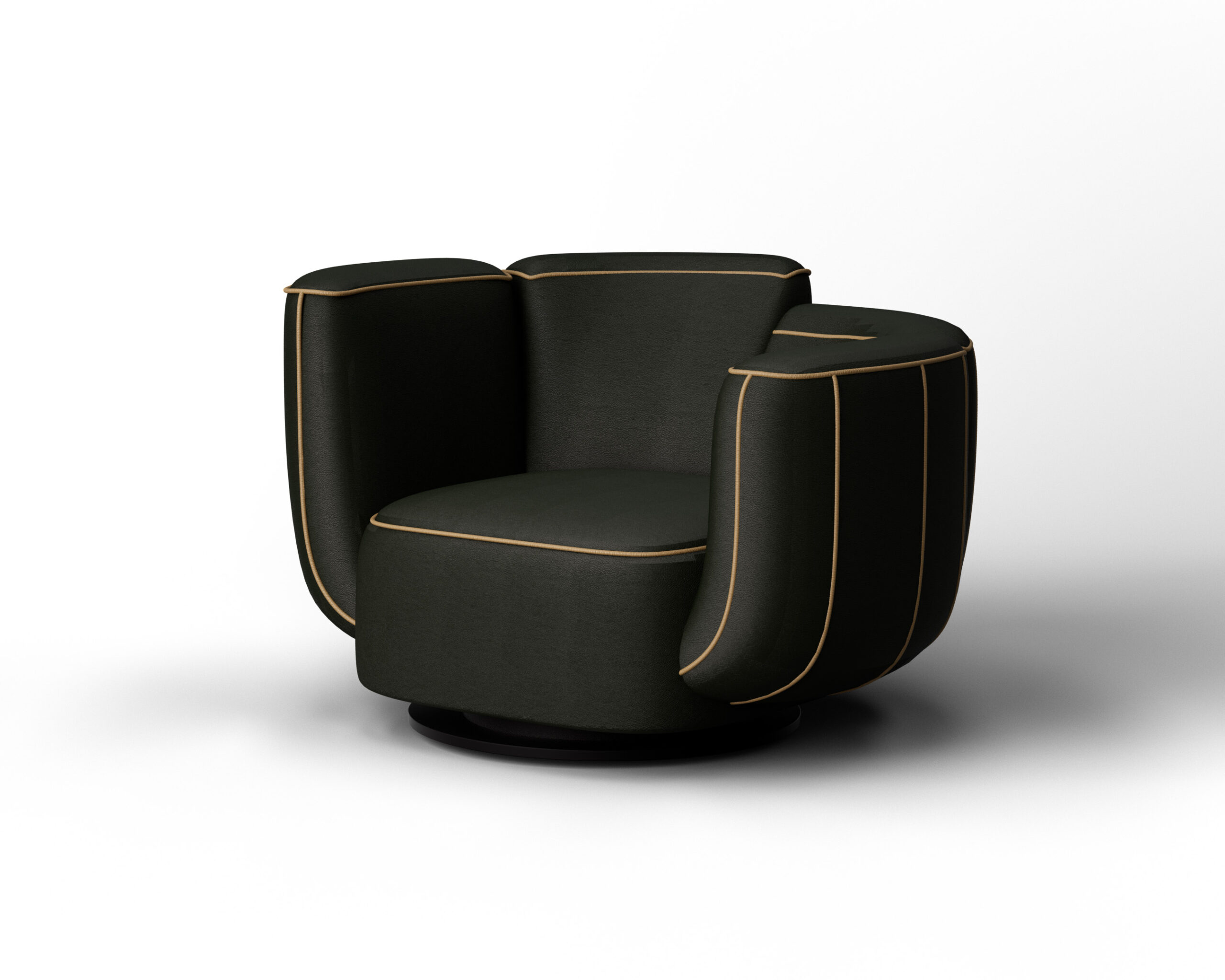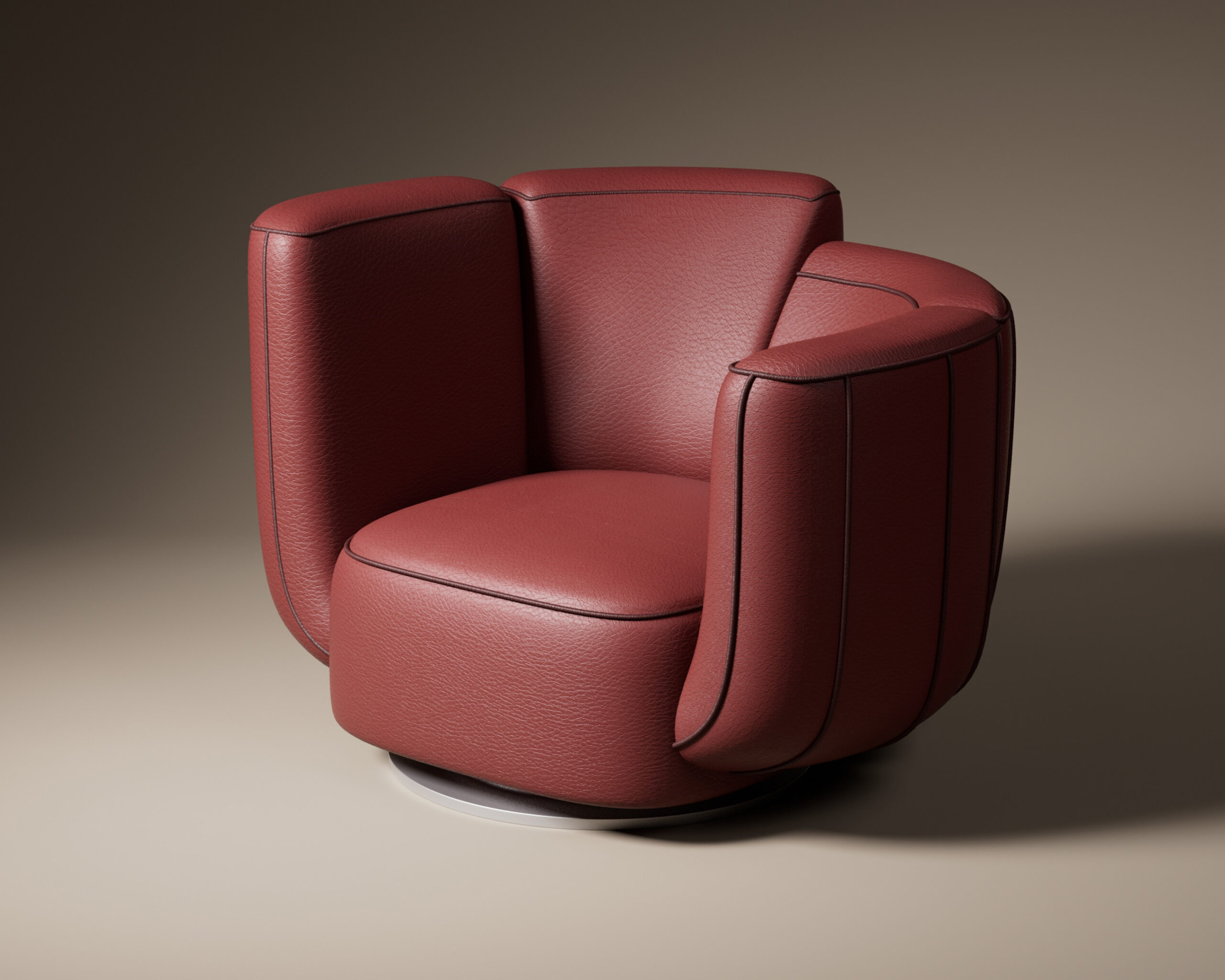 The CACTA armchair is a bold, organic statement piece that draws clear inspiration from natural forms. Upholstered in a rich terracotta pebbled leather, its silhouette is defined by deep vertical segments outlined in dark contrast piping, mimicking the ribbed structure of a cactus. This segmented, hugging shape rests on a low-profile swivel base, combining playful, sculptural design with grounded, tactile luxury.