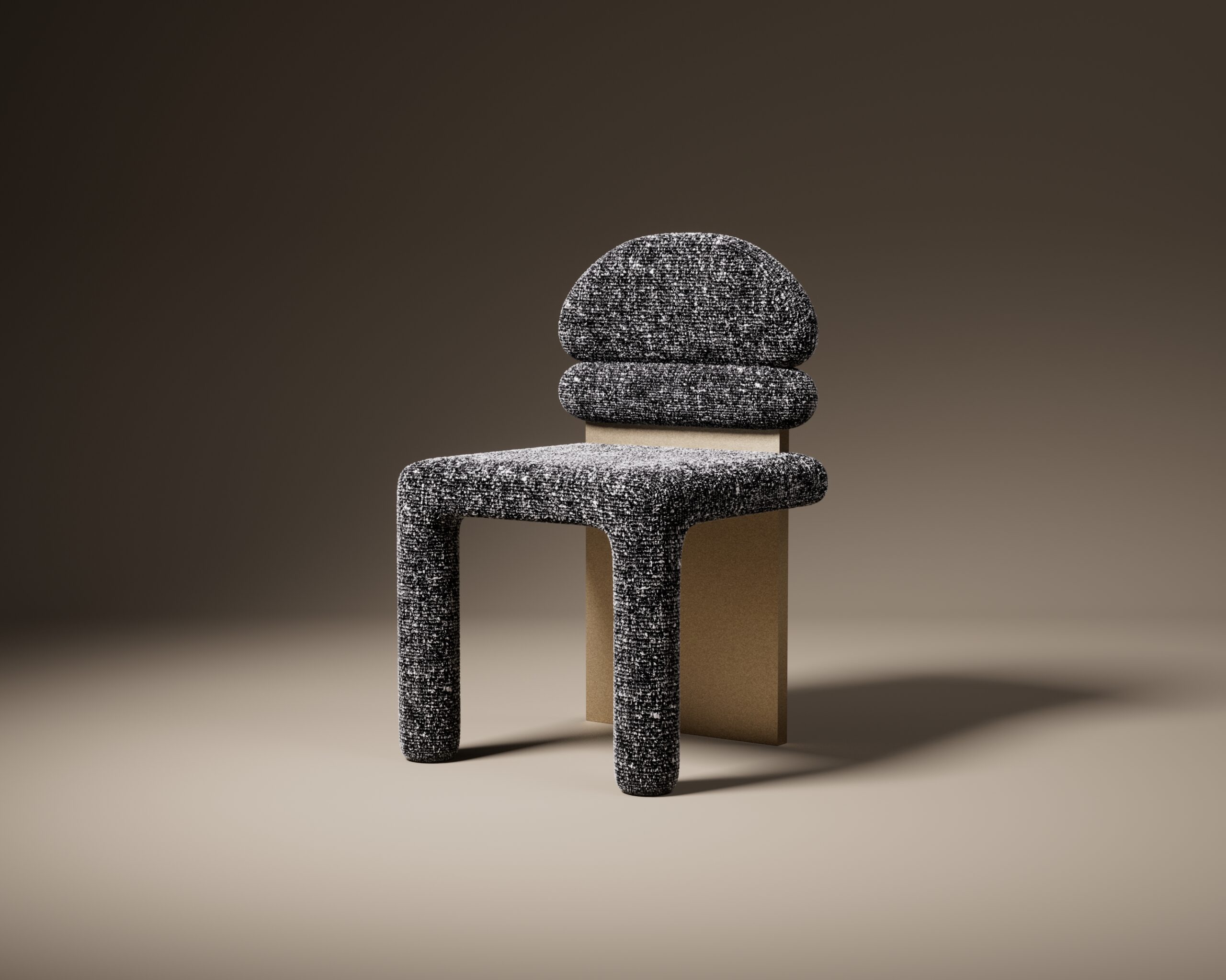 The CALDER dining chair is a study in geometric play and balanced volumes. Part of our Design Studio Collection, it features a unique, triple-segmented backrest and seat fully upholstered in a high-texture salt-and-pepper bouclé. The soft, pill-shaped upholstered elements are structurally anchored by a single, monolithic gold slab support at the rear, creating a striking profile that balances plush comfort with architectural rigidity.