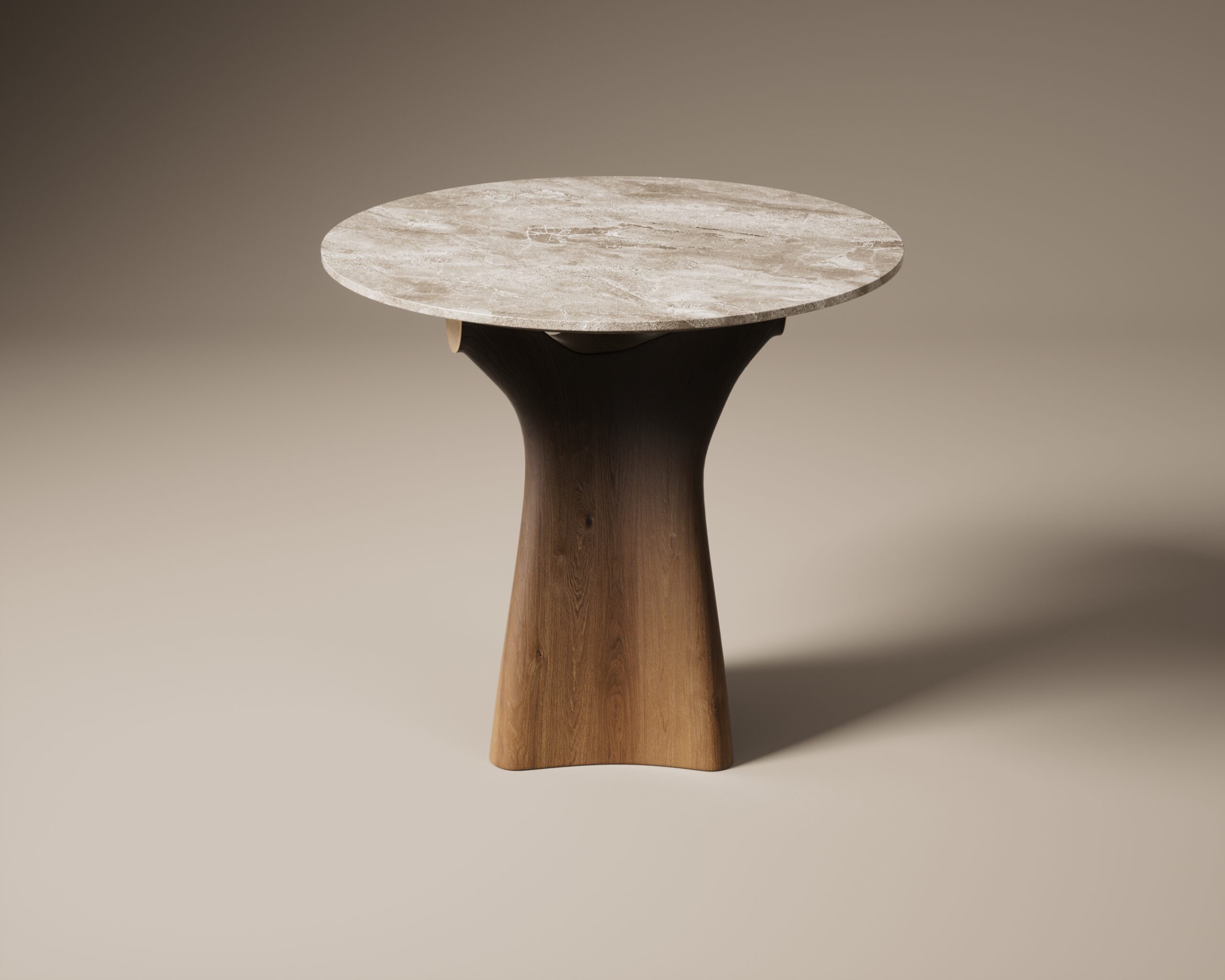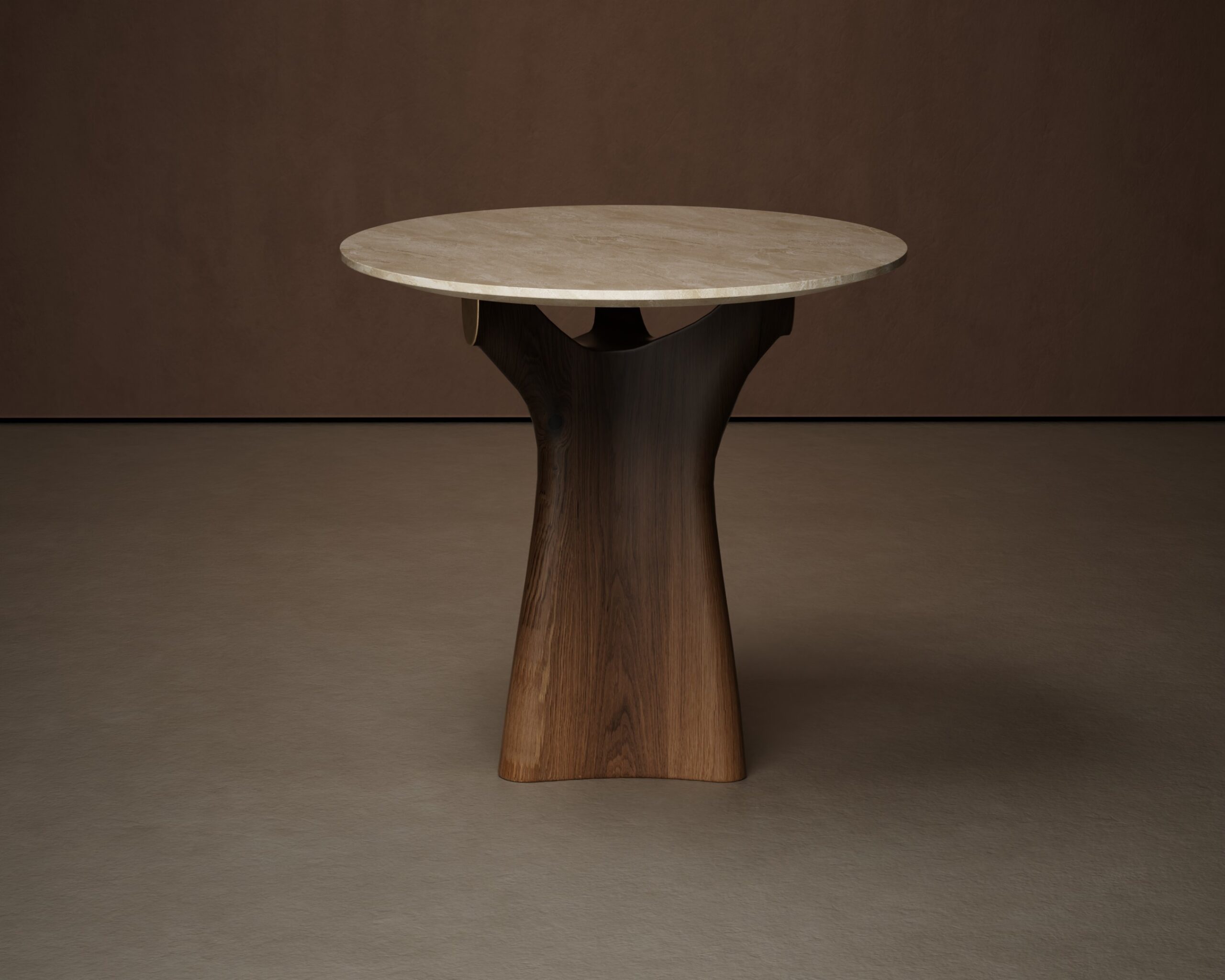 The CALYX side table is a study in arboreal structuralism and material elegance. Part of our Design Studio Collection, the piece is defined by its organic, hand-carved solid walnut base. The pedestal rises from a stable foundation, branching into a fluid “Y” silhouette that mimics the natural growth of a tree’s calyx to cradle the surface above. This sculptural timber frame supports a circular top crafted from deeply veined dark marble, featuring a polished finish that highlights the stone’s complex geological history. The CALYX balances the rich, vertical grain of the walnut with the permanent, cold beauty of marble, offering a sophisticated and grounded accent for modern lounge environments.