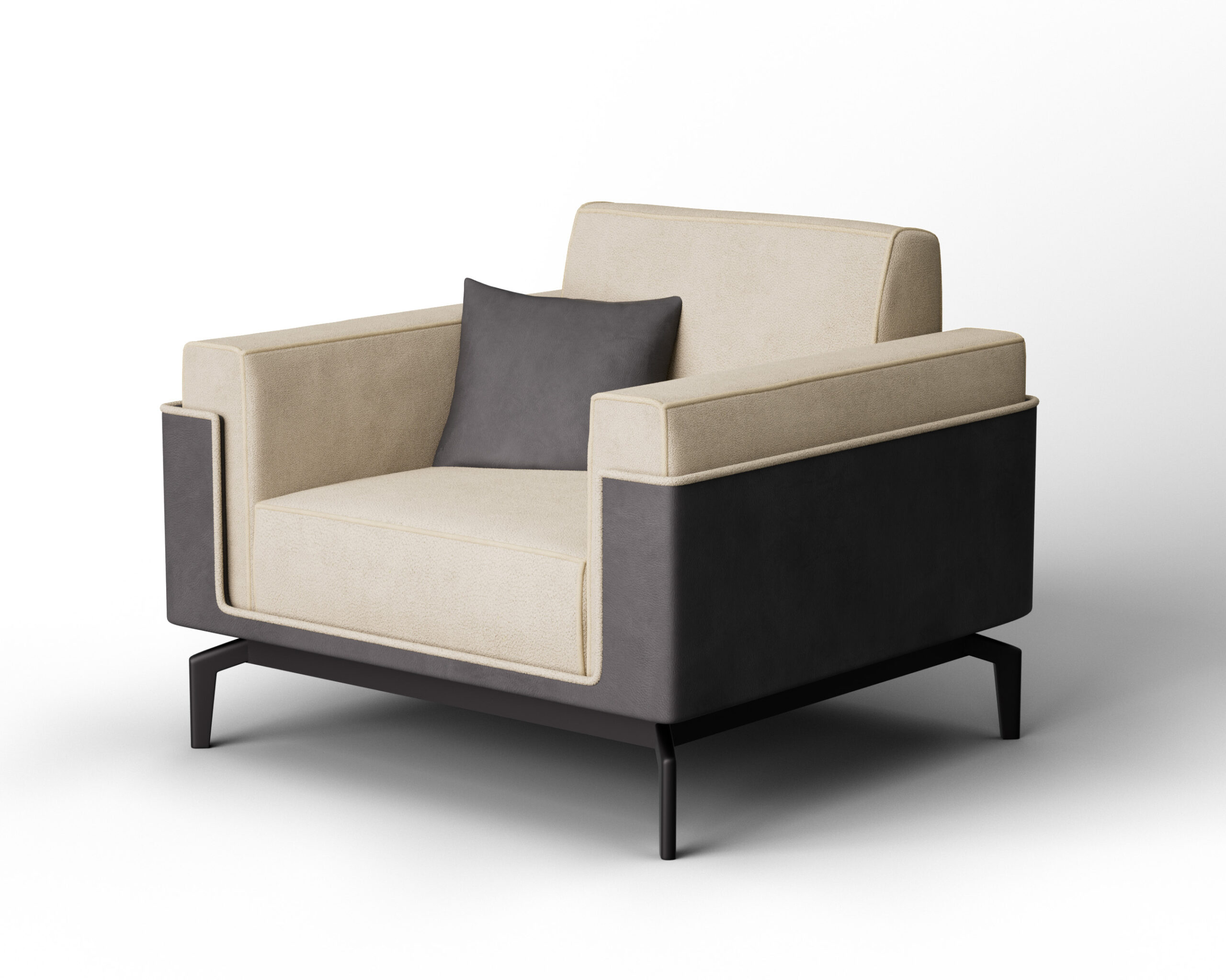 The visual narrative is driven by the interplay between the hard exterior and the inviting seating volume. The deep seat and integrated backrest are upholstered in a premium off-white bouclé, providing a soft and breathable ergonomic landscape. A refined contrast piping detail follows the architectural lines of the outer shell, emphasizing the chair’s clean silhouette. Supported by slim, tapered wooden legs in a matching dark finish, the CAMBER balances its substantial material presence with a sophisticated visual lightness. It serves as a commanding and ergonomic focal point for high-end residential lounges and modern executive suites.