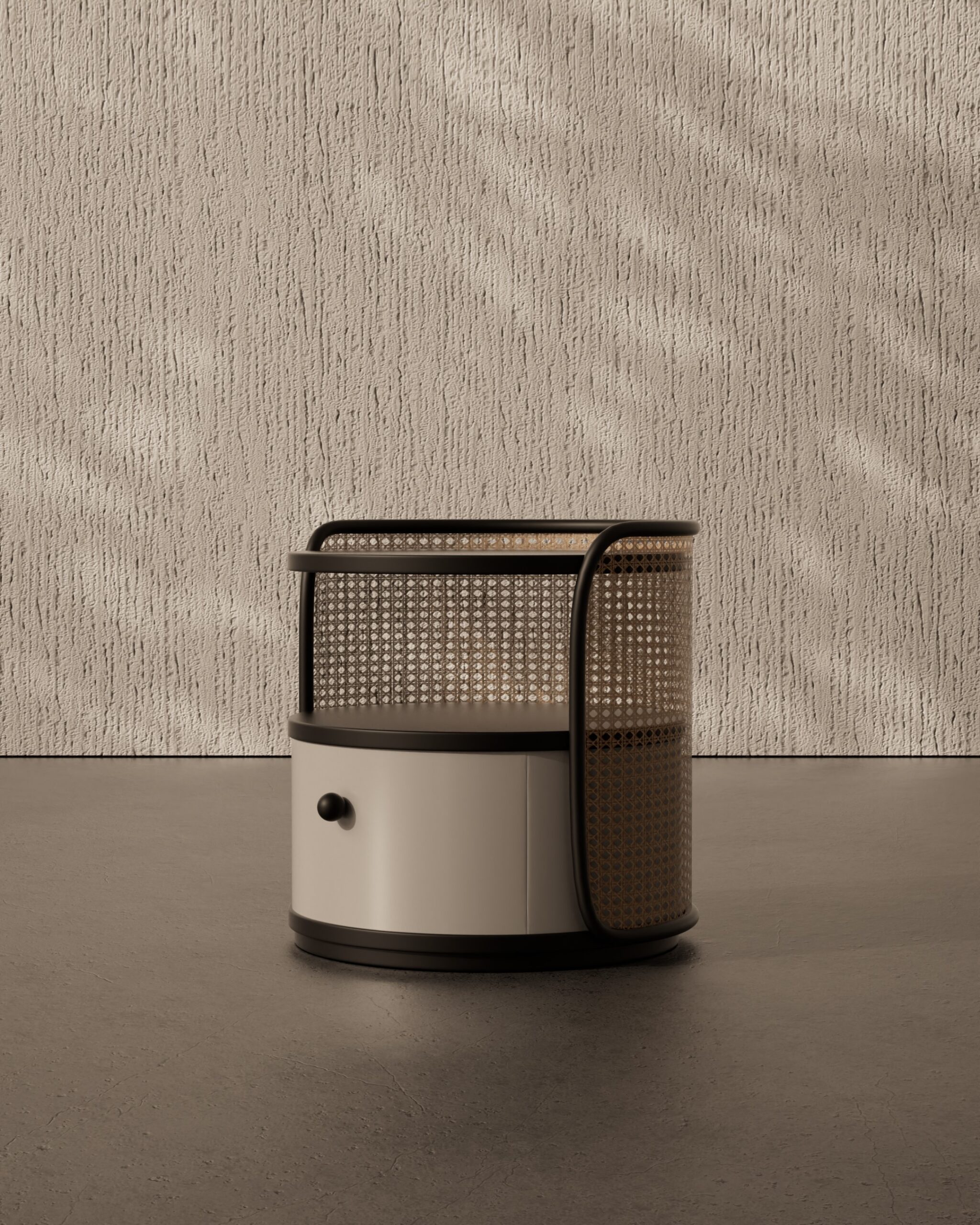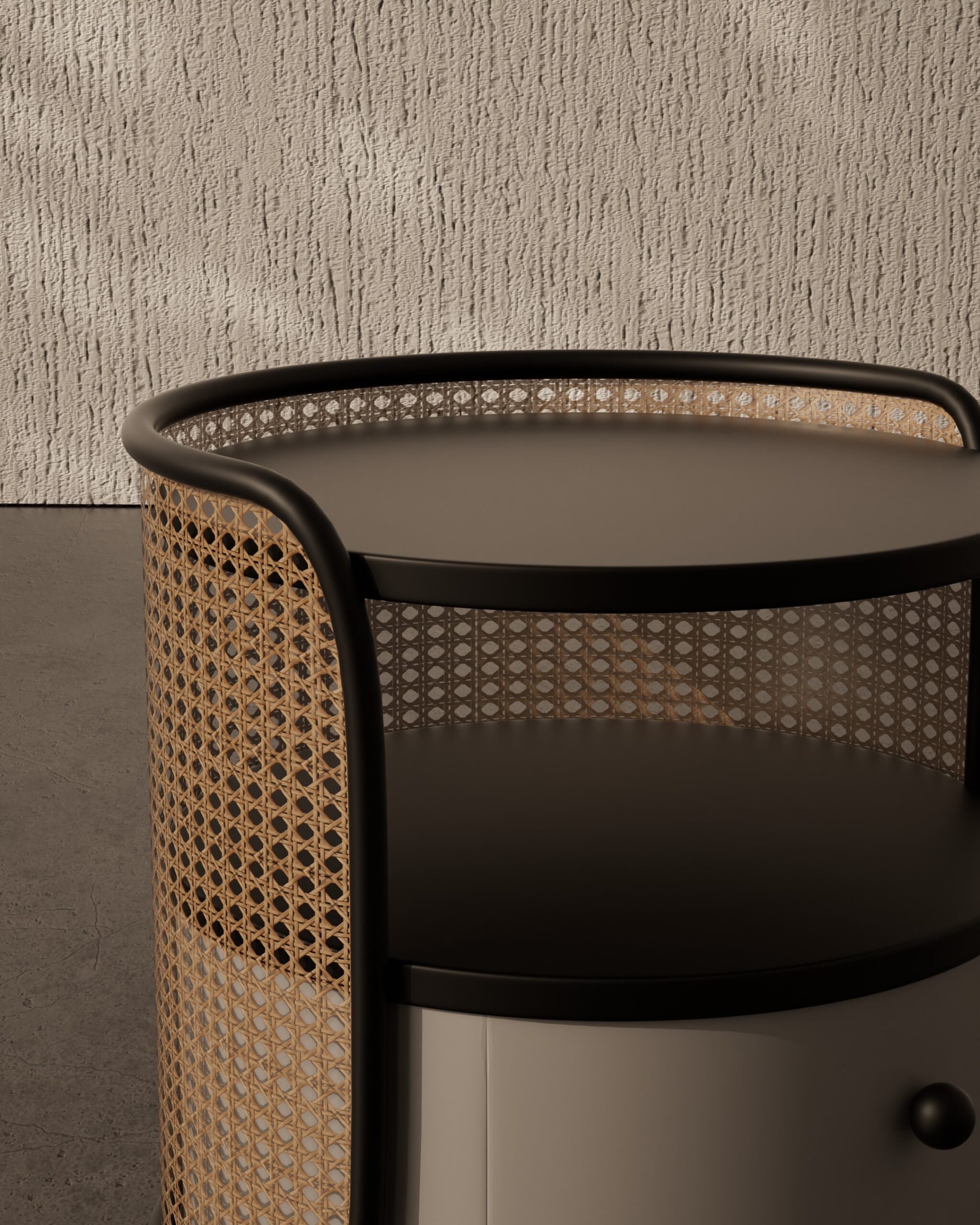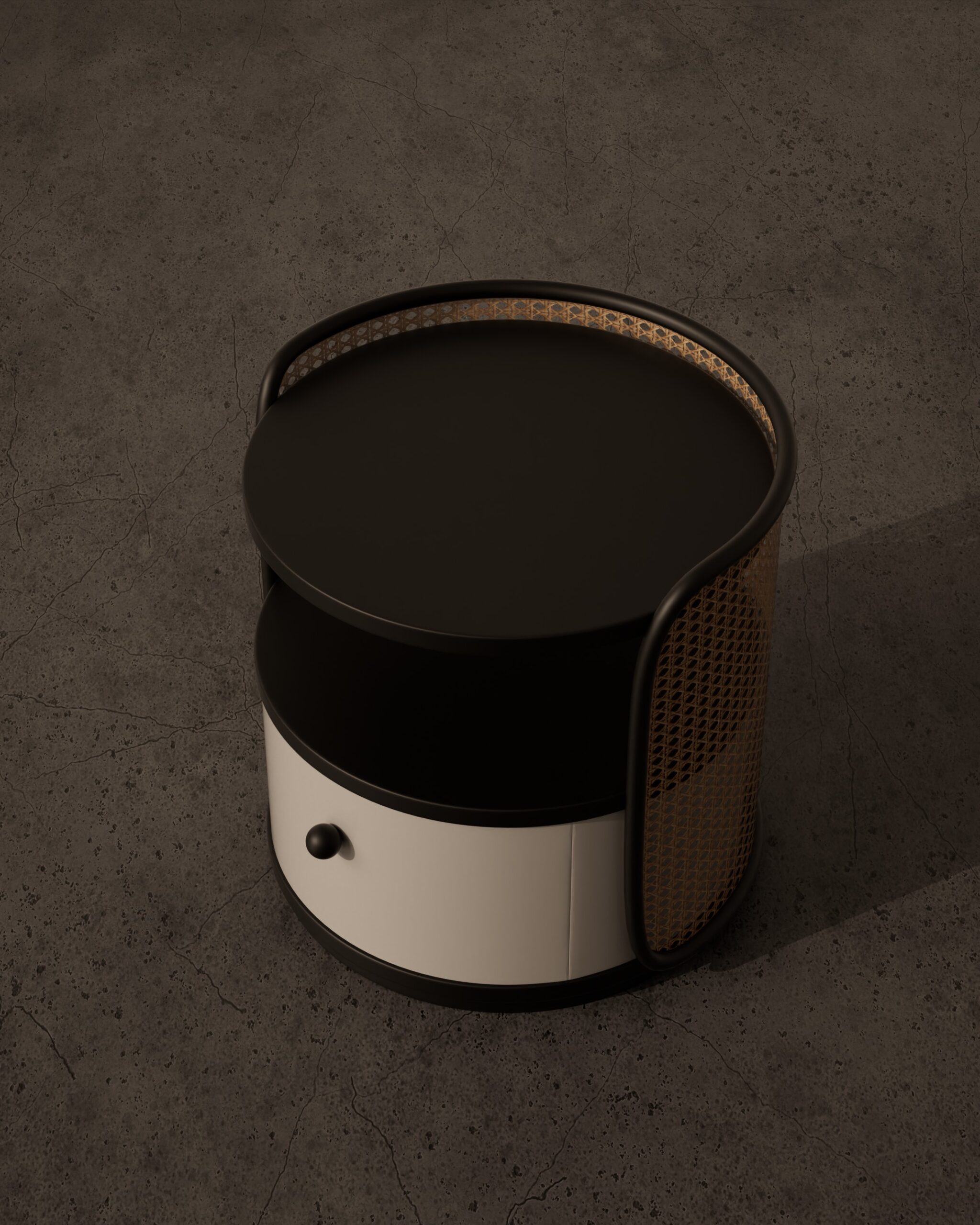 The Cane Bedside Table is a harmonious blend of industrial structure and organic warmth. Defined by a continuous matte black frame that curves to embrace the rear and sides, it features a panel of natural woven cane webbing that adds texture and visual lightness. The table offers a two-tier design: a concealed storage drawer at the base finished in a smooth, contrasting cream tone, and an open middle shelf capped by a tray-style black top. The juxtaposition of the solid, light-colored drawer against the airy, golden-hued rattan creates a balanced, contemporary aesthetic perfect for modern or Japandi-inspired interiors.