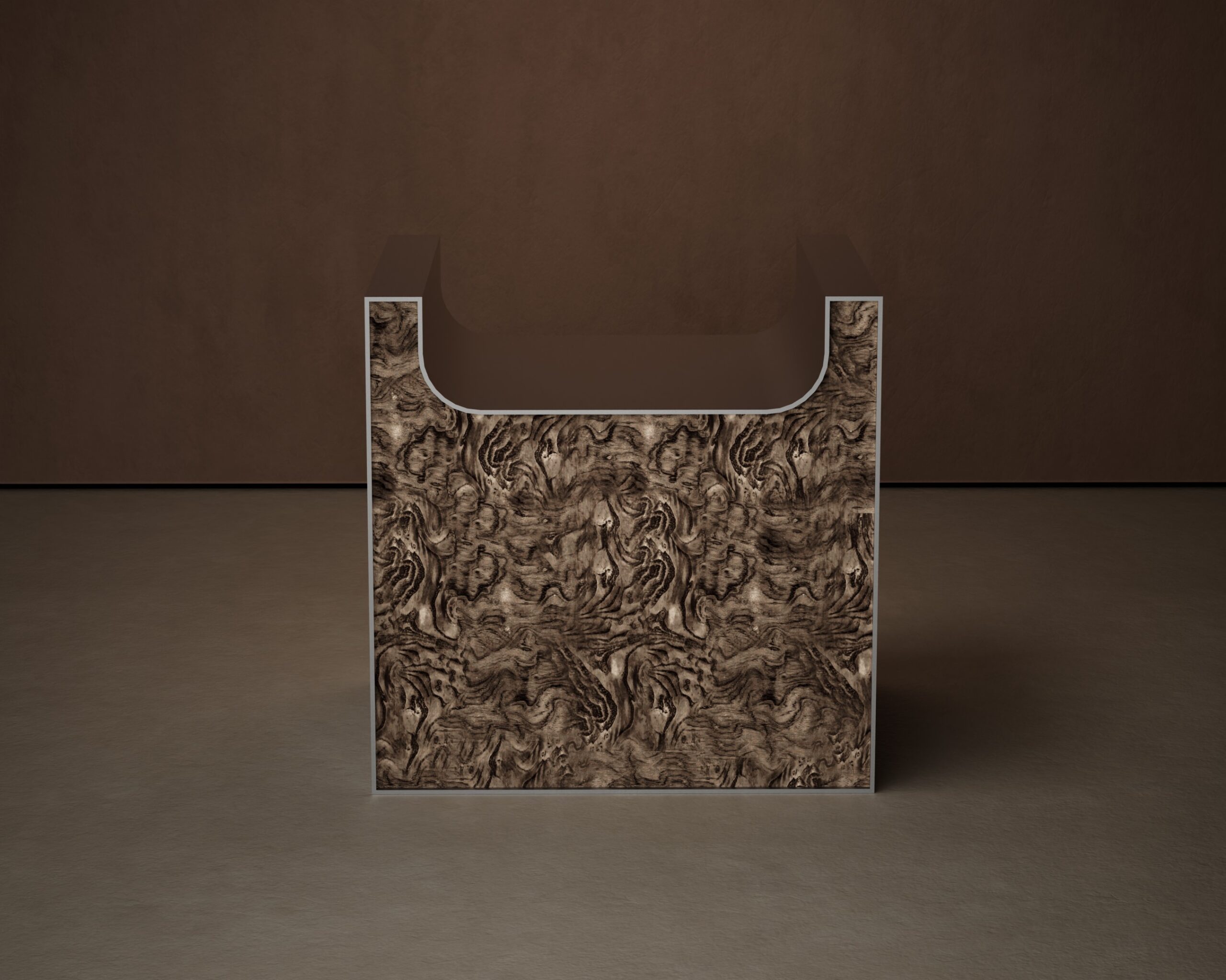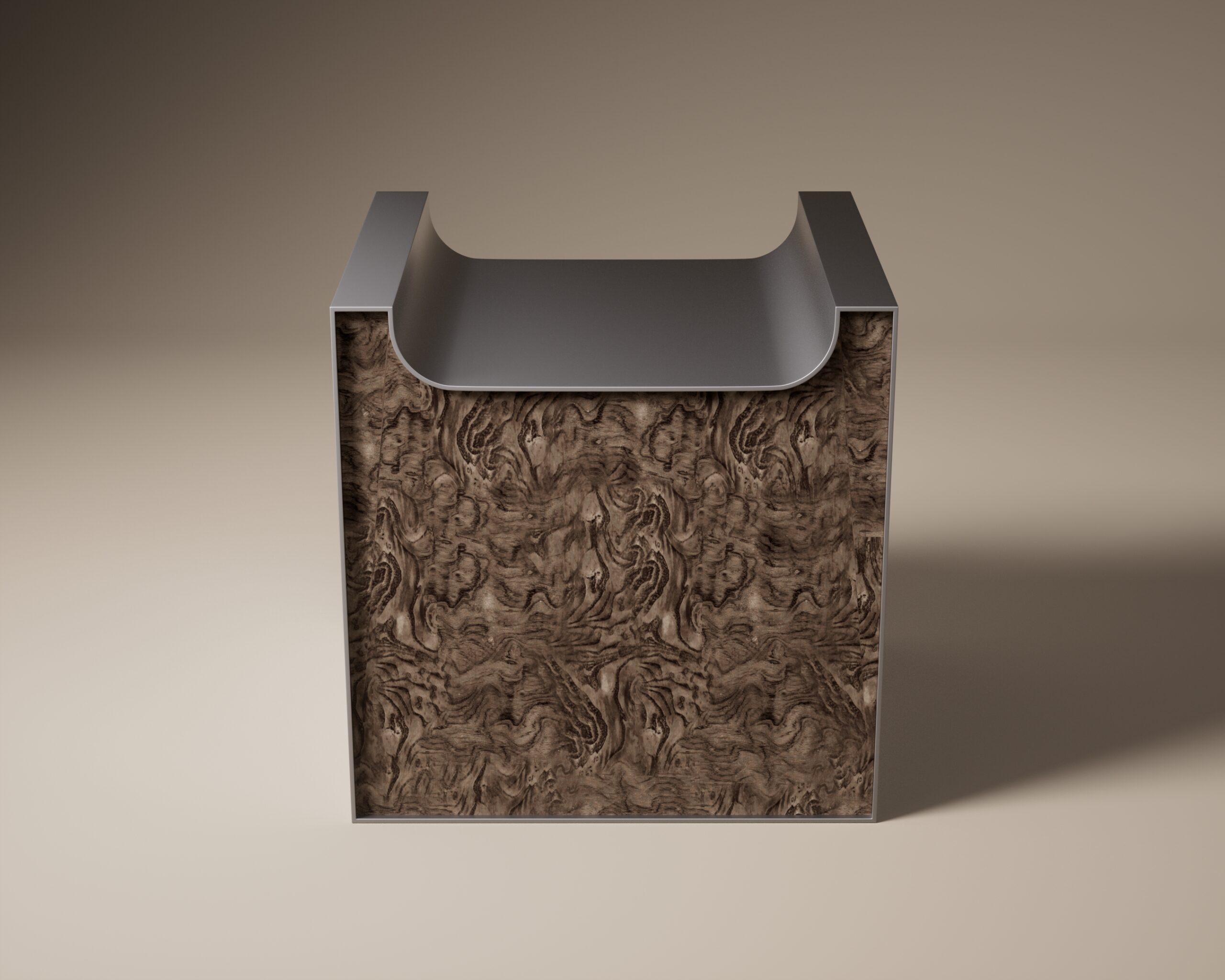 The CANYON side table is a study in tectonic volume and carved interiority. Part of our Design Studio Collection, the piece is defined by its monolithic cubic silhouette, which is dramatically interrupted by a deep, radiused “canyon” slice through its center. The primary exterior faces are finished in a highly figured burl wood, showcasing a dense, swirling grain that provides an organic contrast to the table’s rigid geometry. This rich timber shell encases a seamless, matte earth-toned metallic interior. The soft, U-shaped curve of the inner volume creates a protected “cradle” for objects, while the clean material transition at the edges emphasizes the piece’s architectural precision. The CANYON balances the primitive warmth of burl wood with a sophisticated, subtractive form, offering a bold sculptural accent for contemporary lounge environments.