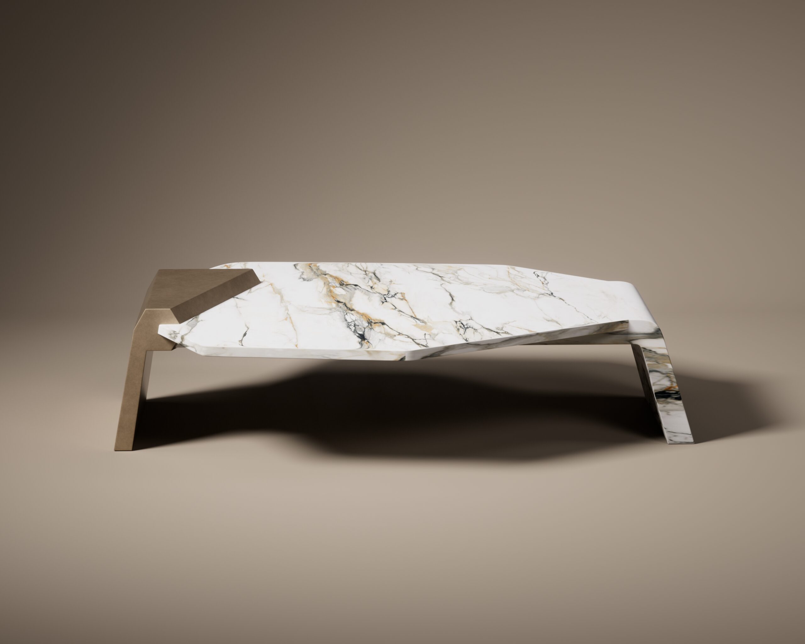 The CARA center table is a study in geometric tension and fluid materiality. Part of our Design Studio Collection, the piece features an expansive, low-profile Calacatta marble surface defined by its dramatic veining and an asymmetrical, organic footprint. The composition is anchored by a sharp, architectural matte champagne support that interlocks with the stone, creating a sophisticated dialogue between the cool weight of the marble and the refined warmth of the metallic hardware.