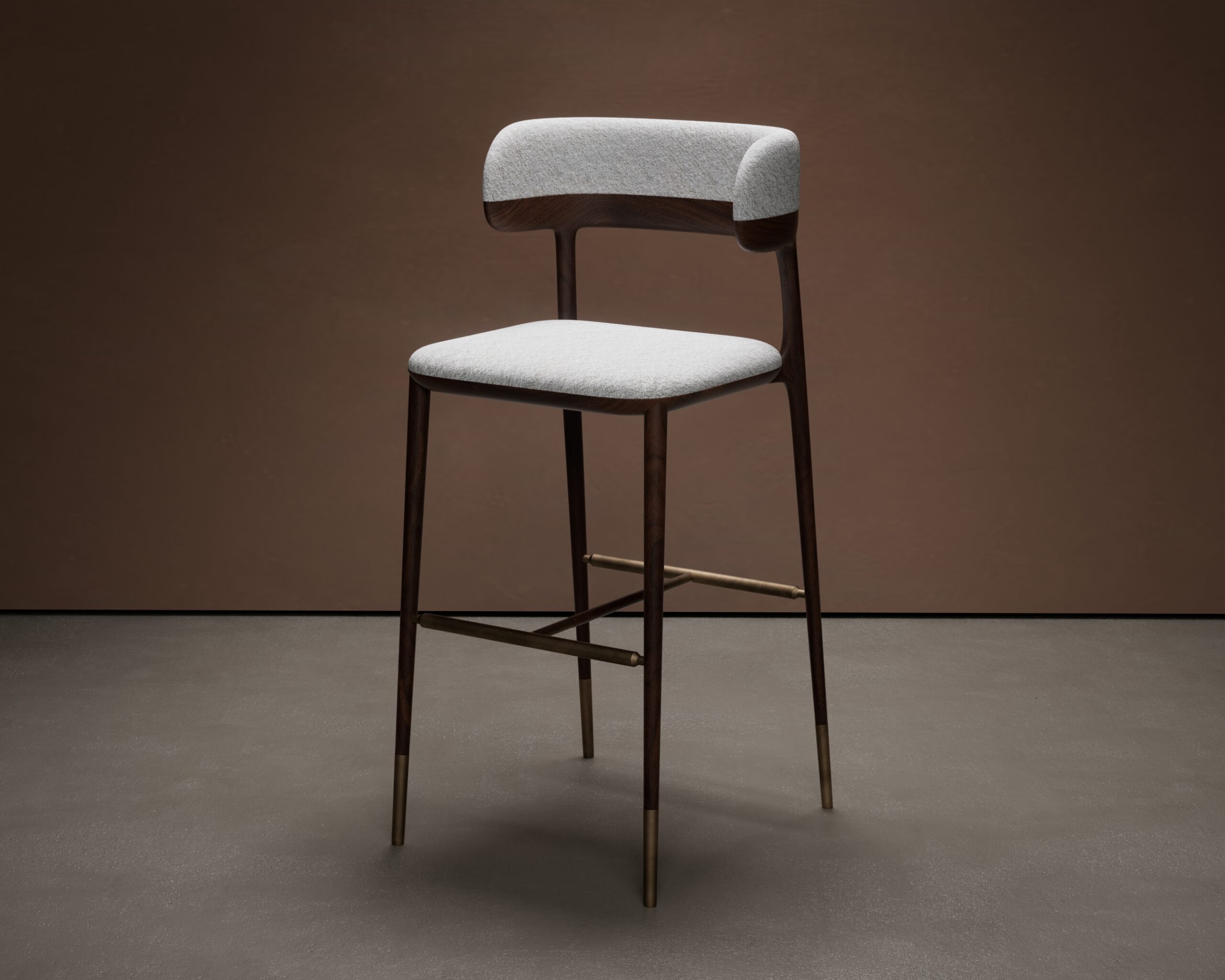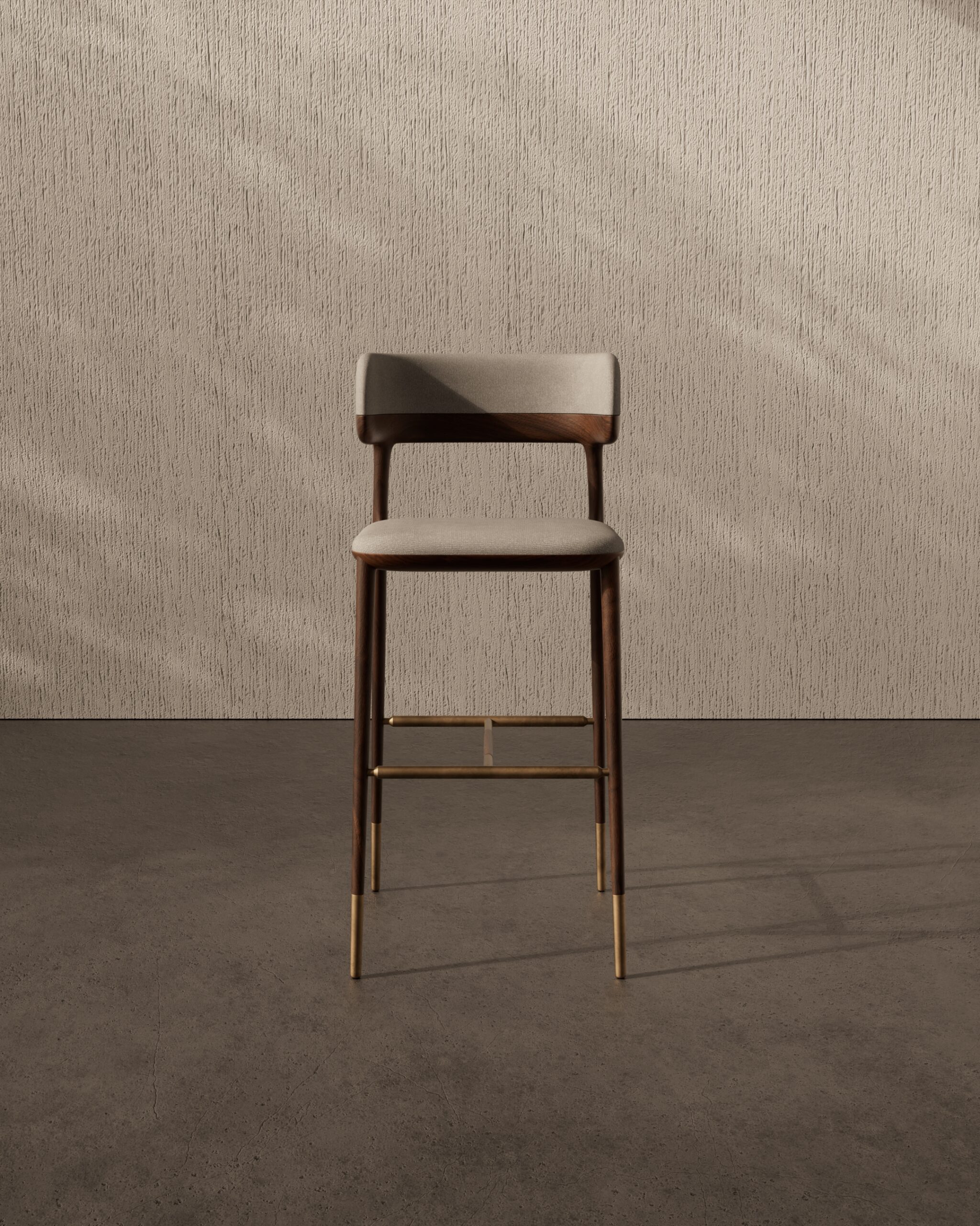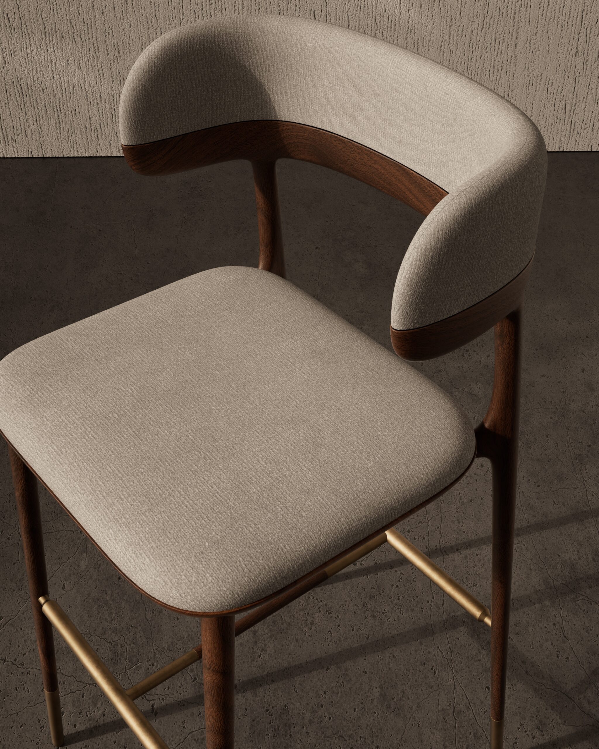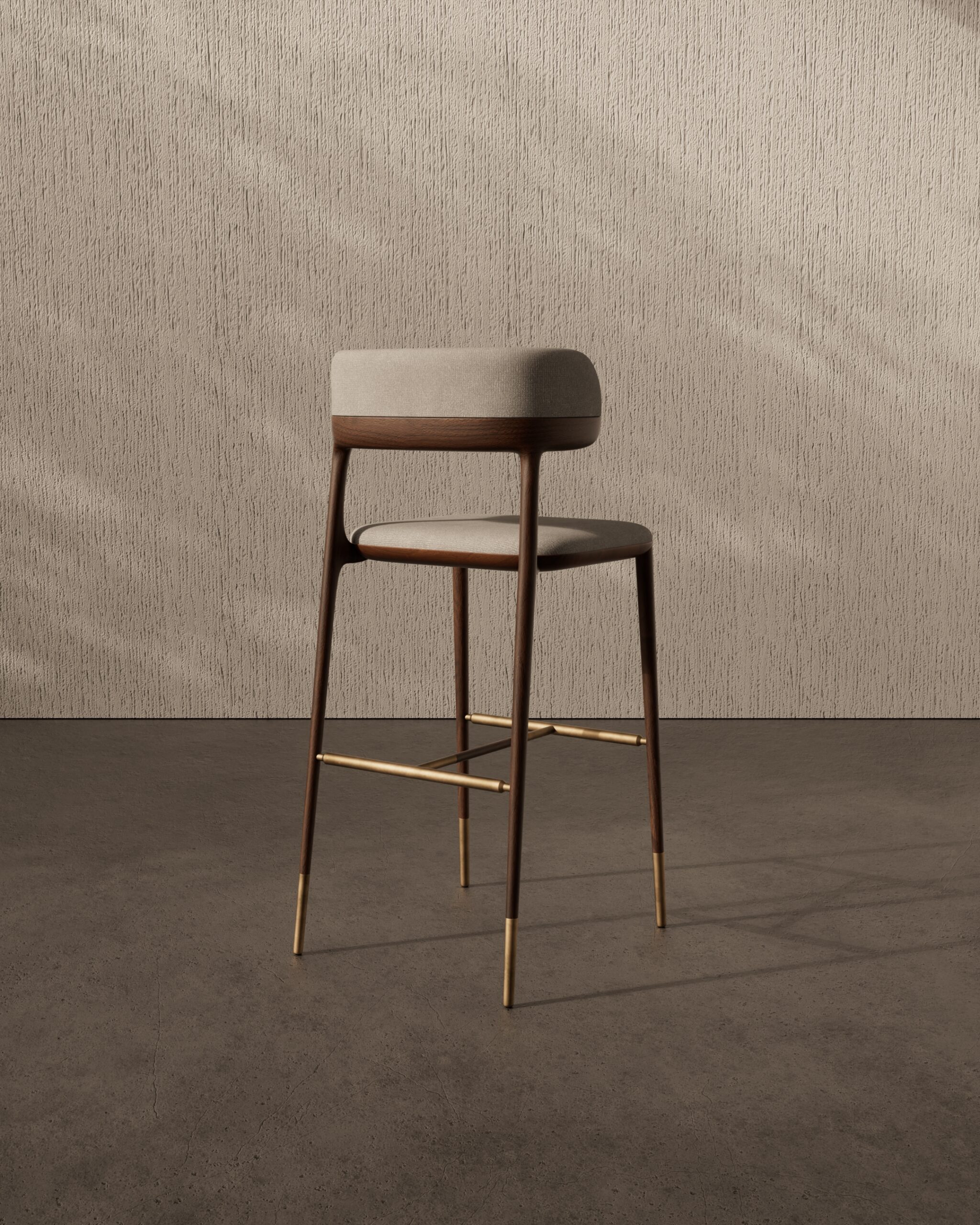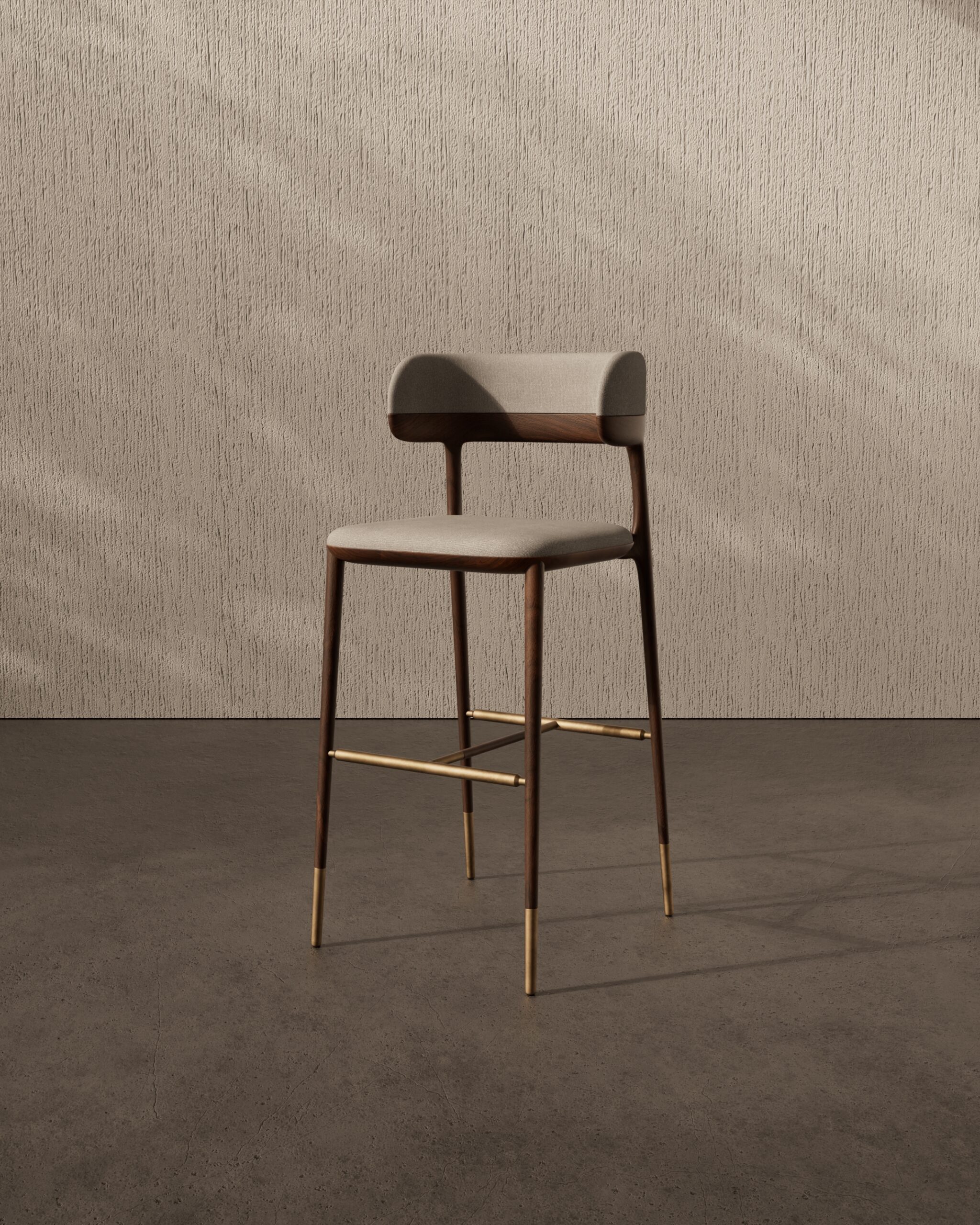 The CAYDEN bar stool is a study in mid-century refinement and structural lightness. Part of our Design Studio Collection, it features a low-profile, curved backrest upholstered in a taupe performance textile, which is elegantly cradled by a solid walnut frame. The stool is elevated by slender wooden legs tipped in satin brass ferrules, connected by a minimalist geometric footrest. This balanced combination of warm wood tones and delicate metallic accents creates a sophisticated, airy silhouette for modern bar and counter spaces.