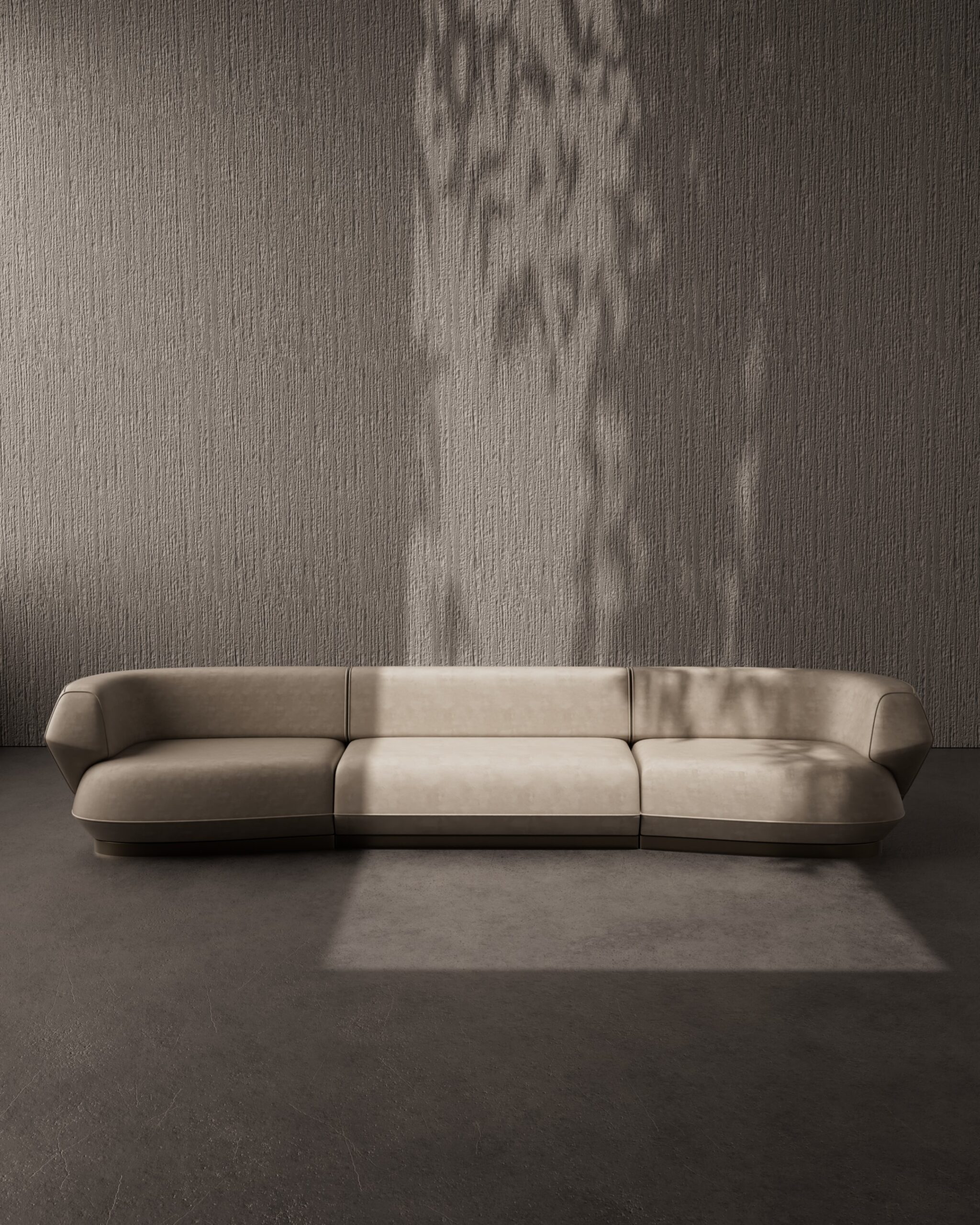 The CELESTE is a study in fluid modularity and understated luxury. Its elongated silhouette is composed of three seamless sections, unified by a continuous, low-profile backrest that curves gently into the arms to create a sense of embrace. The design emphasizes horizontal lines and grounded comfort, while the premium nubuck upholstery adds a tactile, velvety depth that softens the modern form.