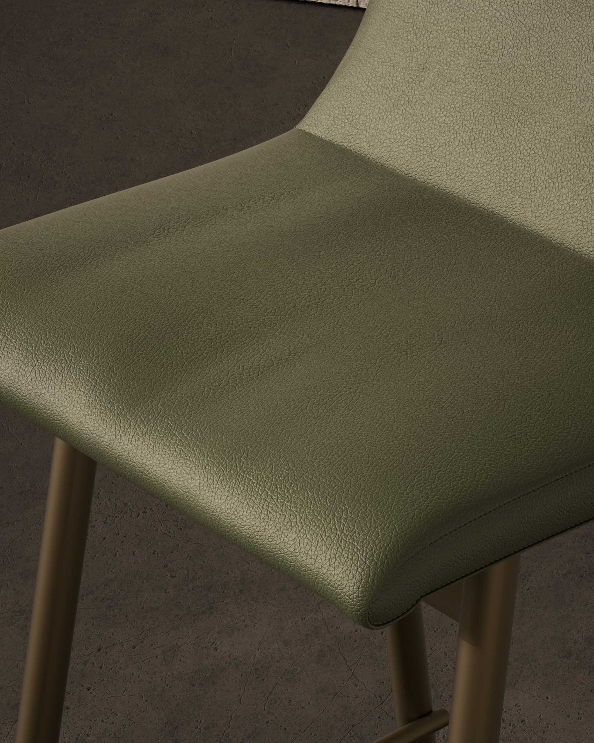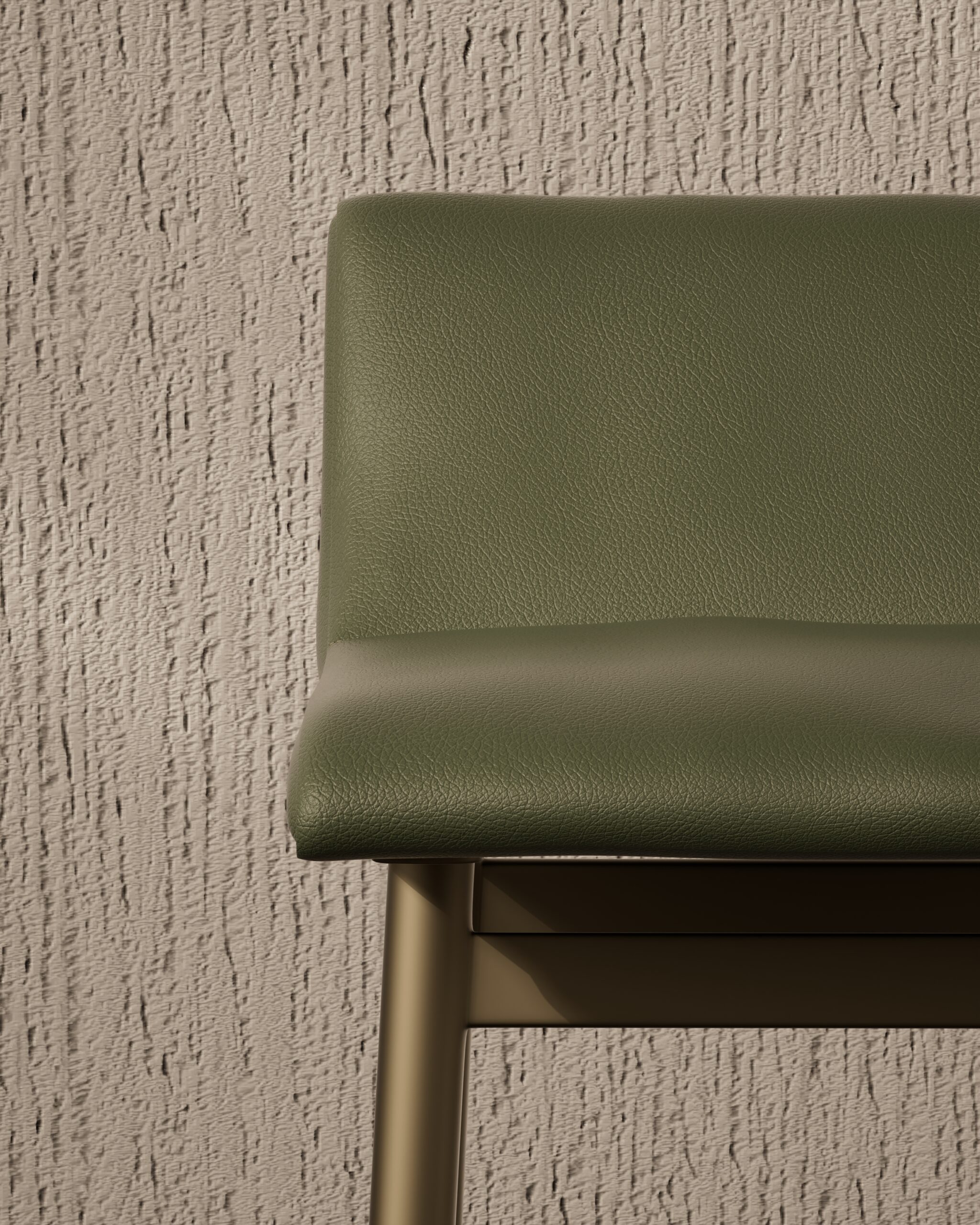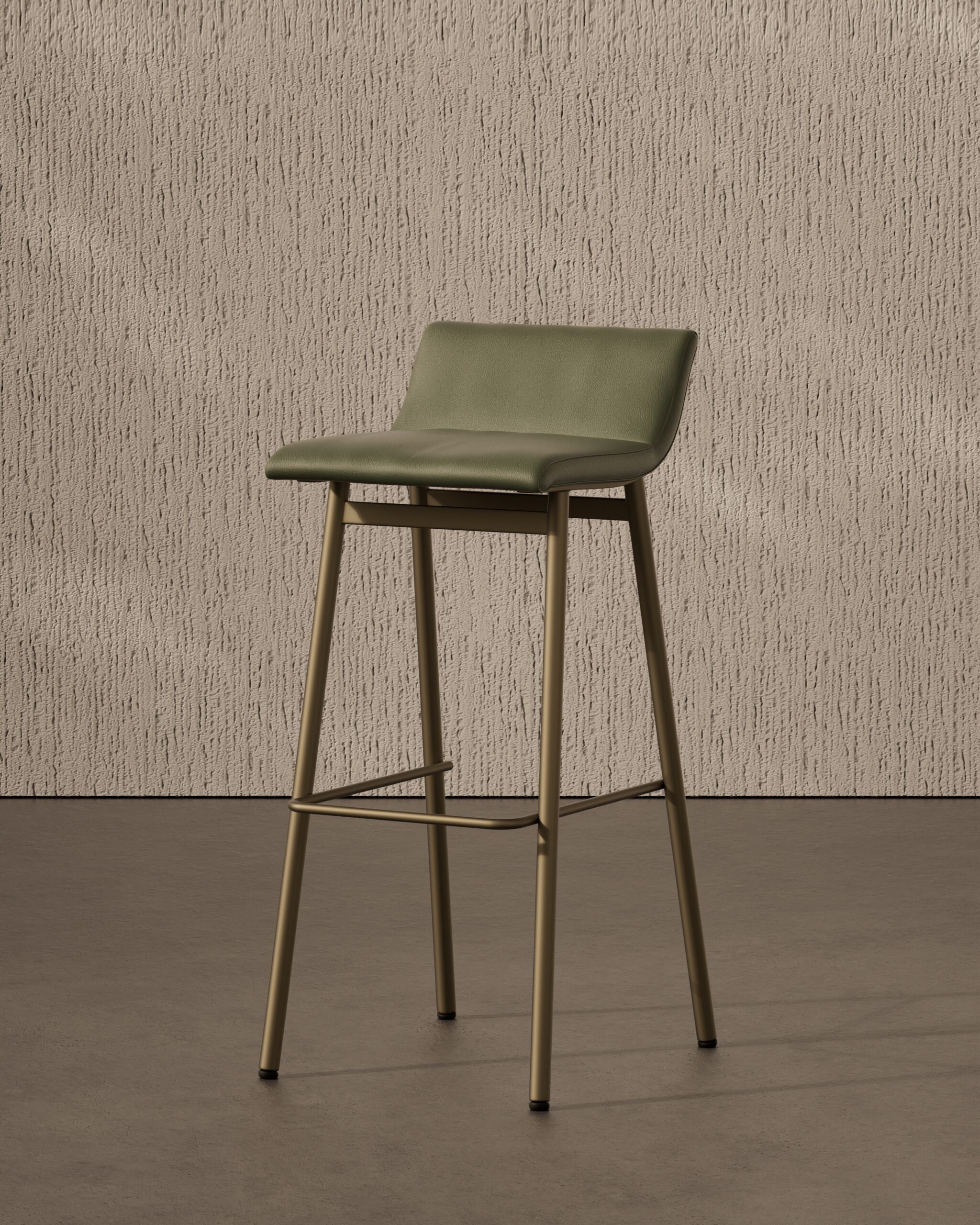 The CELESTIAL bar stool is a study in minimalist poise and ergonomic precision. Part of our Design Studio Collection, it features a low-profile seat upholstered in a sophisticated matte sage leather that provides a subtle, organic texture. The design is anchored by a slender, satin champagne metallic frame with an integrated footrest, offering a light and airy architectural silhouette. This interplay between the soft, muted tones of the leather and the precise geometry of the metal frame makes the CELESTIAL an elegant and understated addition to any modern bar or counter space.