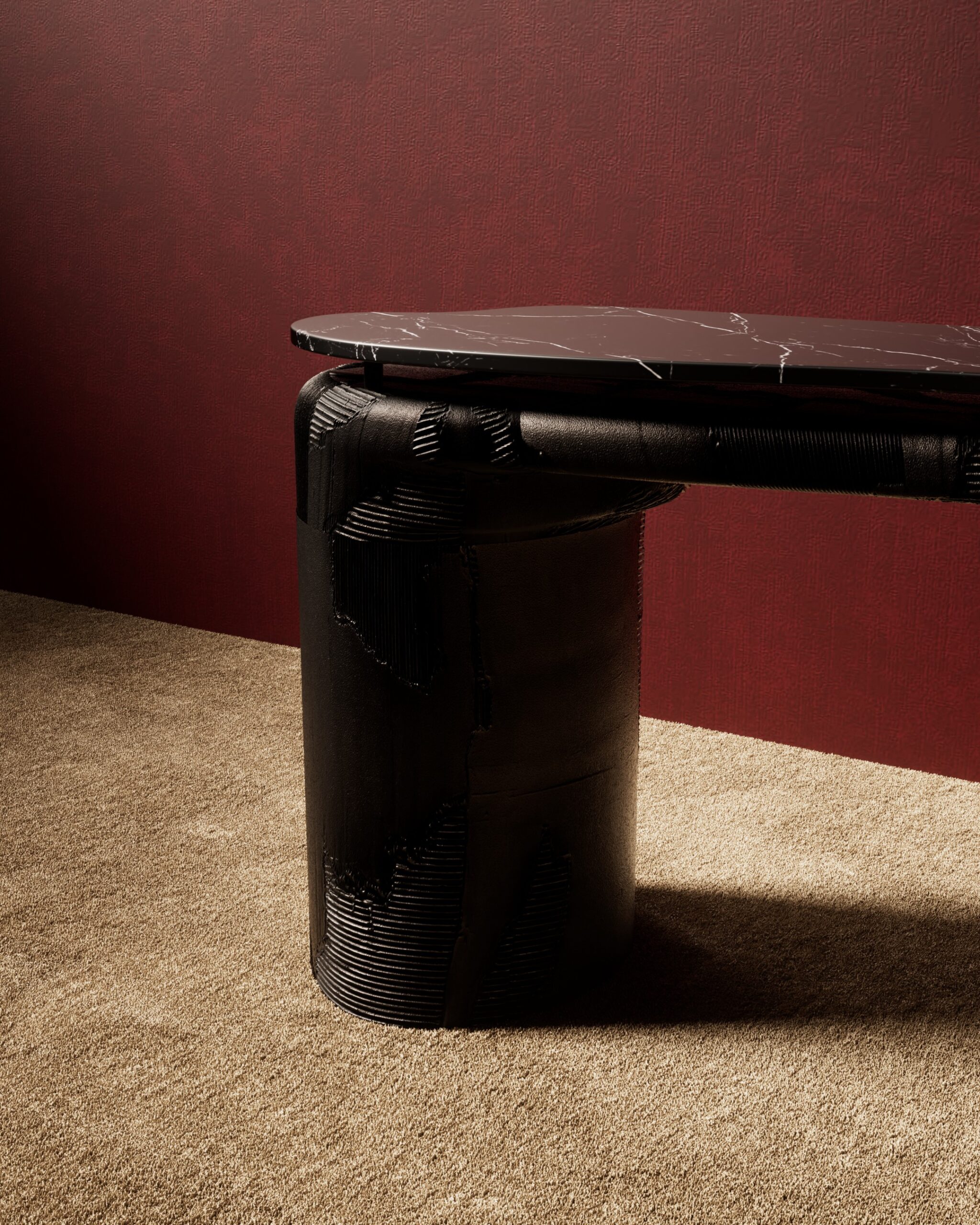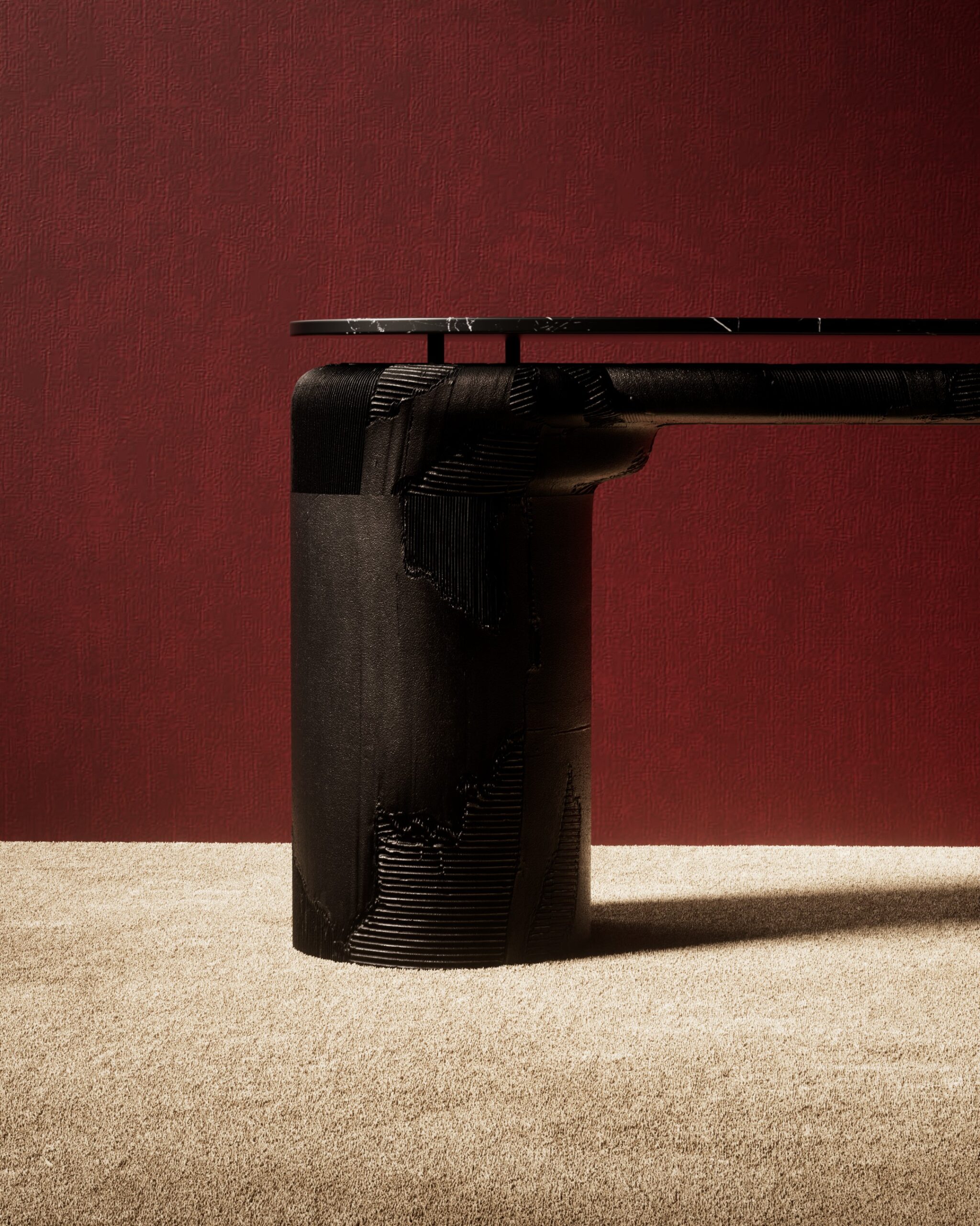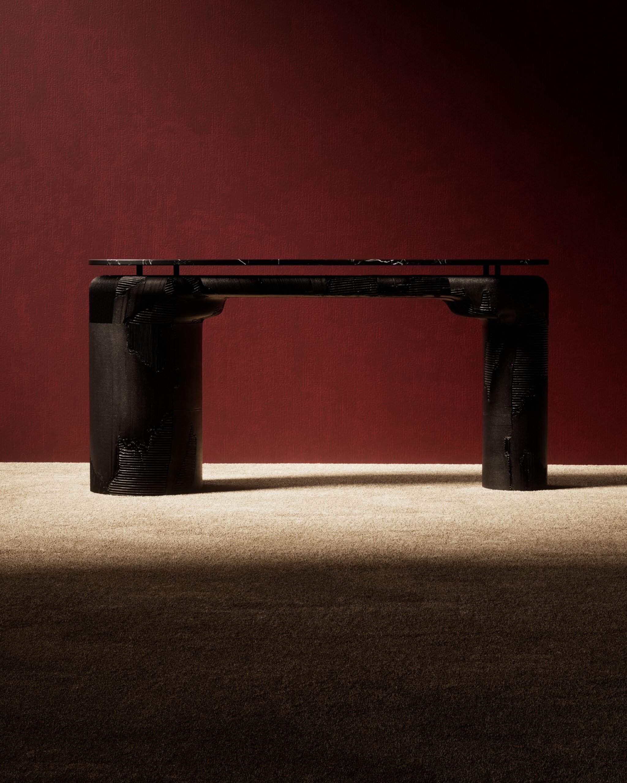 The CHISELED console is a study in tectonic suspension and raw materiality. Part of our Design Studio Collection, this collectable piece features an expansive, irregular top of Nero marquina marble, characterized by its deep black surface and striking white veining. The stone appears to hover, supported by thin metallic spacers above a substantial textured charcoal base. The base is composed of two massive cylindrical pedestals joined by a horizontal beam, all featuring a unique, multi-layered “chiselled” effect that mimics weathered geological strata or industrial casting. This juxtaposition of a polished, ancient stone with a rugged, architectural foundation creates a powerful sculptural presence for sophisticated entryways and galleries.