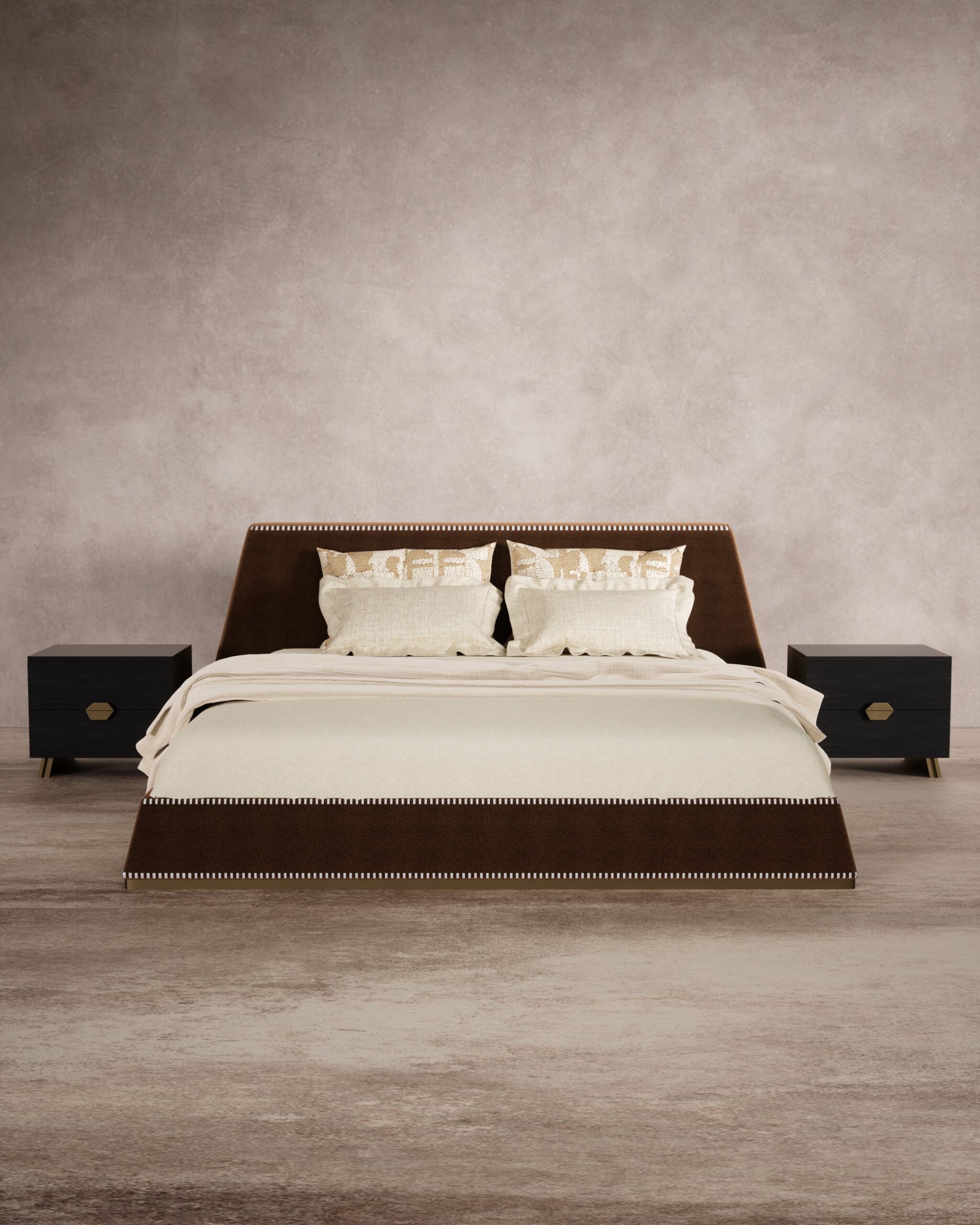 The CLOVER bed is a masterclass in tailored sophistication with a graphic twist. Its defining feature is the crisp, striped piping detail—resembling a classic ticking stripe—that traces the upper edge of the tapered headboard and the perimeter of the base, adding a sharp visual boundary to the warm, plush brown upholstery. This refined textile work is complemented by matching dark wood nightstands, which feature unique hexagonal brass drawer pulls and angular metallic feet, grounding the design in modern luxury.