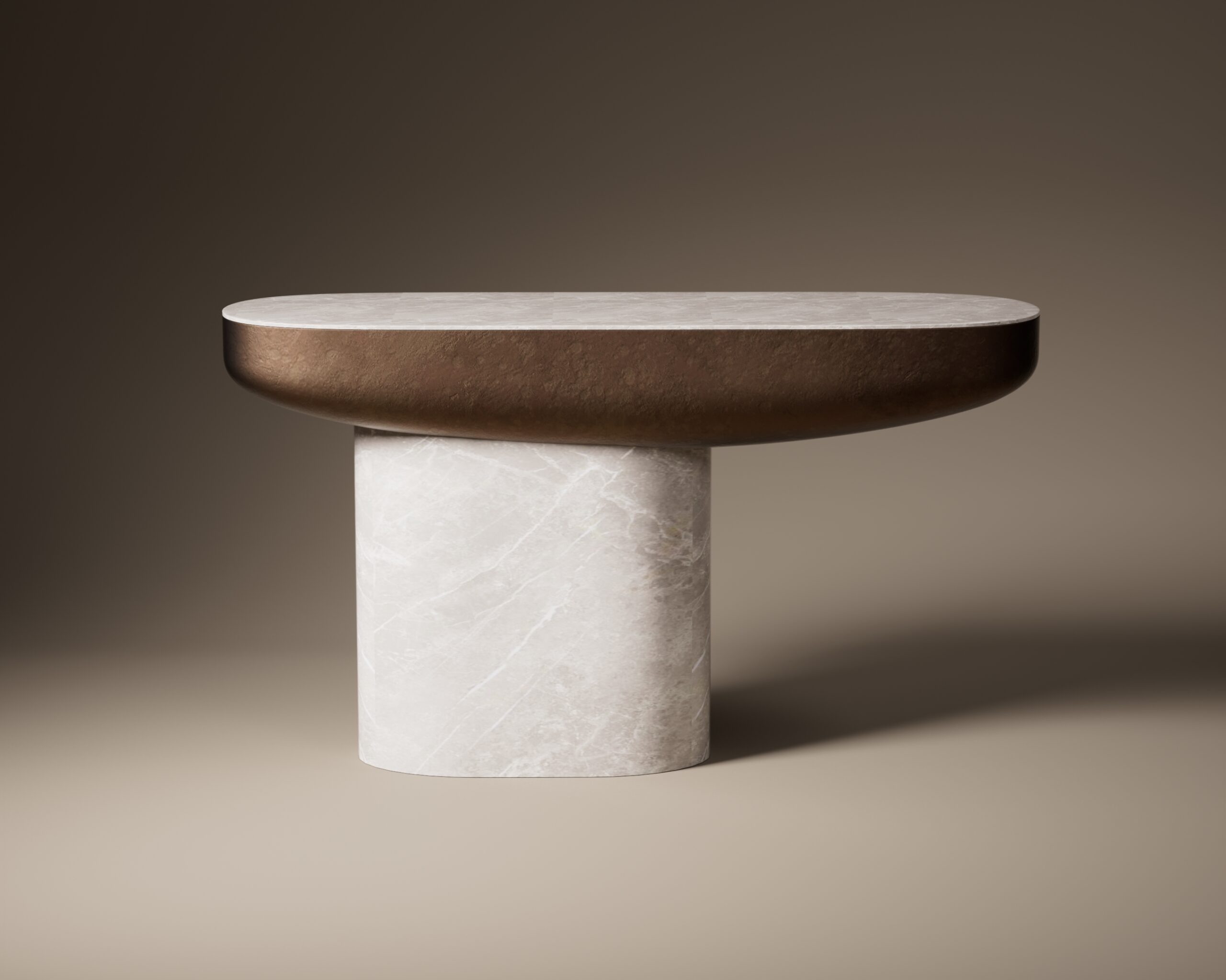 The CREST console is a study in sculptural poise and material weight. Part of our Design Studio Collection, the piece features a substantial oval pedestal carved from cream marble, showcasing fine, organic veining throughout its volume. This heavy foundation supports an expansive, asymmetrical stone surface that appears to taper into a delicate, aerodynamic edge. The design is defined by its namesake “crest”—a thick, aged bronze metallic shroud that envelopes one end of the table, creating a bold textural contrast between the polished cool of the marble and the warm, weathered patina of the metal.