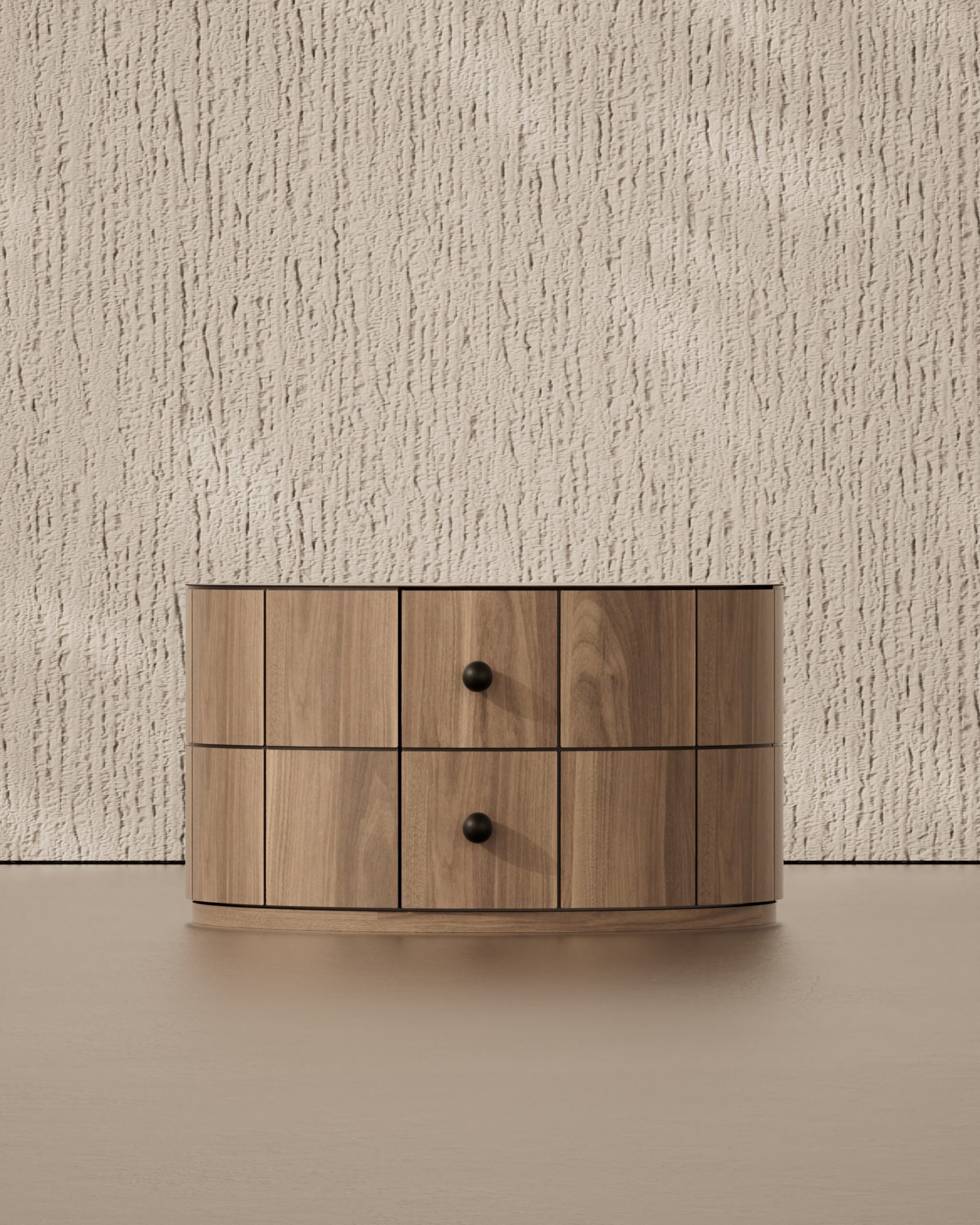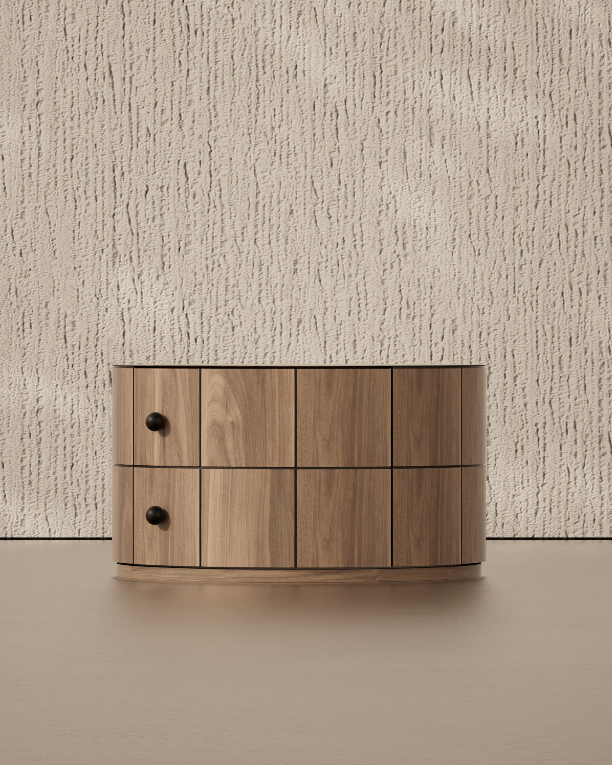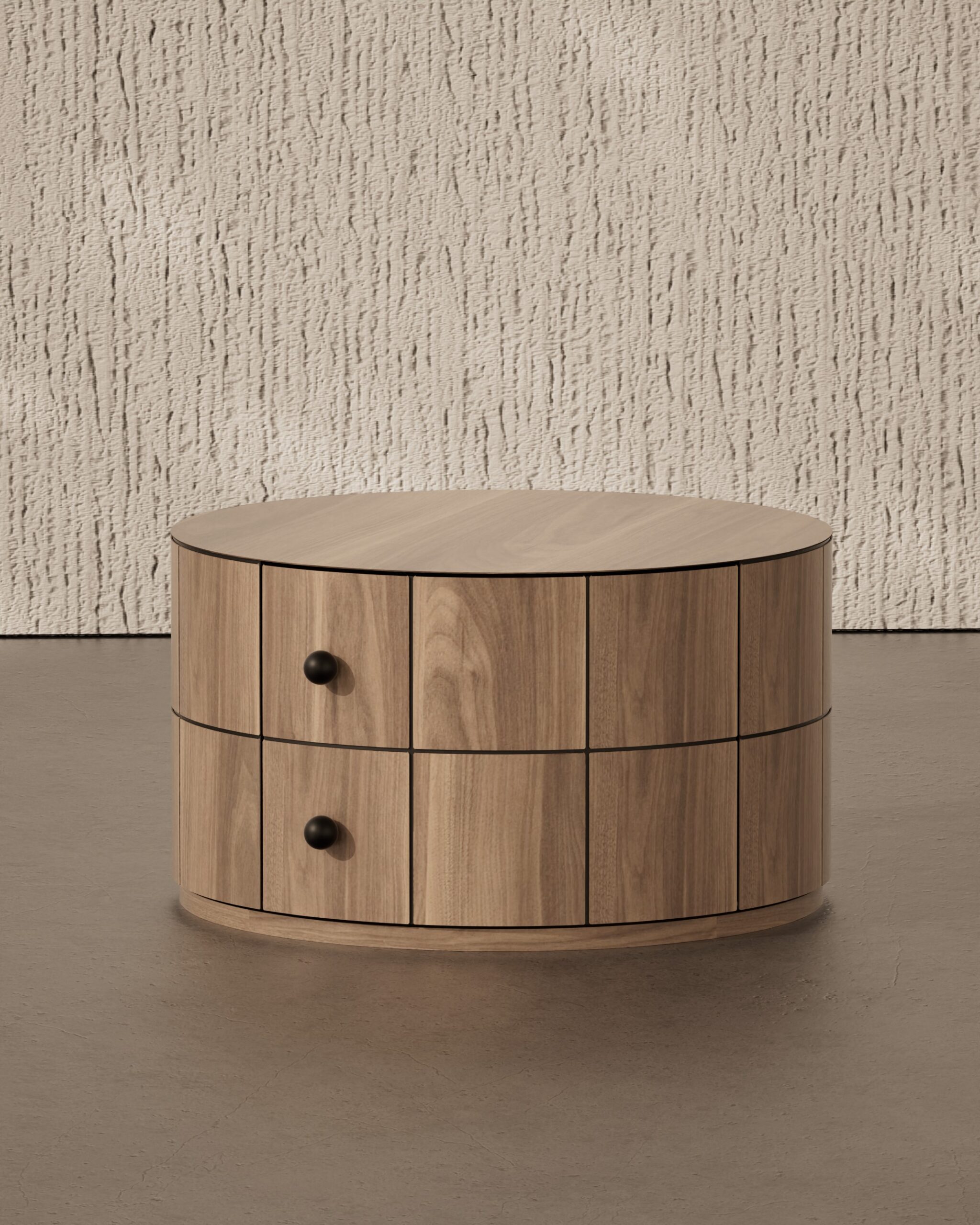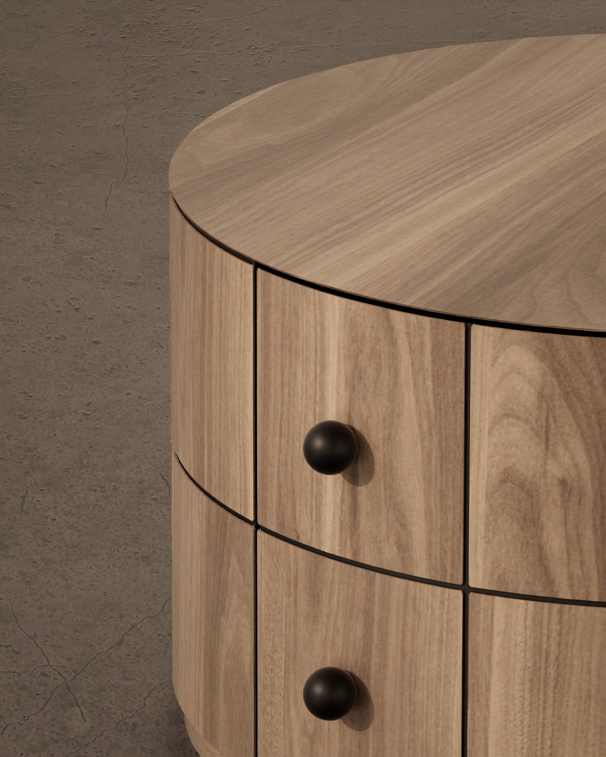 The CRIMSON bedside table is a celebration of organic geometry and warm materiality. The piece features a perfect cylindrical drum shape, wrapped in a vertical wood veneer that highlights the natural grain structure. The design is subtly segmented into vertical quadrants that cleverly integrate the two stacked drawers, which are punctuated by simple, matte black spherical knobs for a touch of modern contrast. A recessed plinth base lifts the form slightly, giving the substantial wooden piece a lighter presence.