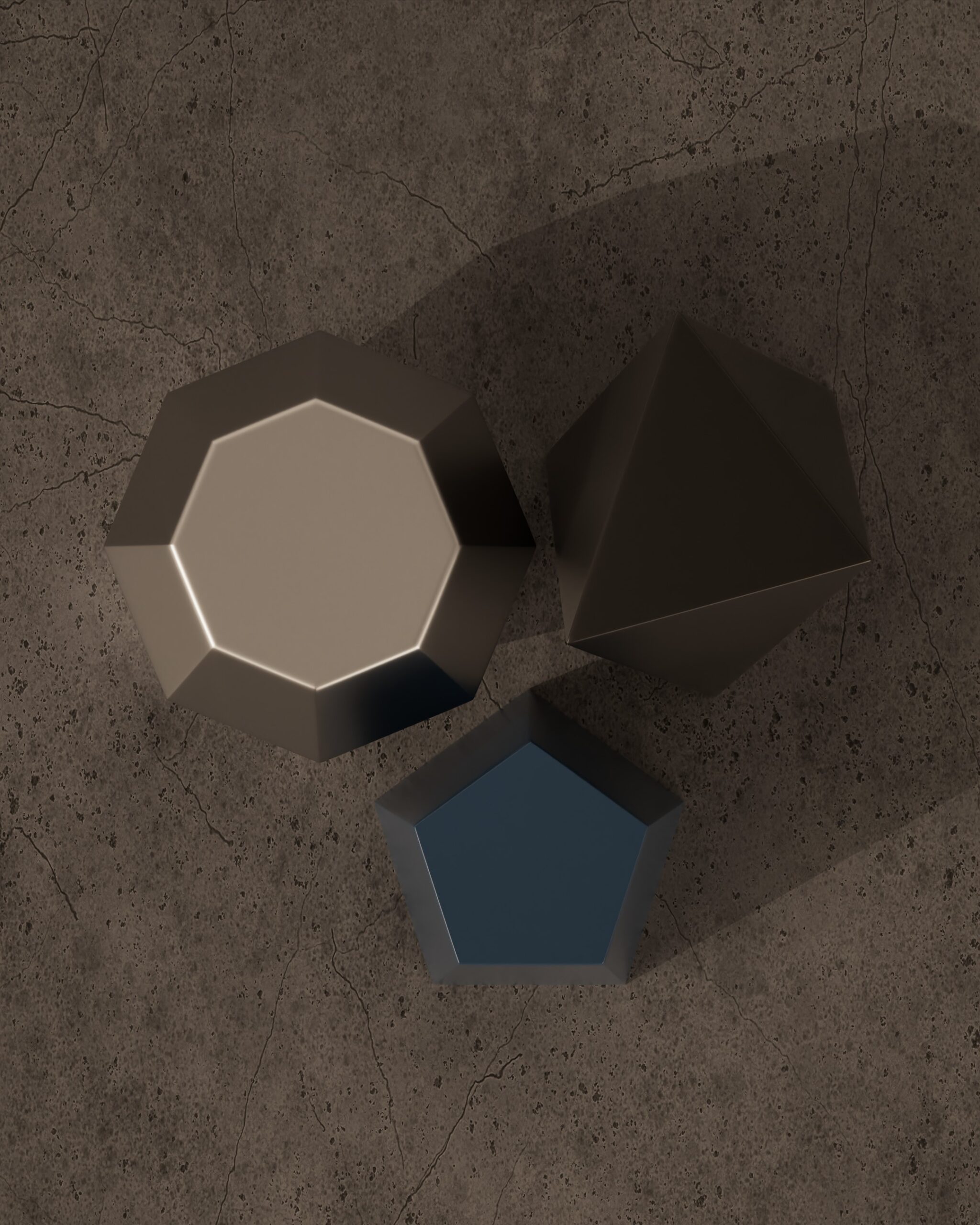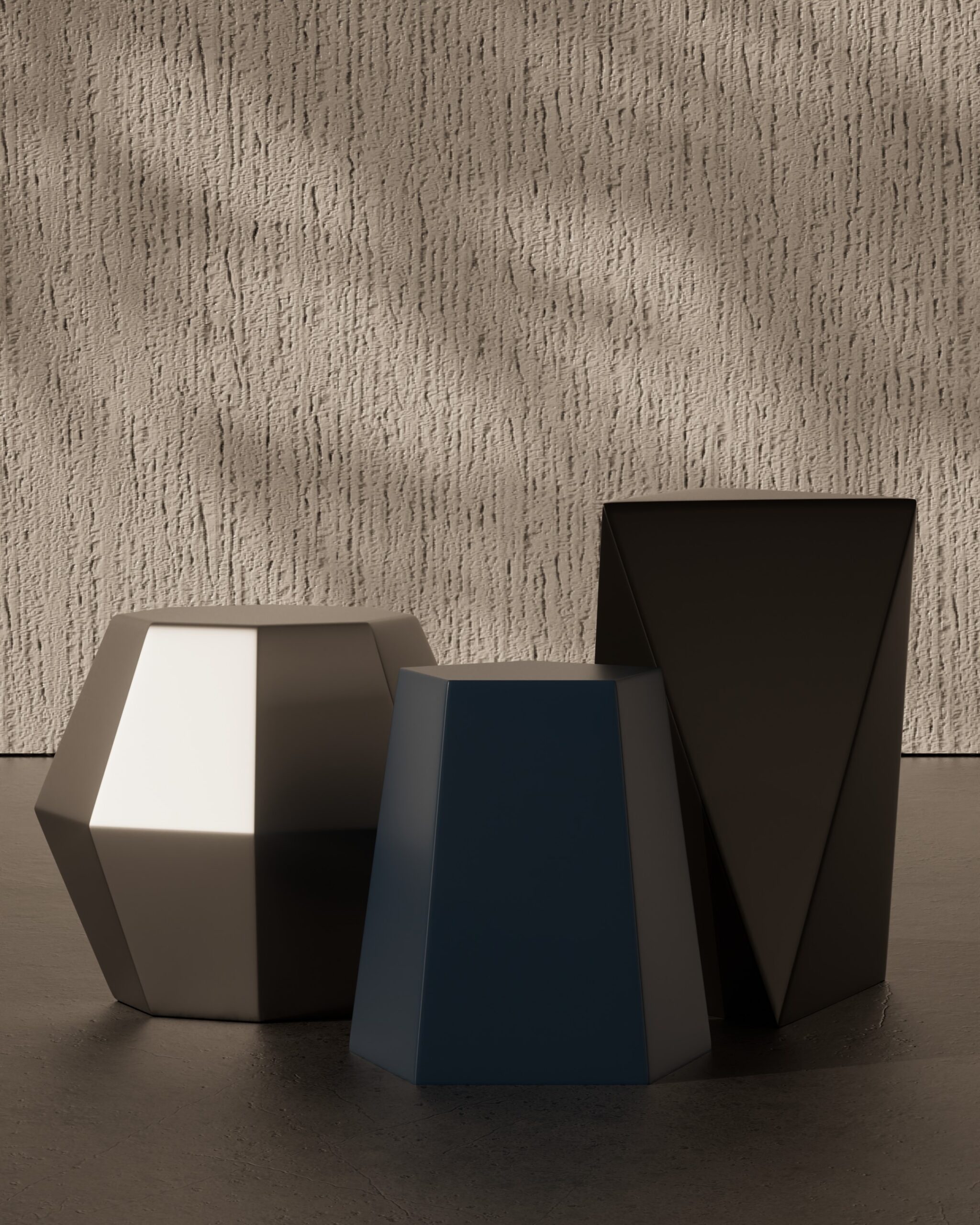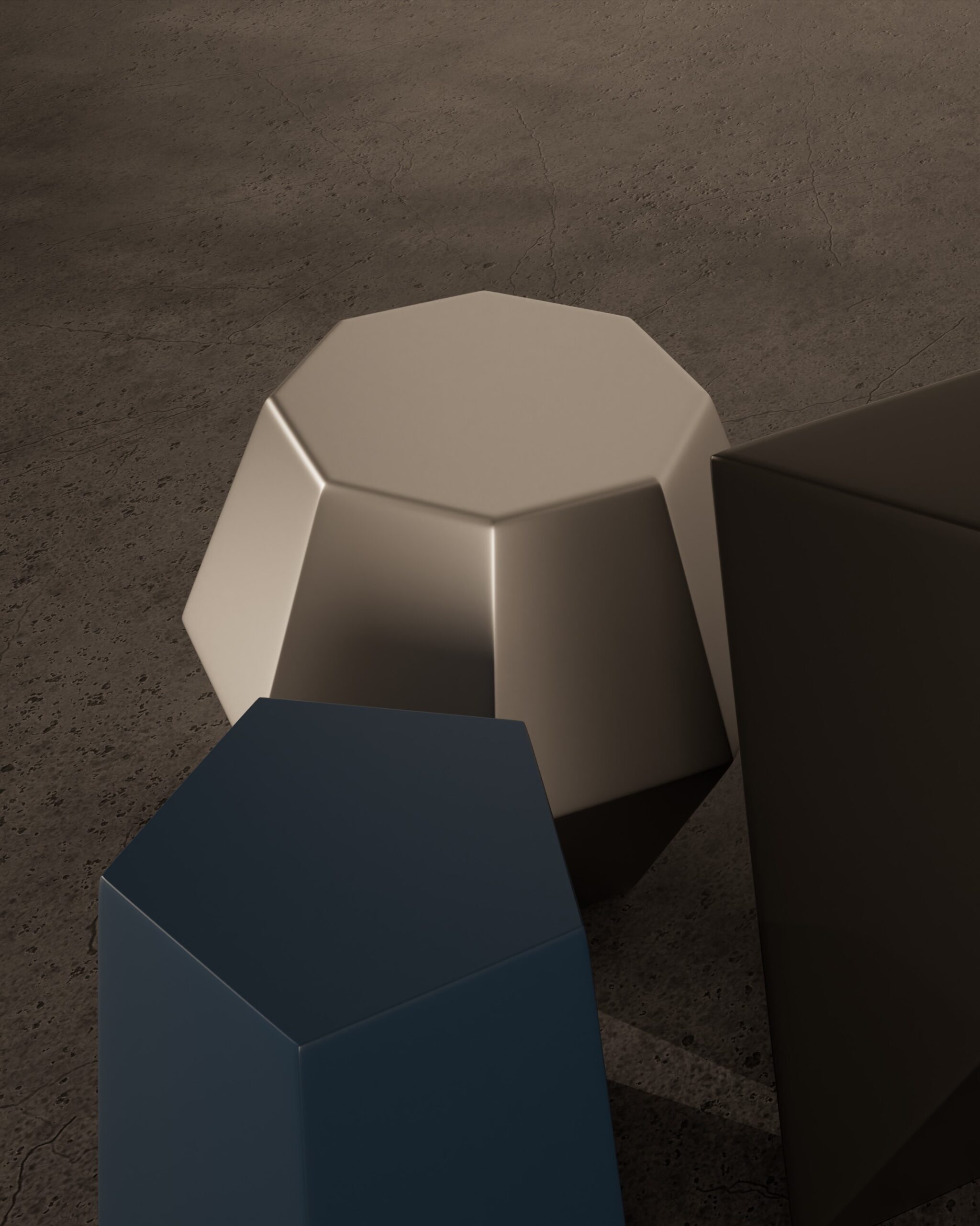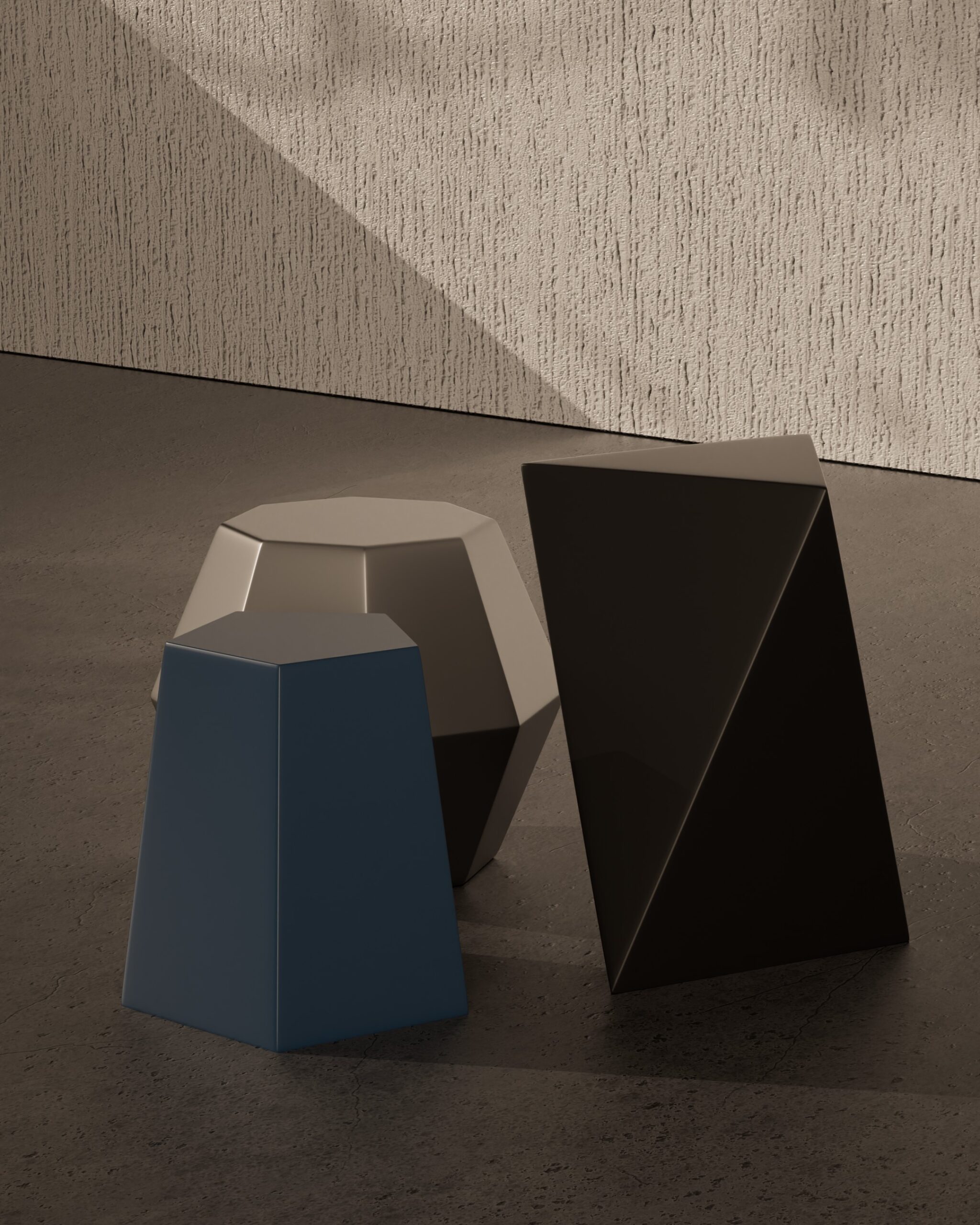 The CRYSTALLINE side table is an exploration of mathematical precision and fragmented geometry. Part of our Design Studio Collection, this piece functions as a modular ensemble of three distinct, multi-sided volumes. Each element is defined by its sharp, angular facets that mimic the natural growth patterns of mineral formations. The set features a sophisticated tonal palette: a low, wide decagon in matte champagne, a mid-height pentagonal column in slate blue, and a tall, slender triangular prism in charcoal. By allowing these geometric “crystals” to be rearranged or nested, the CRYSTALLINE balances a rigid, architectural aesthetic with playful versatility, offering a dynamic focal point for modern lounge and gallery environments.