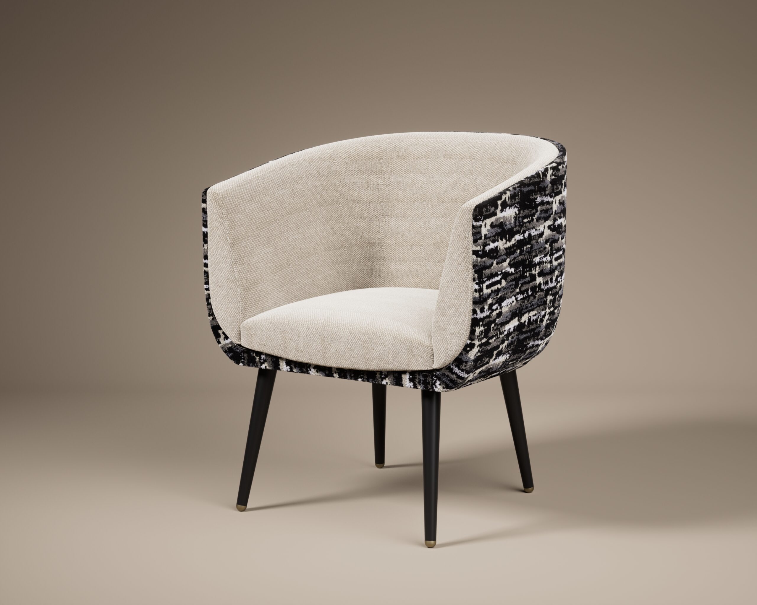 The CUMULUS dining chair is an exploration of volumetric comfort and graphic contrast. As a signature piece in the Luxury Collection, it reimagines the traditional tub chair through a lens of high-end materiality. The chair is anchored by four elegantly tapered legs in a midnight ebony finish, each capped with a subtle metallic detail at the floor for a refined architectural foundation.