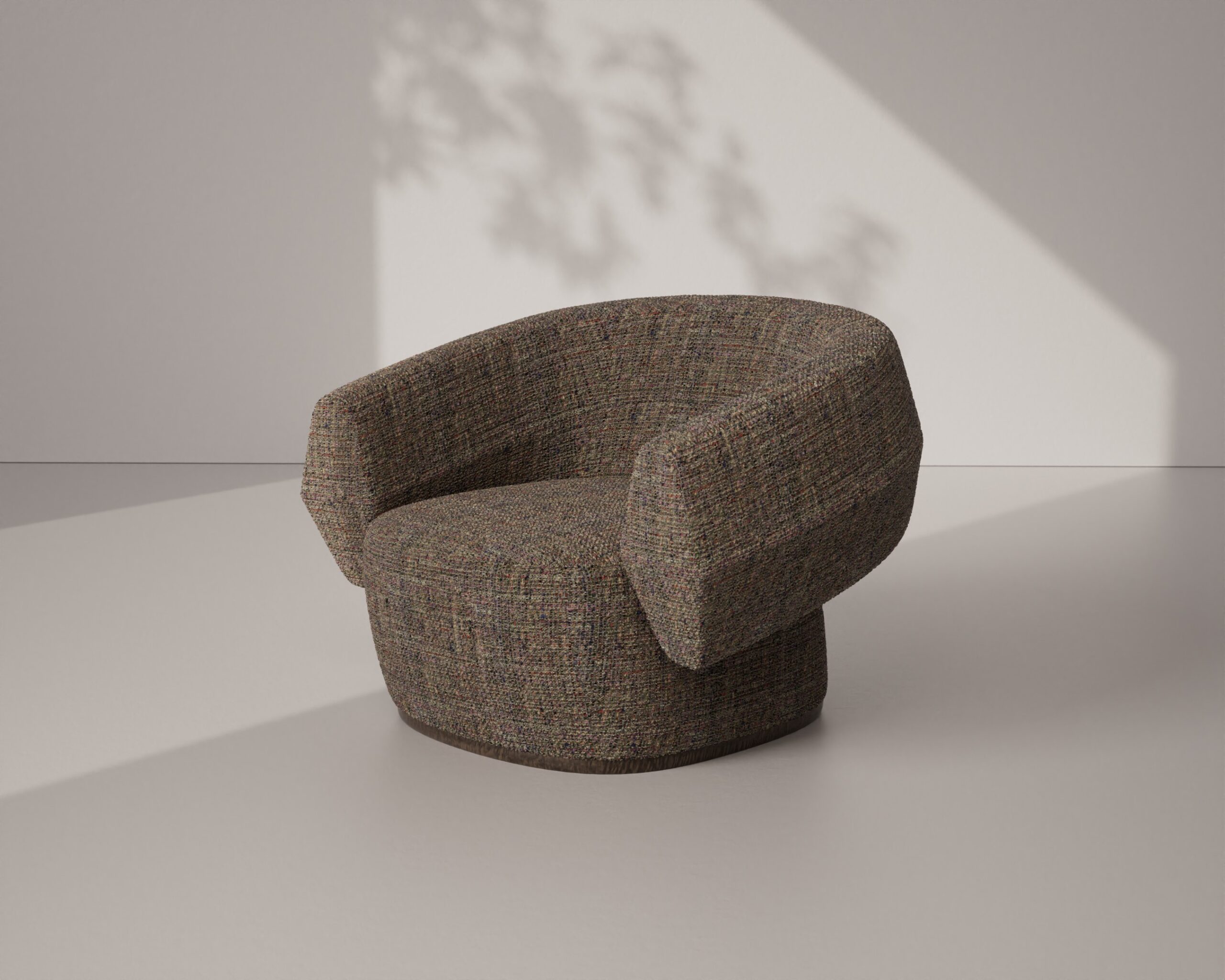 The DIAMORA armchair is an exploration of tectonic volume and textural depth. As a signature piece in our RAW Collection, it highlights the unrefined power of natural materials through a bold, architectural lens. The armchair is anchored by two substantial, square-profile armrests crafted from solid walnut, which showcase a rich, vertical grain and a soft-matte natural finish. These wooden monoliths cradle a deep, enveloping seat and a continuous curved backrest, both upholstered in a heavy multi-tonal bouclé. The fabric’s intricate weave—a blend of earthy browns, greys, and subtle ochre—provides a raw, tactile counterpoint to the smooth precision of the walnut frame. Supported by a hidden, recessed wooden base that creates a floating effect, the DIAMORA balances a grounded, heavy presence with sophisticated comfort, serving as a permanent and sculptural anchor for contemporary interiors.