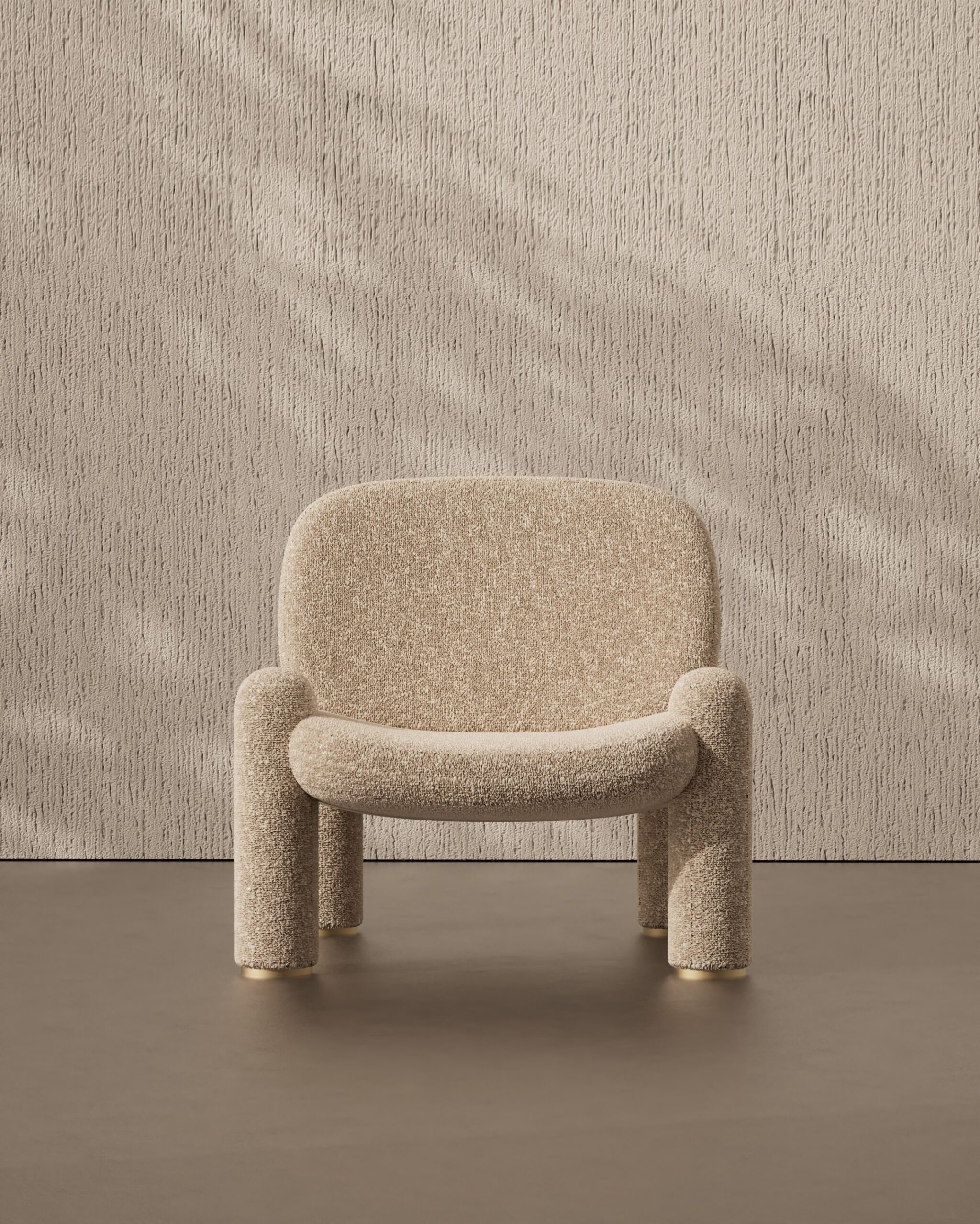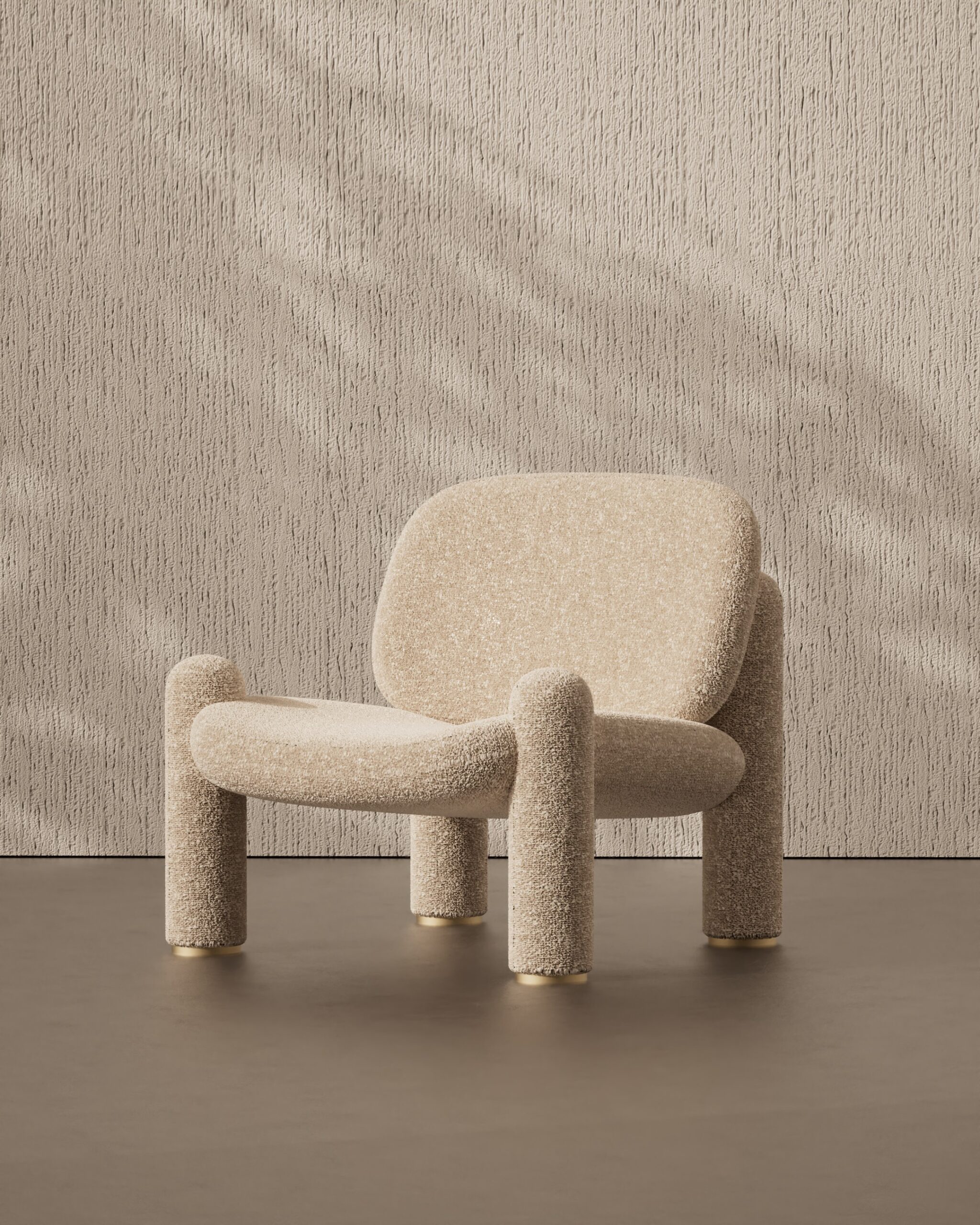 The DORA armchair is a charming study in soft geometry, embodying a playful, sculptural aesthetic. Its design is defined by four stout, cylindrical pillars that rise from the floor to act as both legs and arm supports, creating a bold, “chubby” framework. Suspended within this structure is a thick, curved seat and a pill-shaped backrest, all fully wrapped in a cozy, high-pile bouclé fabric that invites touch. Just peeking out from beneath the substantial, grounded legs are delicate brushed brass discs, adding a tiny yet deliberate hint of polish to this otherwise soft and whimsical form.