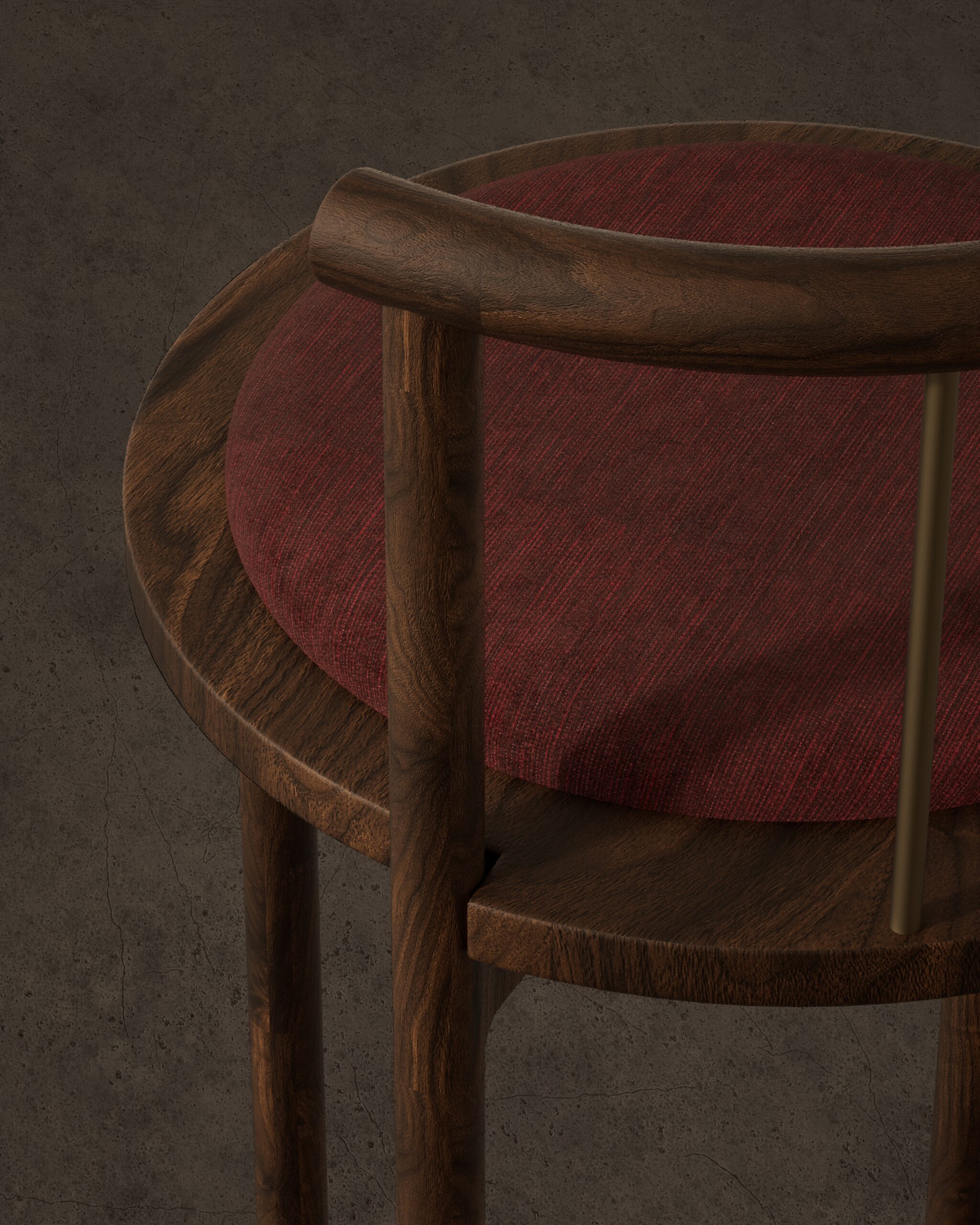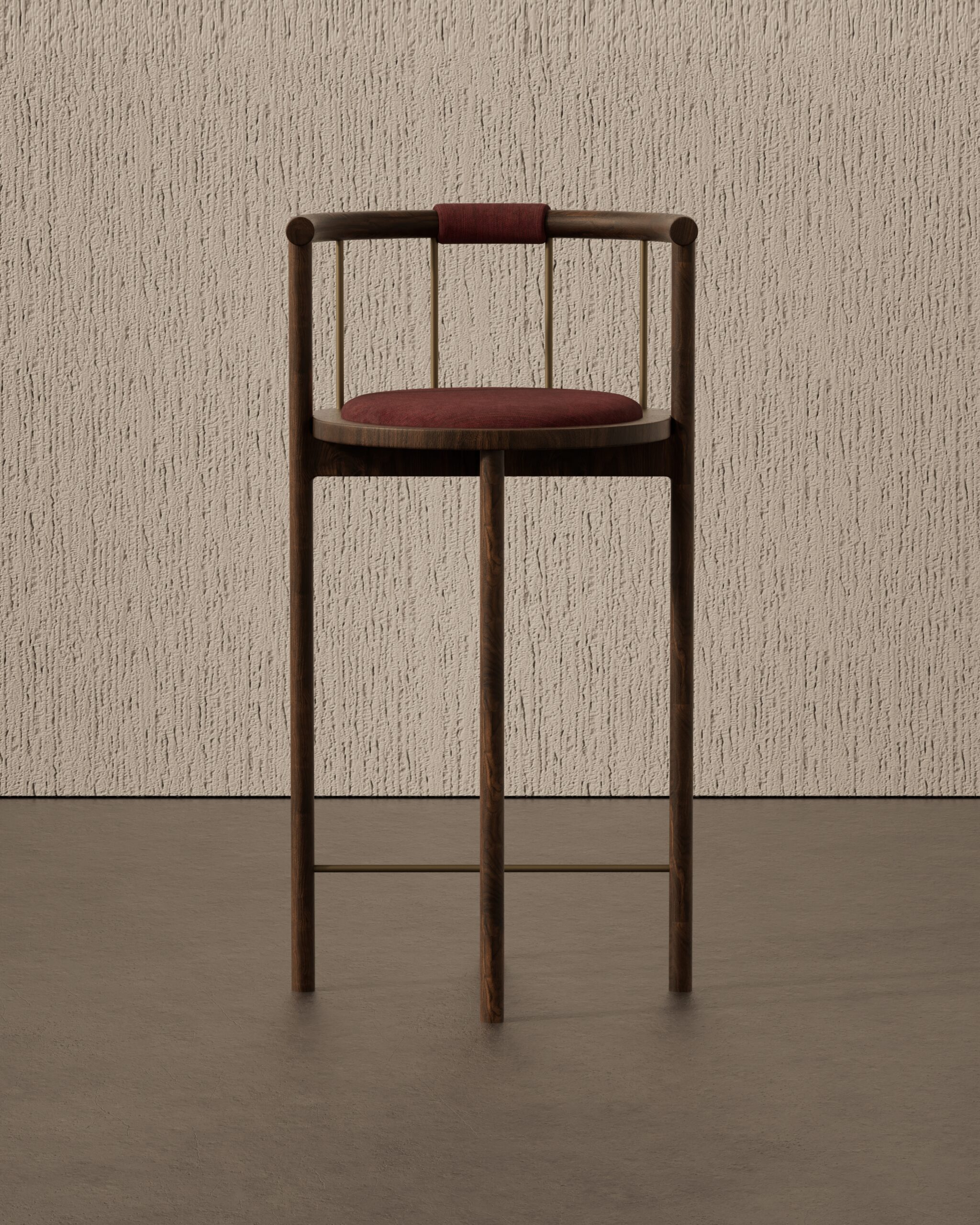 The DRACO bar stool is a study in linear transparency and refined material contrast. Part of our Design Studio Collection, it features a perfectly circular seat upholstered in a rich burgundy textile, set within a substantial dark walnut frame. The design is defined by its architectural spindle backrest, where slender brass rods support a curved wooden rail, and is grounded by four tall, tapered legs connected by a signature brass X-frame footrest. This interplay between the warmth of the wood and the jewel-like precision of the brass creates an elegant, airy silhouette for elevated bar environments.