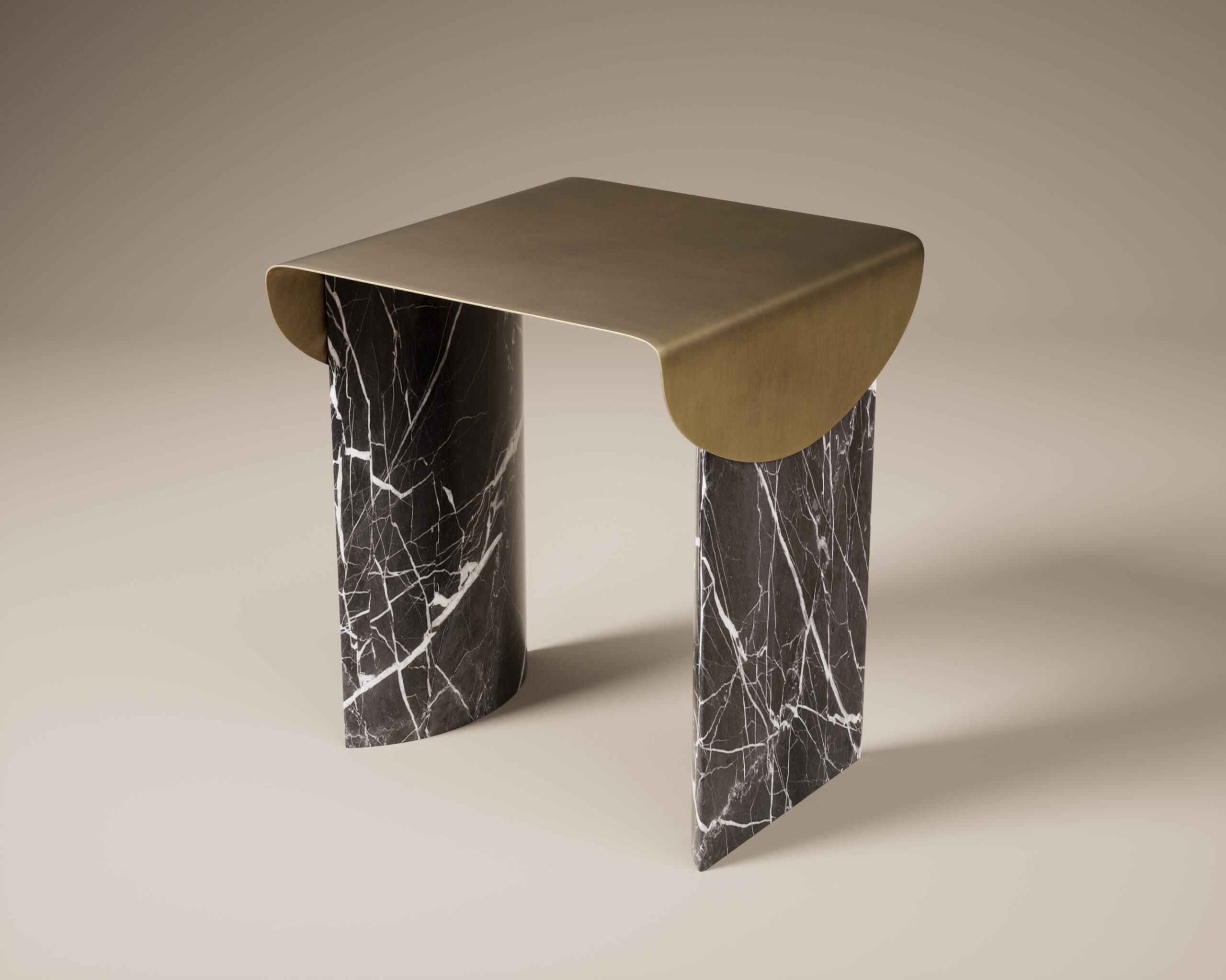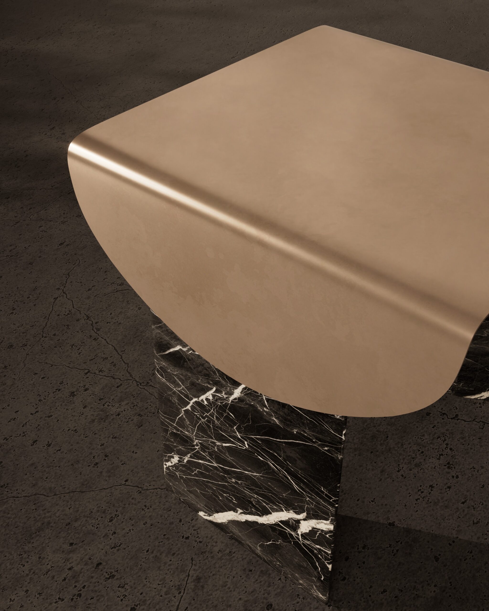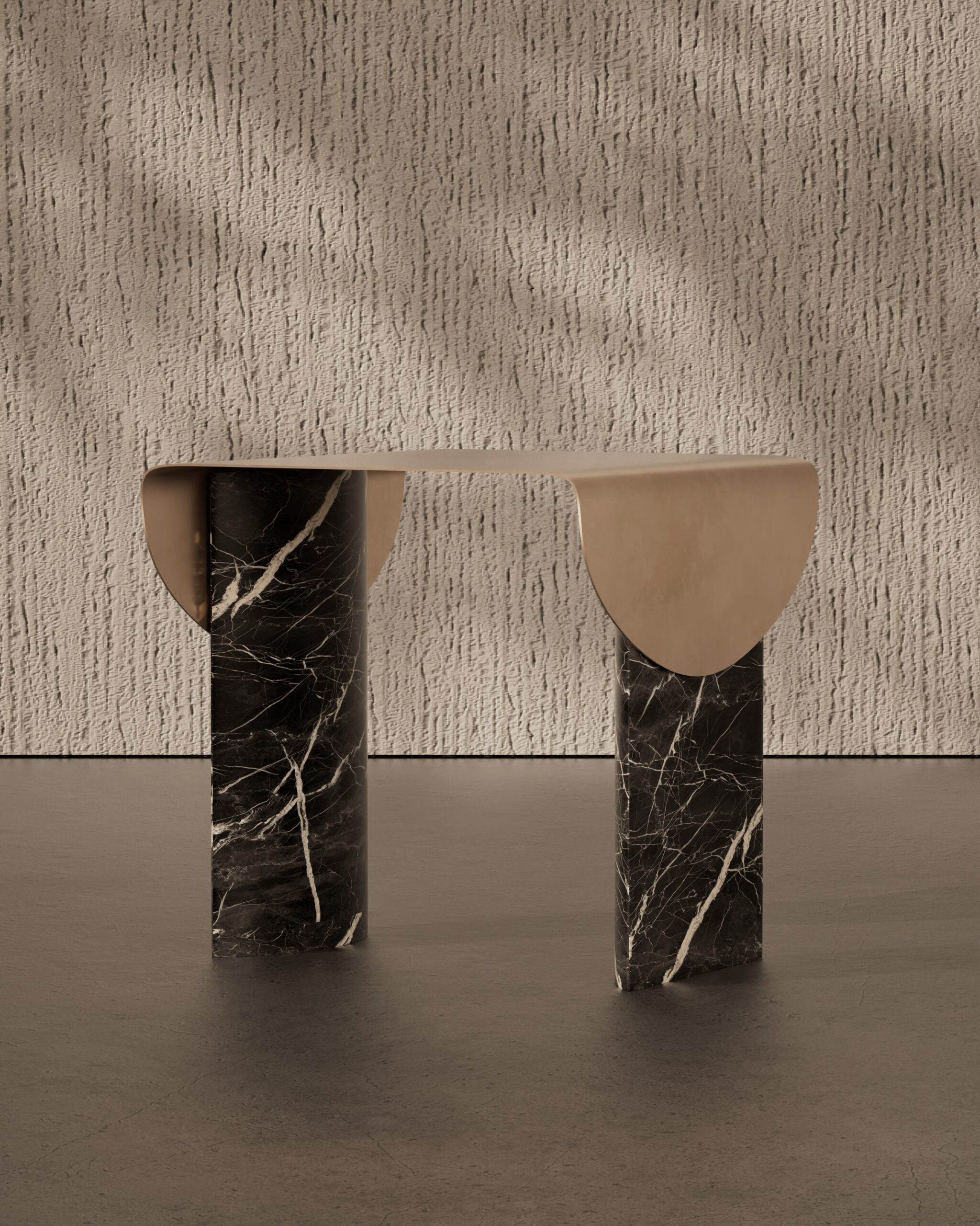 The ECLIPSE side table is a study in material tension and celestial silhouette. Part of our Design Studio Collection, the piece is defined by its ultra-thin matte champagne top, which appears to flow like liquid over its structural supports. This metallic plane terminates in two dramatic, semi-circular “flaps” that drape down the sides, partially obscuring the foundation. The table is anchored by two massive, asymmetrical pedestals crafted from deeply veined dark marble, featuring a polished finish that provides a stark textural contrast to the soft matte metal. The ECLIPSE balances the heavy, permanent presence of stone with the delicate, paper-like quality of its champagne shroud, offering a sophisticated and sculptural accent for modern interiors.