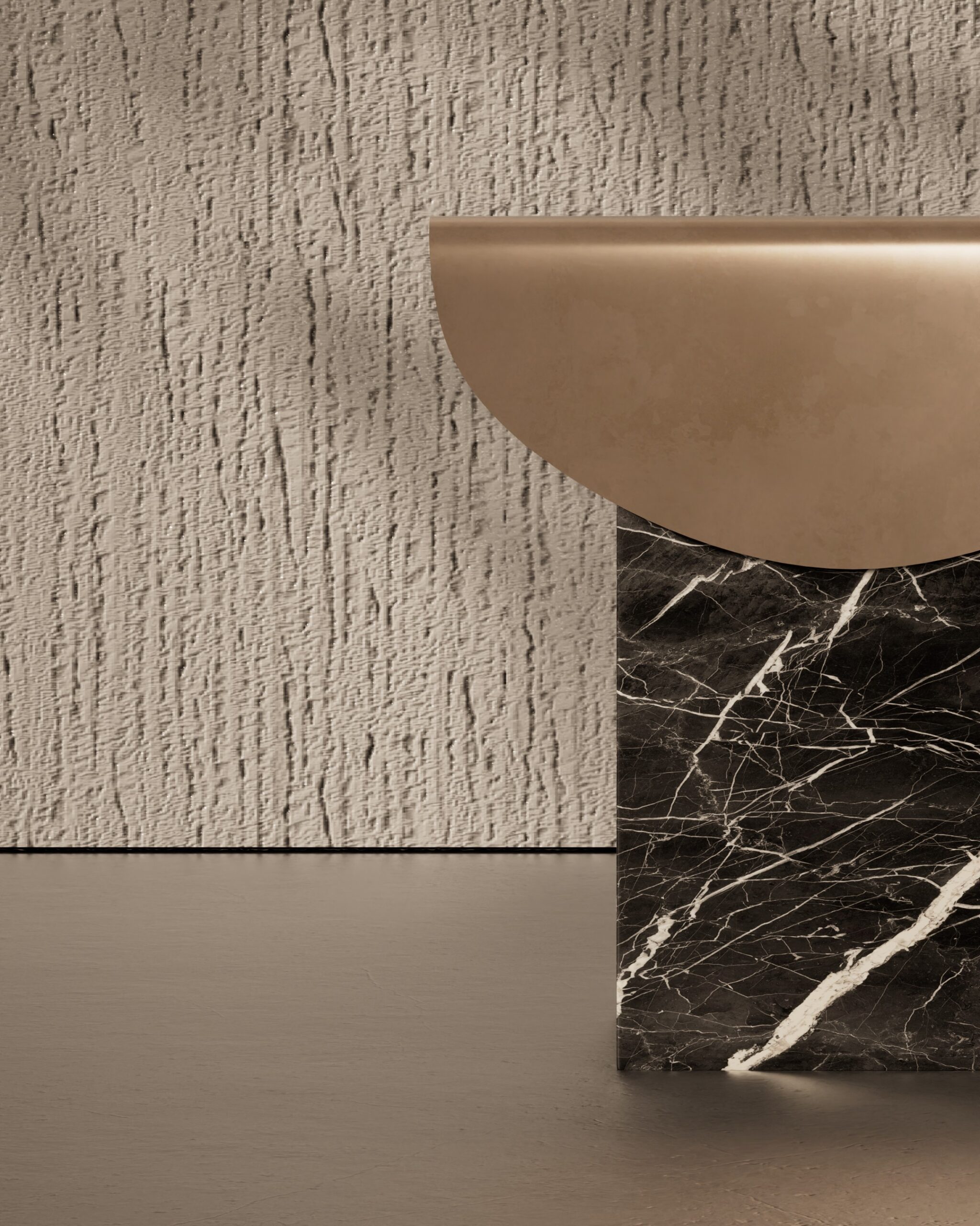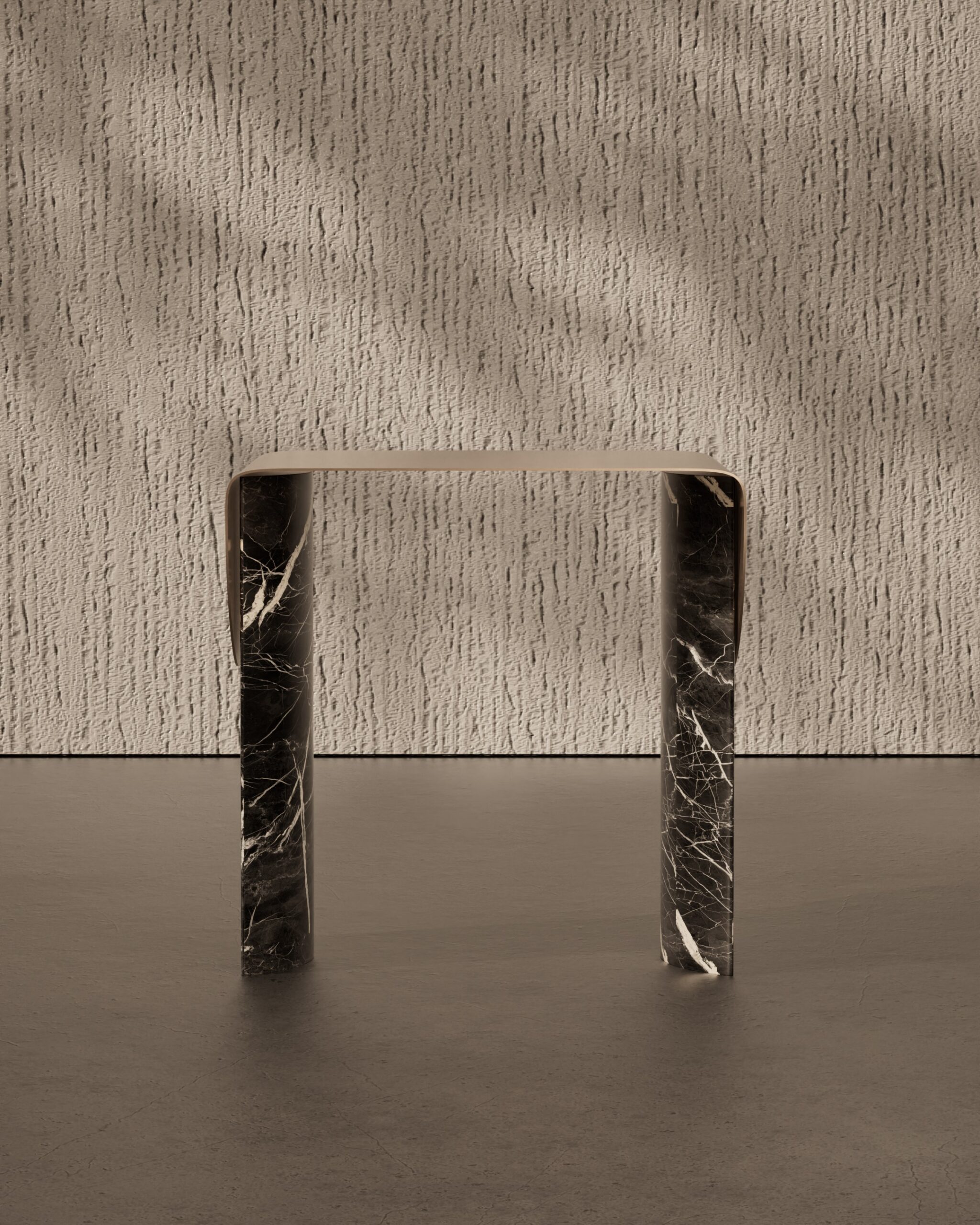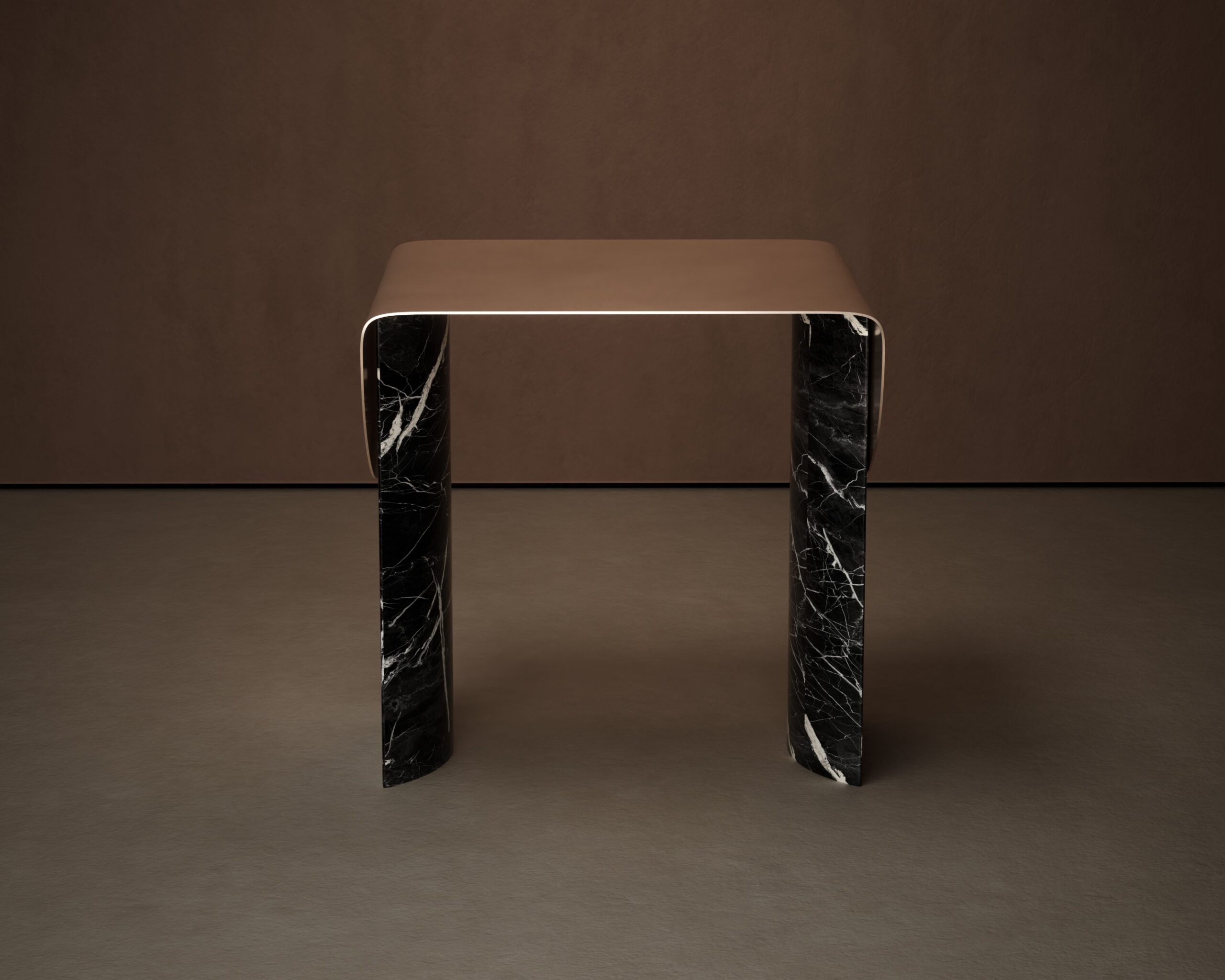 The ECLIPSE side table is a study in material tension and celestial silhouette. Part of our Design Studio Collection, the piece is defined by its ultra-thin matte champagne top, which appears to flow like liquid over its structural supports. This metallic plane terminates in two dramatic, semi-circular “flaps” that drape down the sides, partially obscuring the foundation. The table is anchored by two massive, asymmetrical pedestals crafted from deeply veined dark marble, featuring a polished finish that provides a stark textural contrast to the soft matte metal. The ECLIPSE balances the heavy, permanent presence of stone with the delicate, paper-like quality of its champagne shroud, offering a sophisticated and sculptural accent for modern interiors.