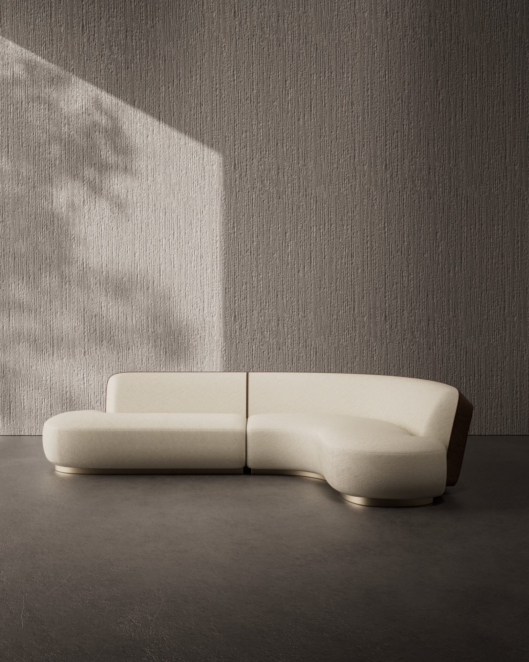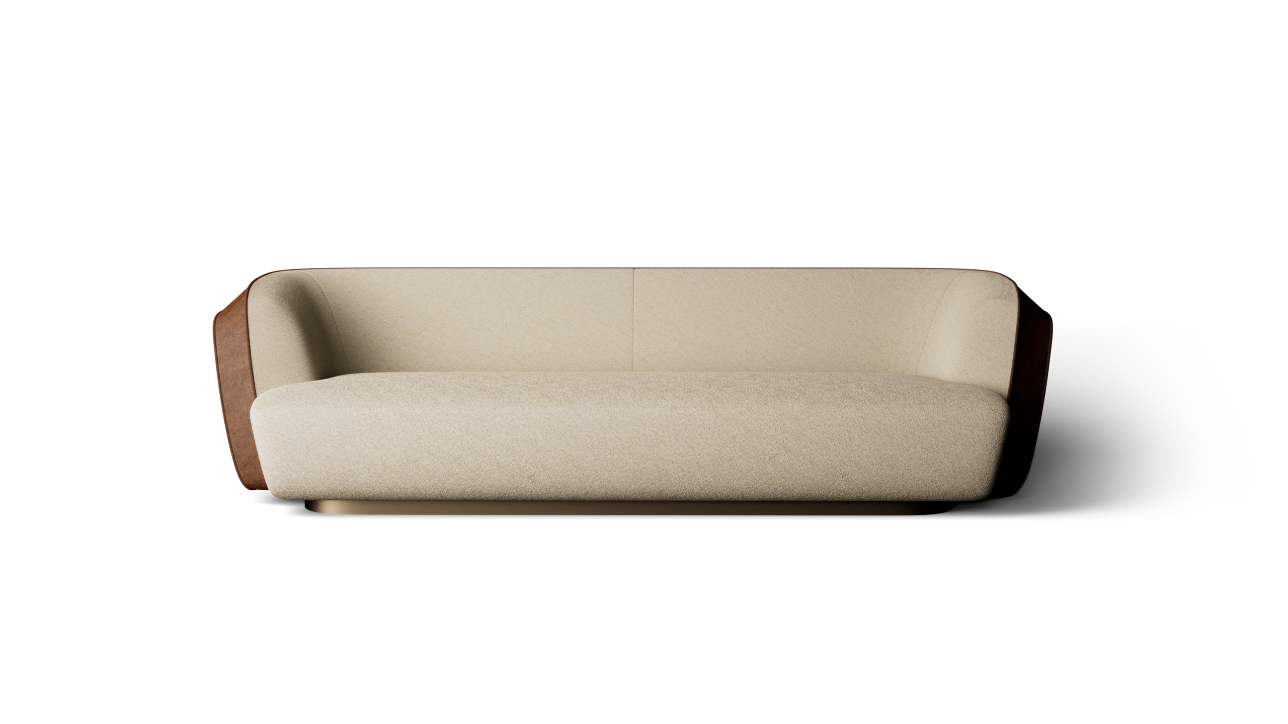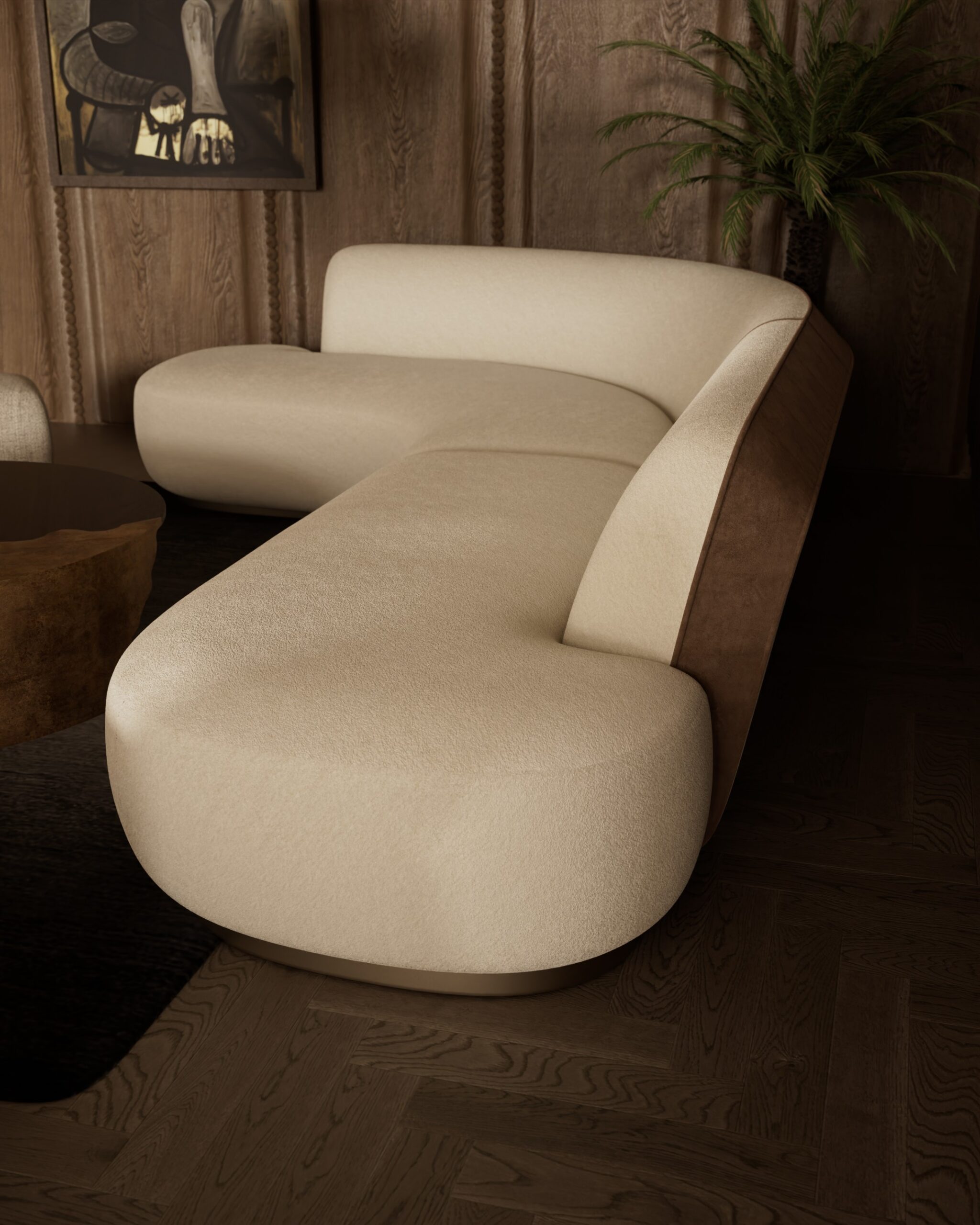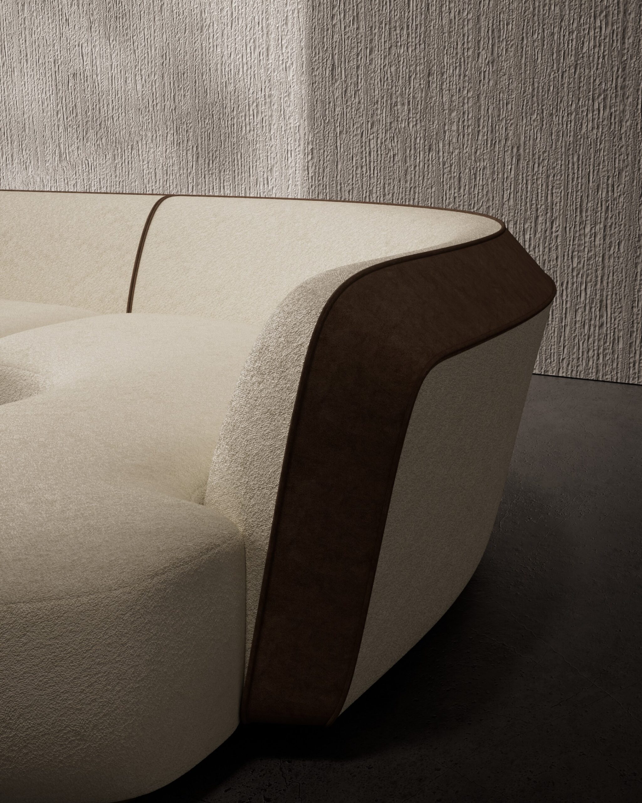 The ECLIPSE embodies celestial elegance through its dynamic interplay of light and dark materials. Its organic, kidney-shaped silhouette is upholstered in a tactile cream bouclé, strikingly contrasted by a deep brown suede panel that wraps around the exterior like a shadow. Floating atop a brushed brass plinth, this sofa offers a sophisticated study in texture and form, designed to look stunning from every angle.
