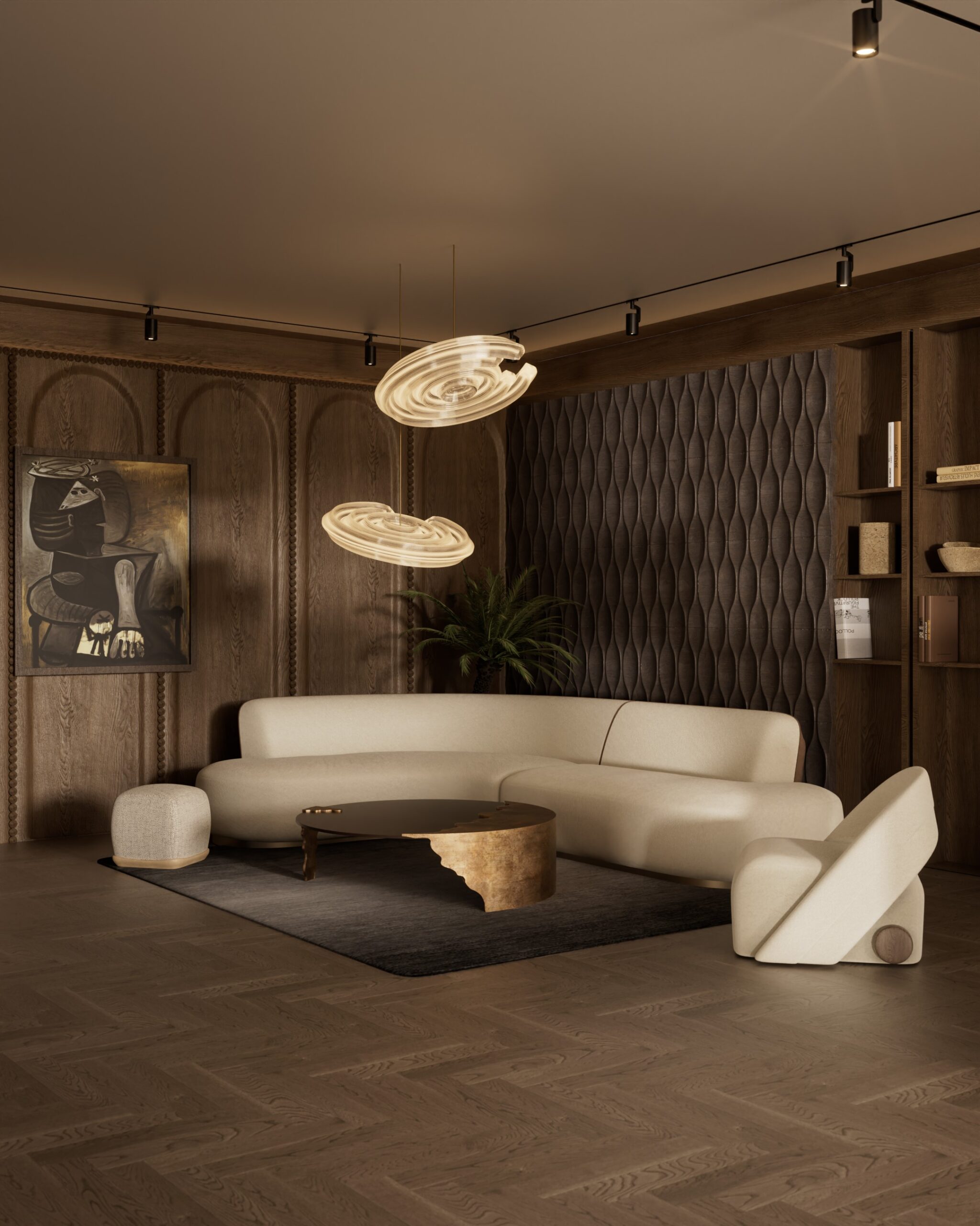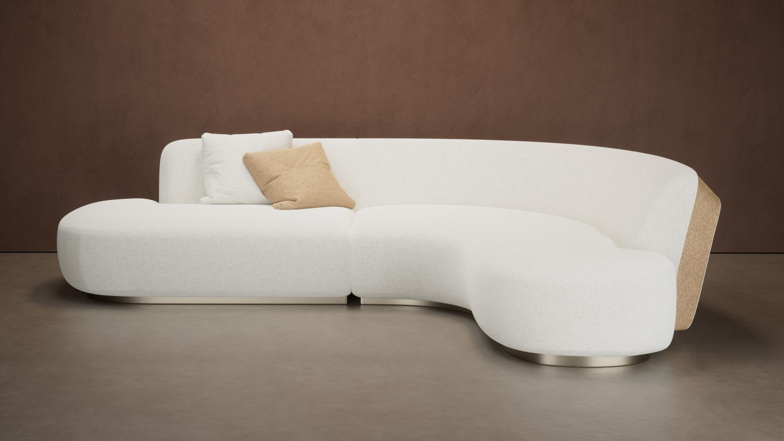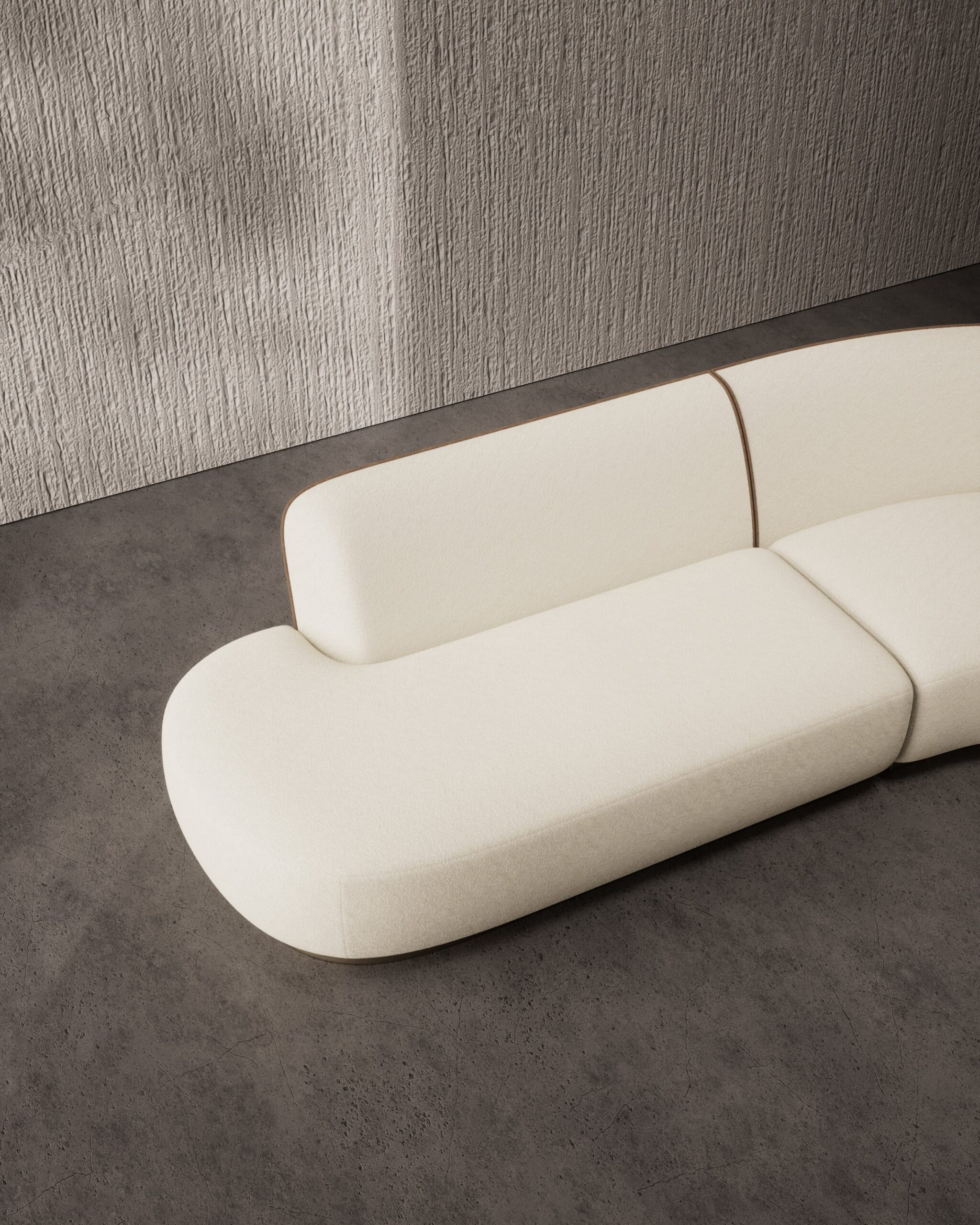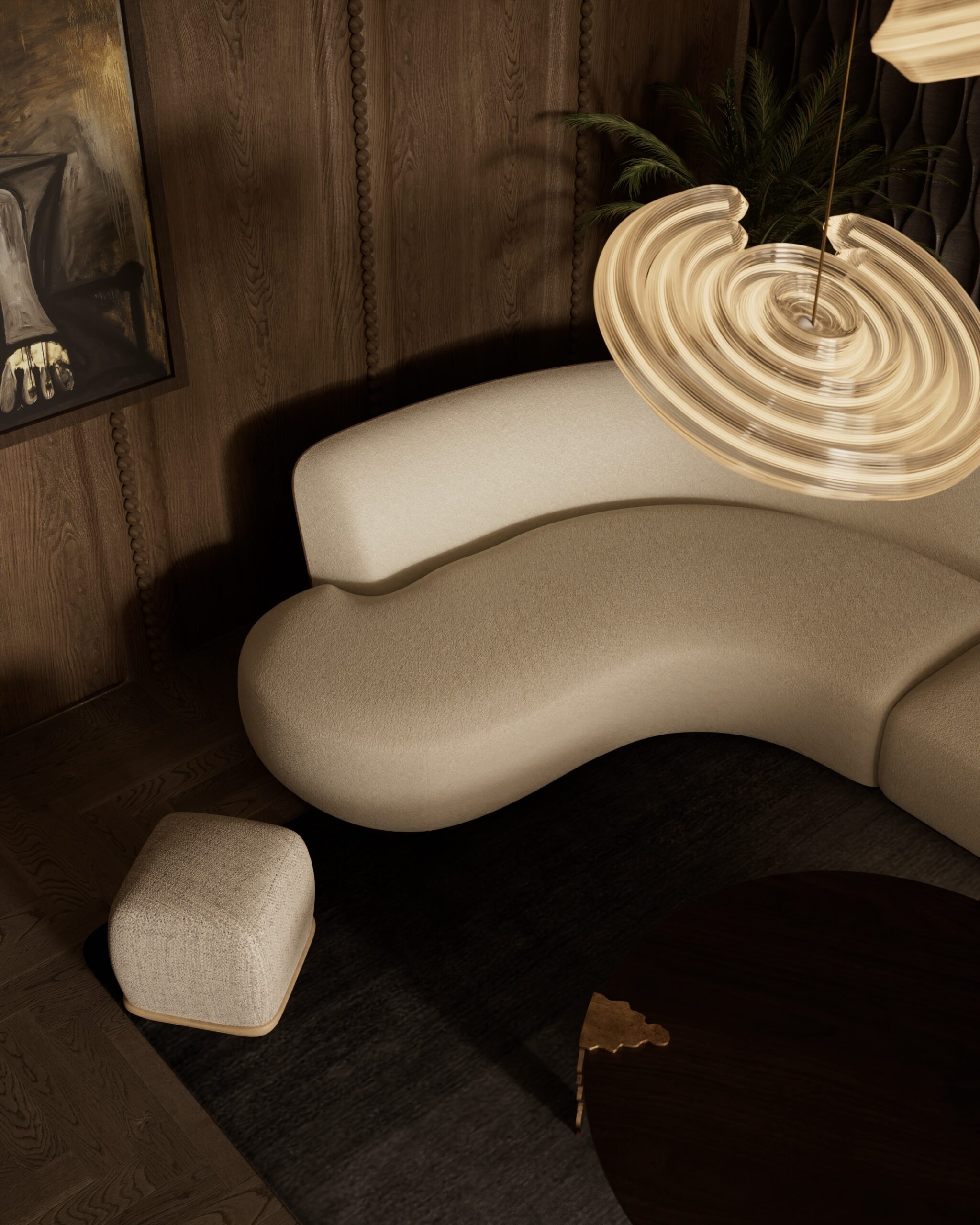 The ECLIPSE embodies celestial elegance through its dynamic interplay of light and dark materials. Its organic, kidney-shaped silhouette is upholstered in a tactile cream bouclé, strikingly contrasted by a deep brown suede panel that wraps around the exterior like a shadow. Floating atop a brushed brass plinth, this sofa offers a sophisticated study in texture and form, designed to look stunning from every angle.