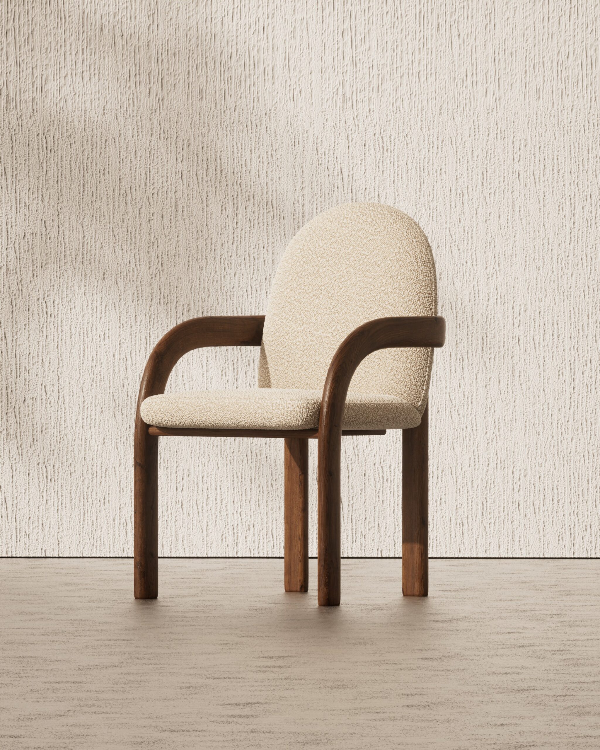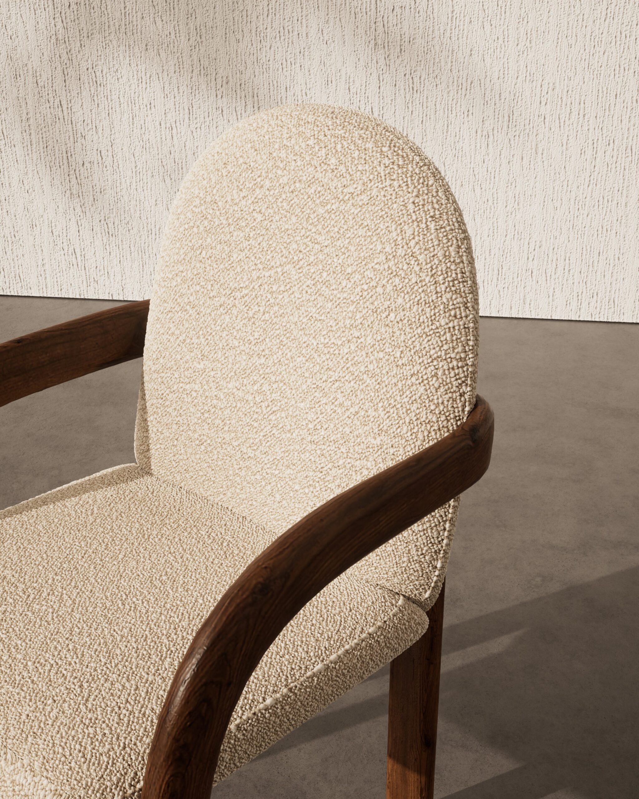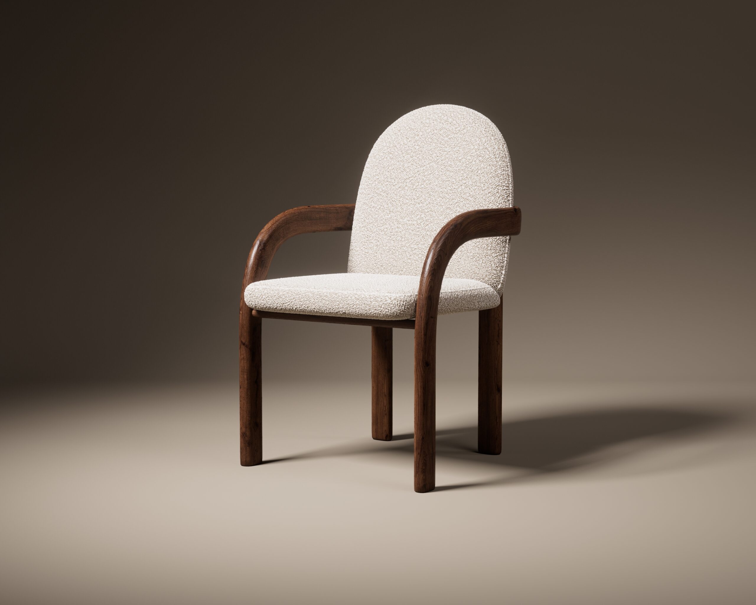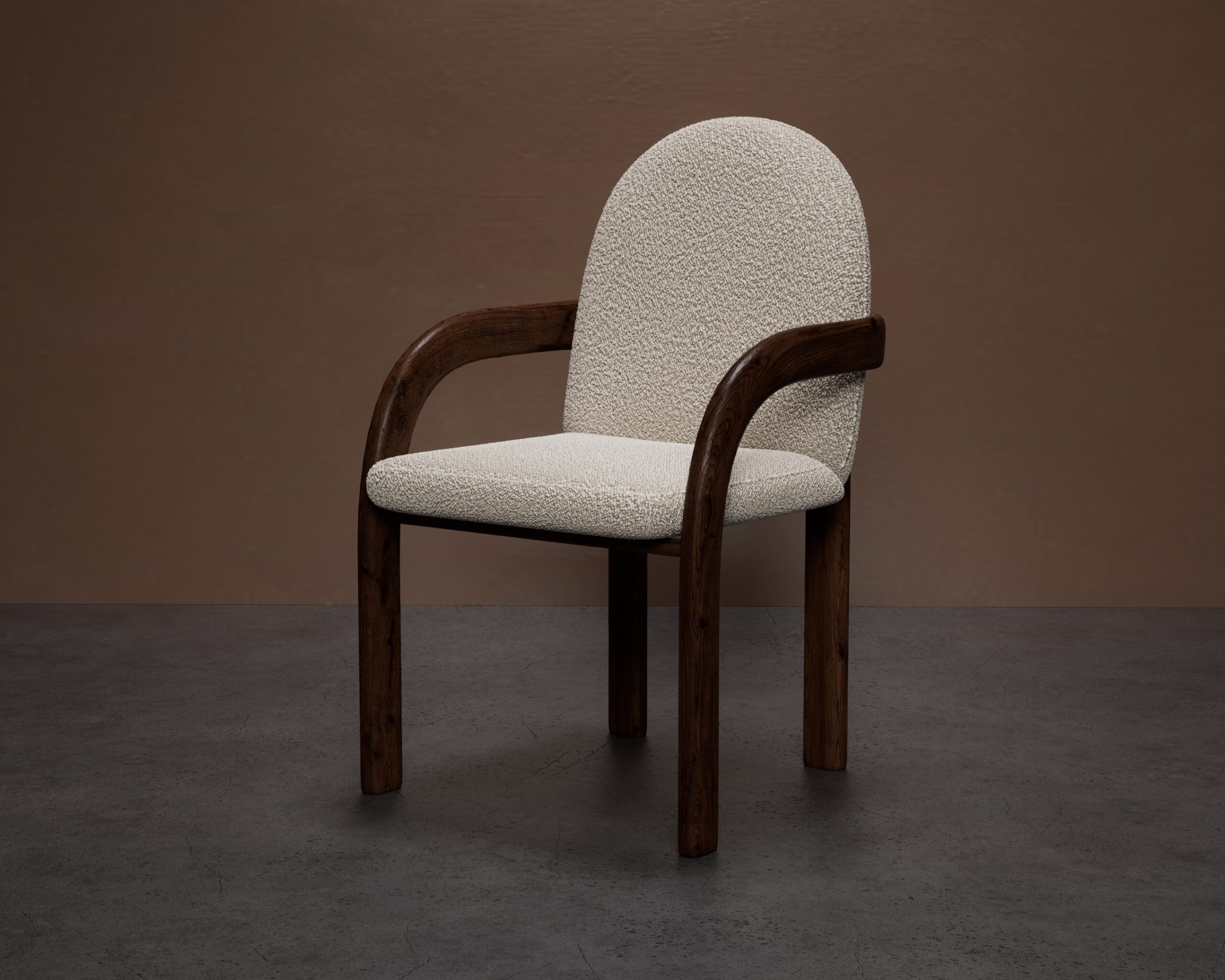 The EDWYN dining chair is an exploration of seamless curves and soft volumes. Part of our Design Studio Collection, it features a distinctive domed backrest upholstered in a tactile cream bouclé, providing a supportive, cocoon-like silhouette. The design is defined by its fluid walnut frame, where the curved armrests flow directly into substantial cylindrical legs, creating a grounded yet airy aesthetic. This interplay of warm wood and plush textile offers a sophisticated, mid-century inspired seat that prioritizes both comfort and architectural clarity.