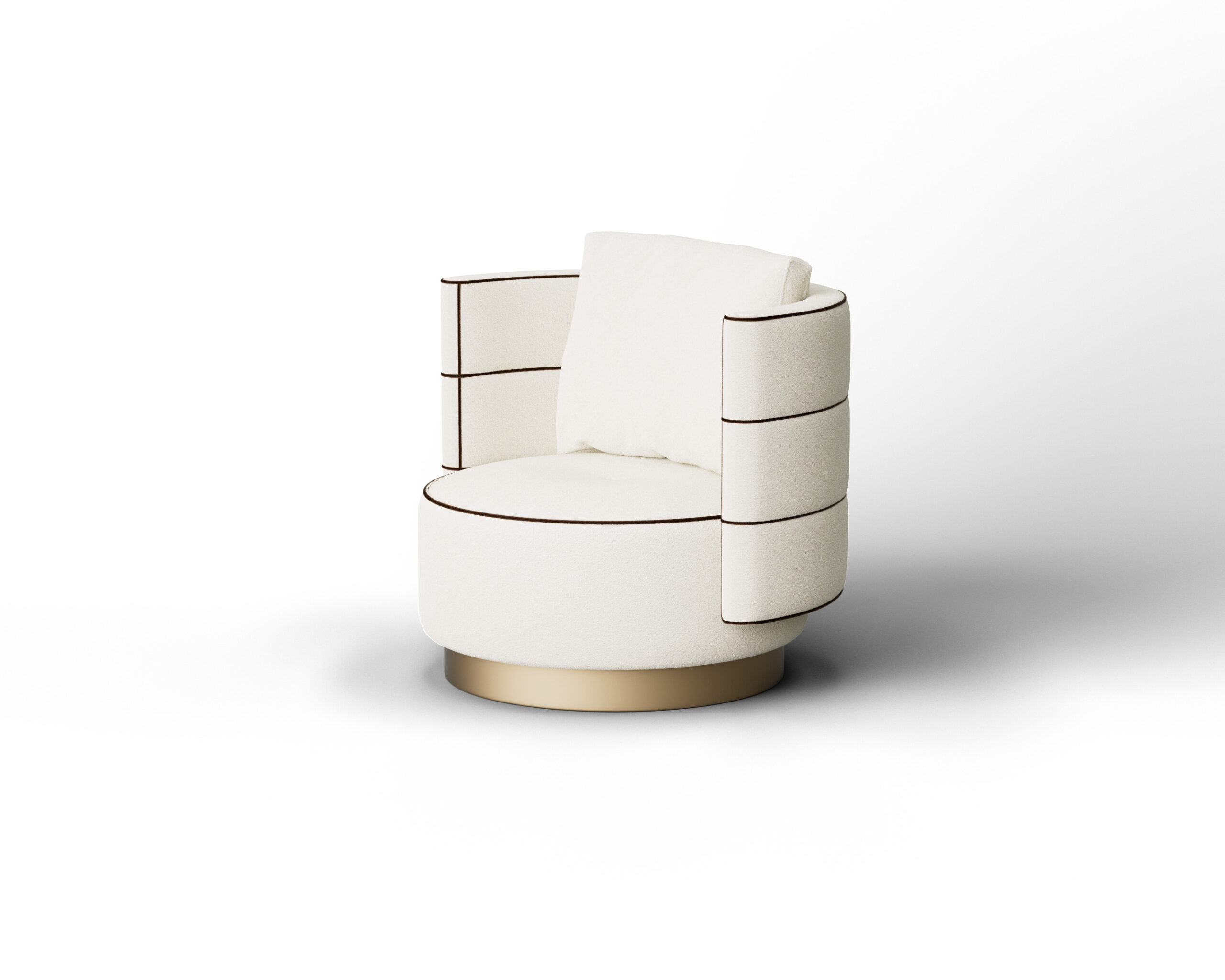 The ELINA armchair is a playful yet sophisticated nod to Art Deco glamour, designed to act as a sculptural statement piece. Its silhouette is defined by a unique, tiered structure that resembles three stacked rings, creating a sense of soft, architectural volume. The chair is upholstered in a creamy, touchable fabric, but the real showstopper is the bold black piping that traces every curve, giving the piece a graphic, almost sketched definition. Resting on a glowing brushed gold plinth, the Elina balances its whimsical “layer cake” shape with legitimate elegance, making it perfect for a chic vanity area or a high-end living space.