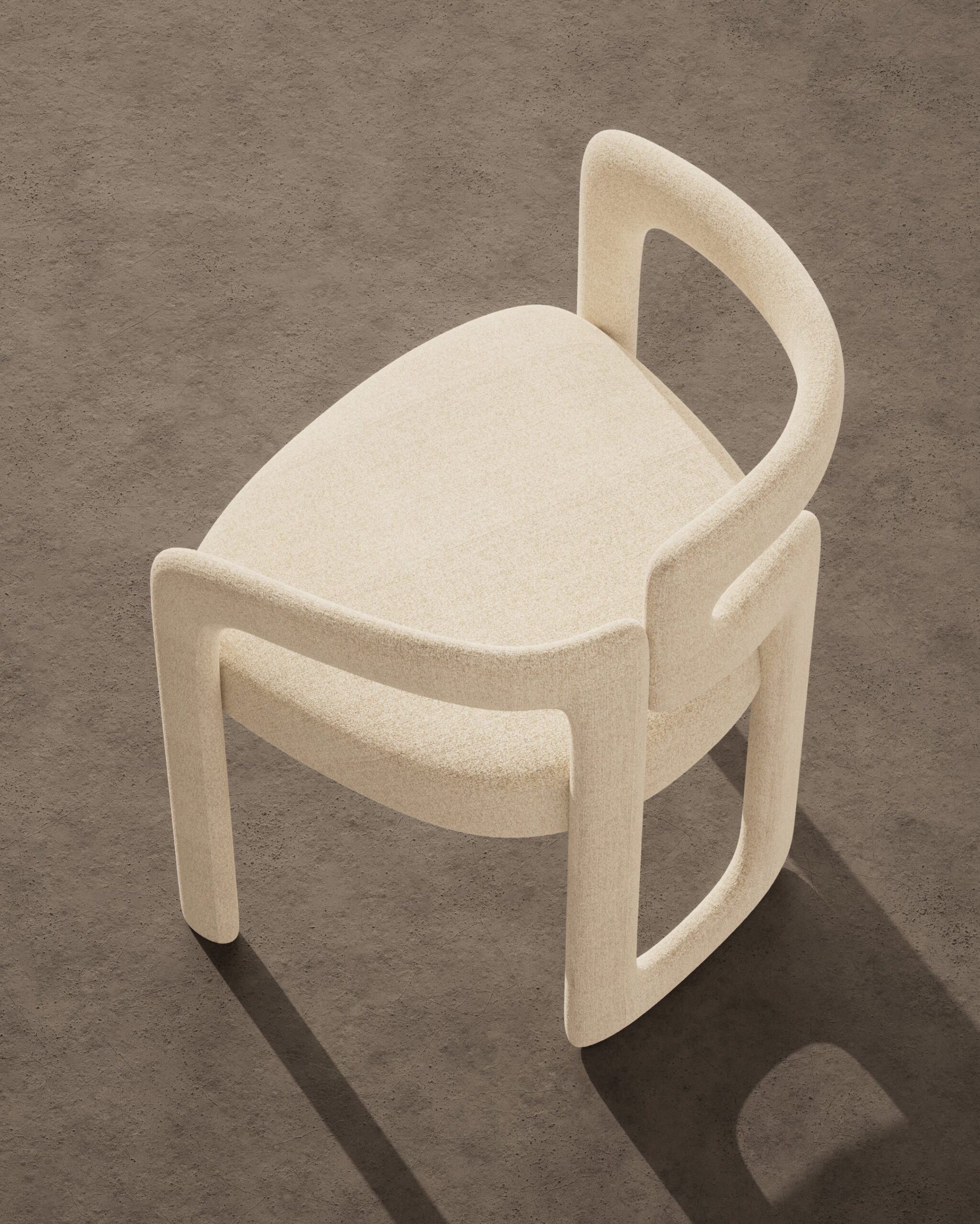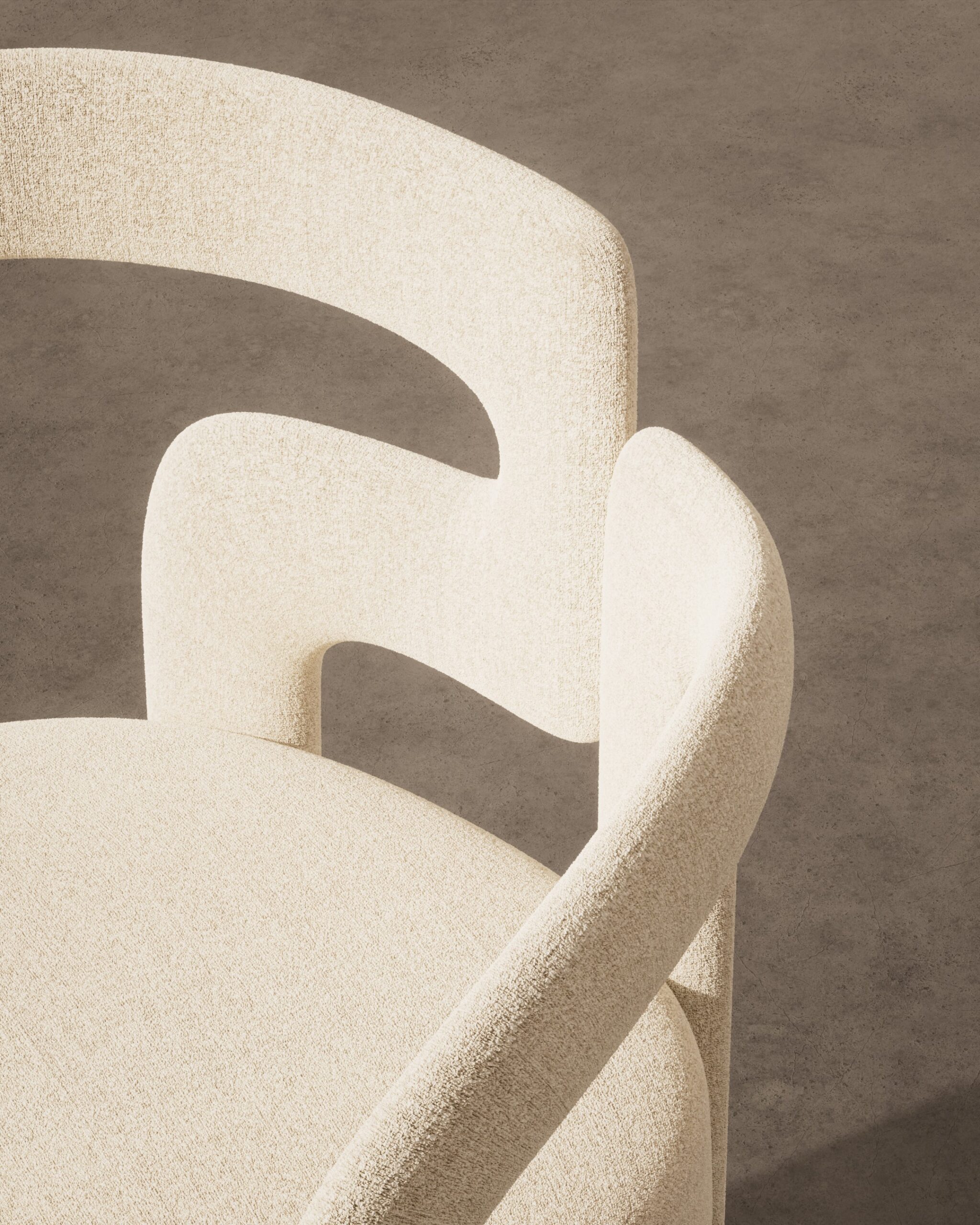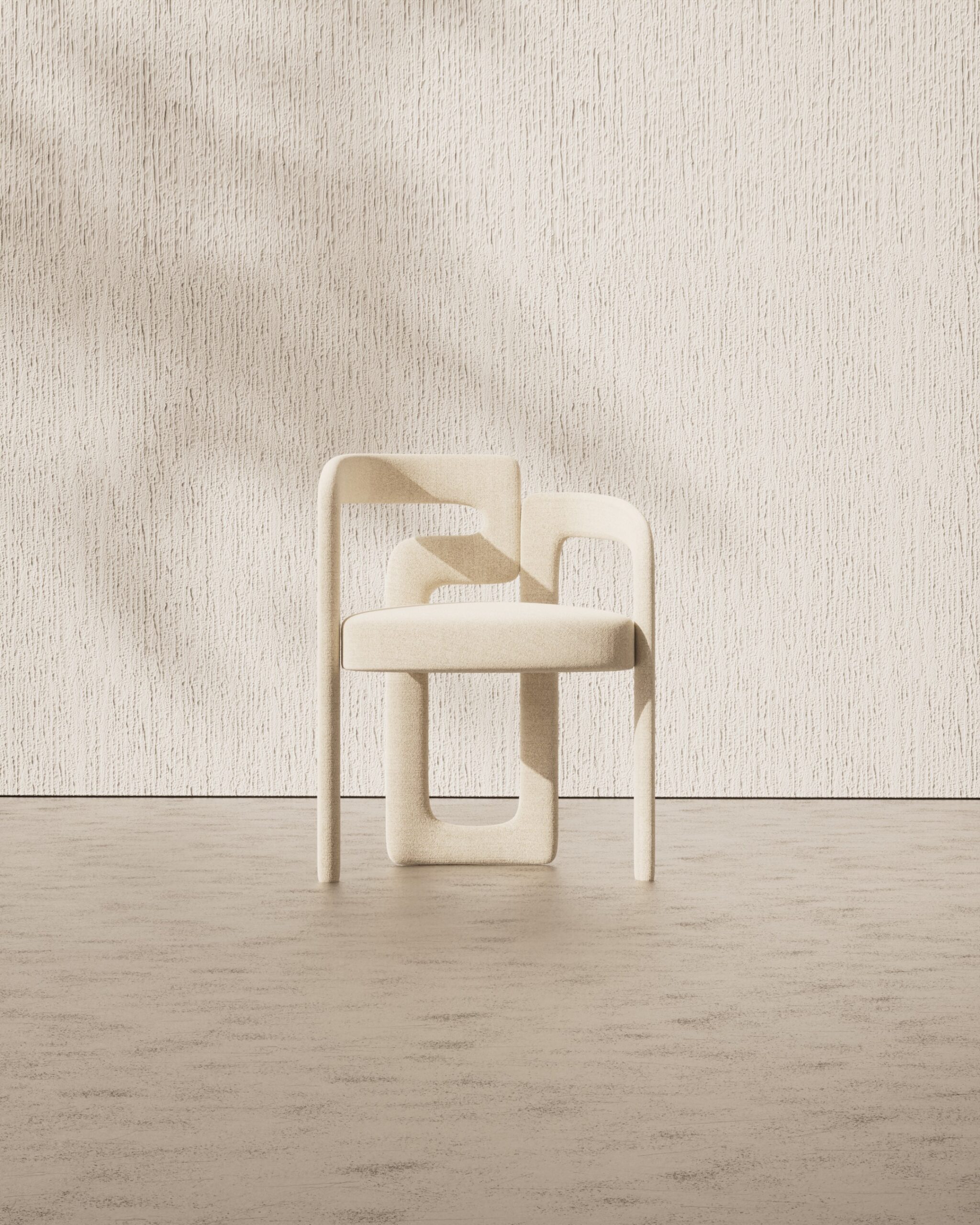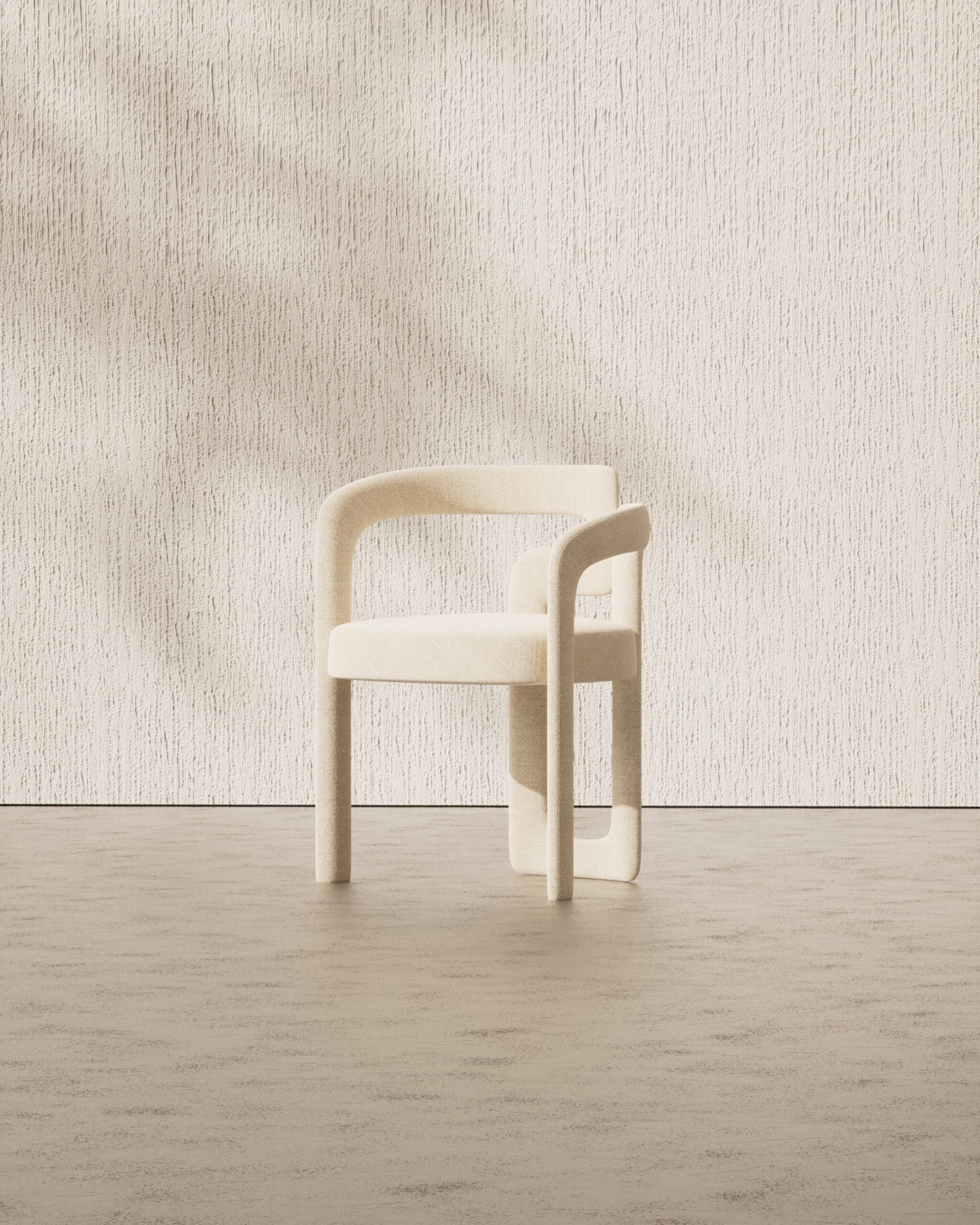 The ELOVA dining chair is a study in deconstructed geometry and material warmth. Part of our Design Studio Collection, it features an avant-garde frame where the ivory boucle upholstered backrest is precision-cut to interlock with a solid oak structural pillar. The composition balances varied volumes, pairing a soft, rounded rear support with a sharp, rectangular front leg to create a functional silhouette that doubles as a piece of modern sculpture.