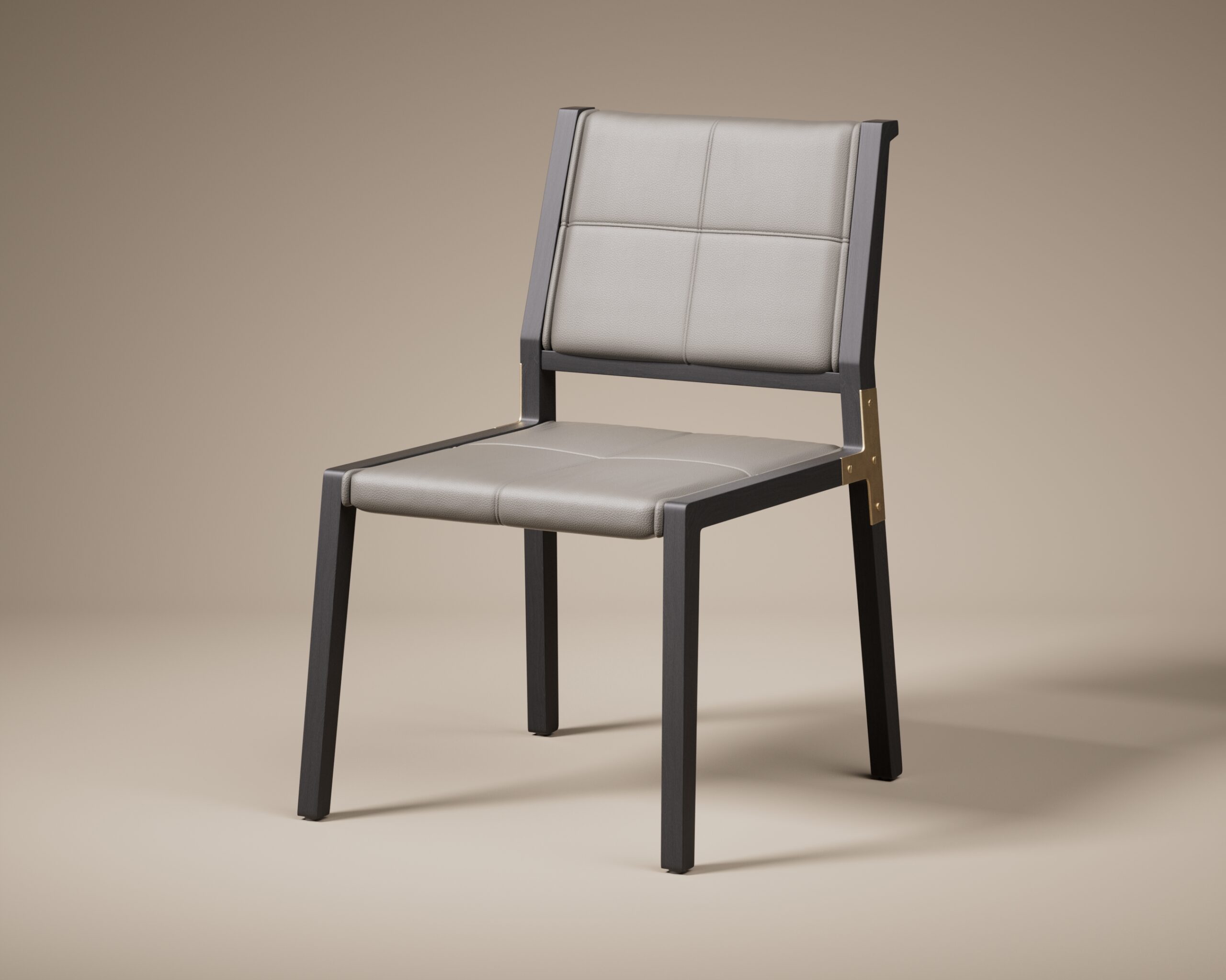 The visual narrative is defined by its tactile material layering. The seat and backrest are clad in a supple pebble grey leather, featuring a rhythmic grid-stitch pattern that adds depth and ergonomic comfort to the slim profile. At each primary structural junction, a satin brass T-bracket is secured with visible hardware, serving as a refined mechanical jewel that highlights the chair’s artisanal construction. The ENVOY balances its rigid, disciplined frame with the softness of premium upholstery, offering a sophisticated and commanding presence for modern dining environments and professional boardrooms.
