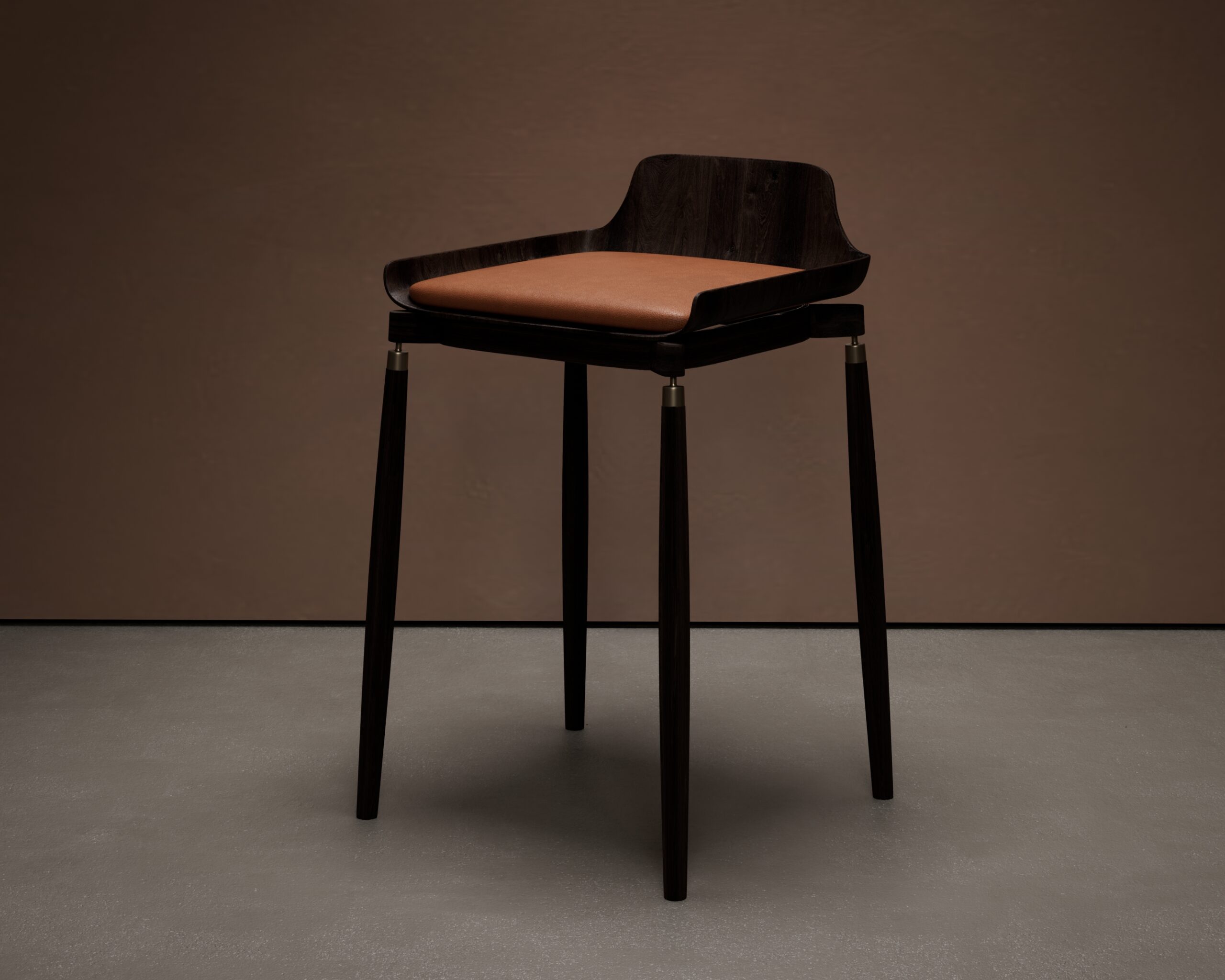 The ESPRESSO bar stool is a study in sculptural precision and material warmth. Part of our Design Studio Collection, it features a tailored amber leather seat set within a hand-finished dark smoke walnut frame. The design is defined by its clean, architectural lines, where the seat flows into a low-profile backrest and is elevated by slender legs tipped with satin brass accents. This interplay between rich wood grains and delicate metallic hardware provides a sophisticated, grounded presence for elevated bar or counter settings.