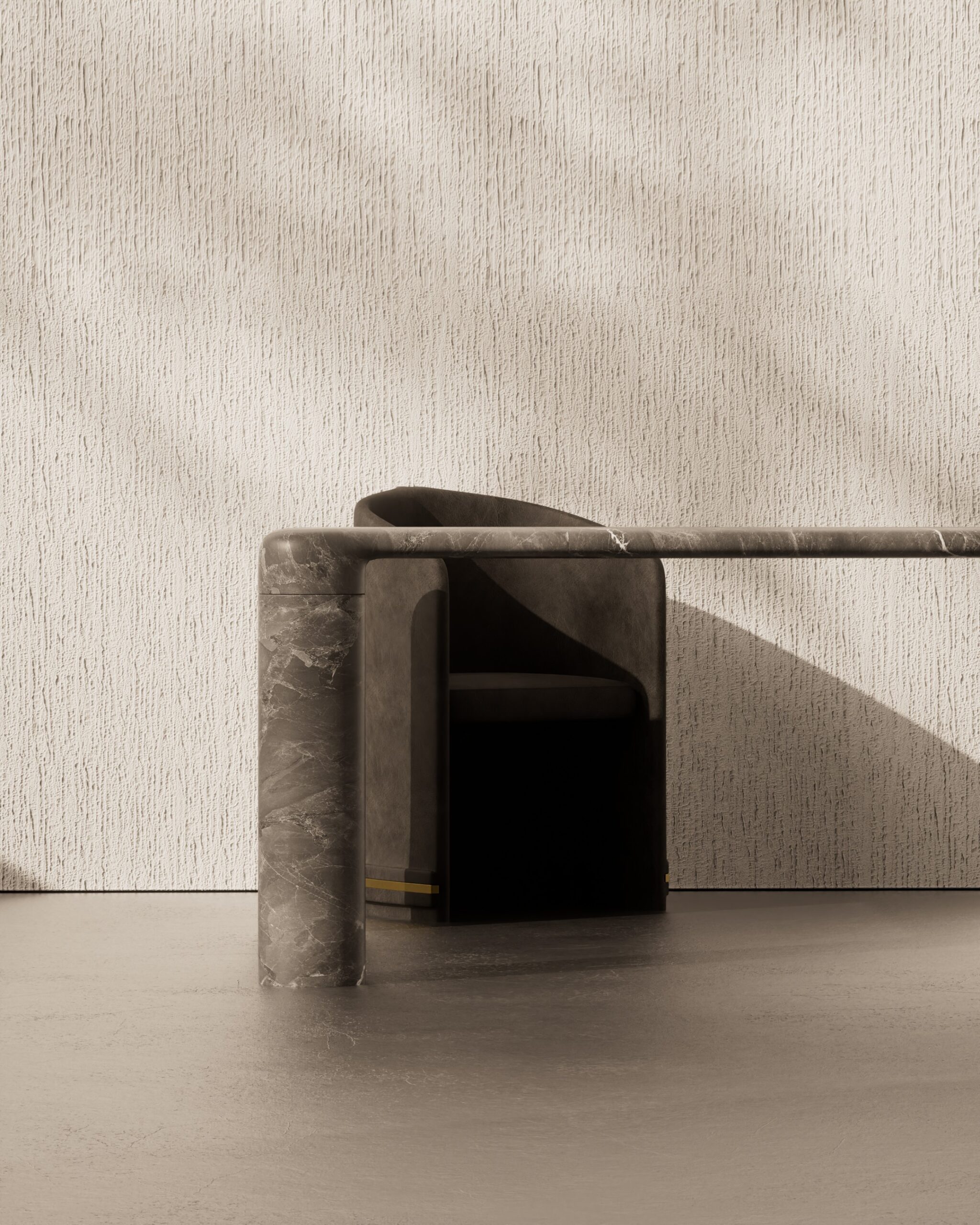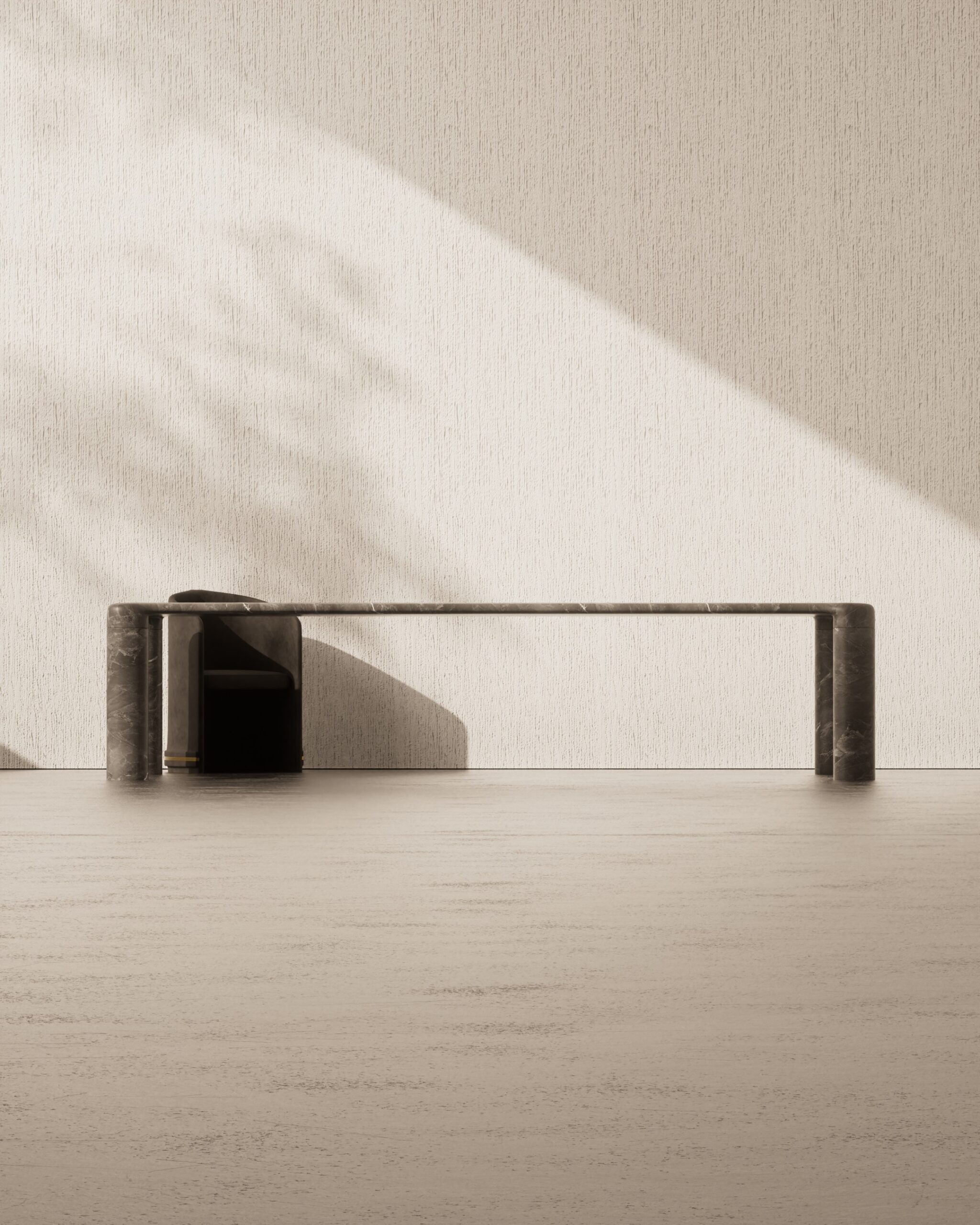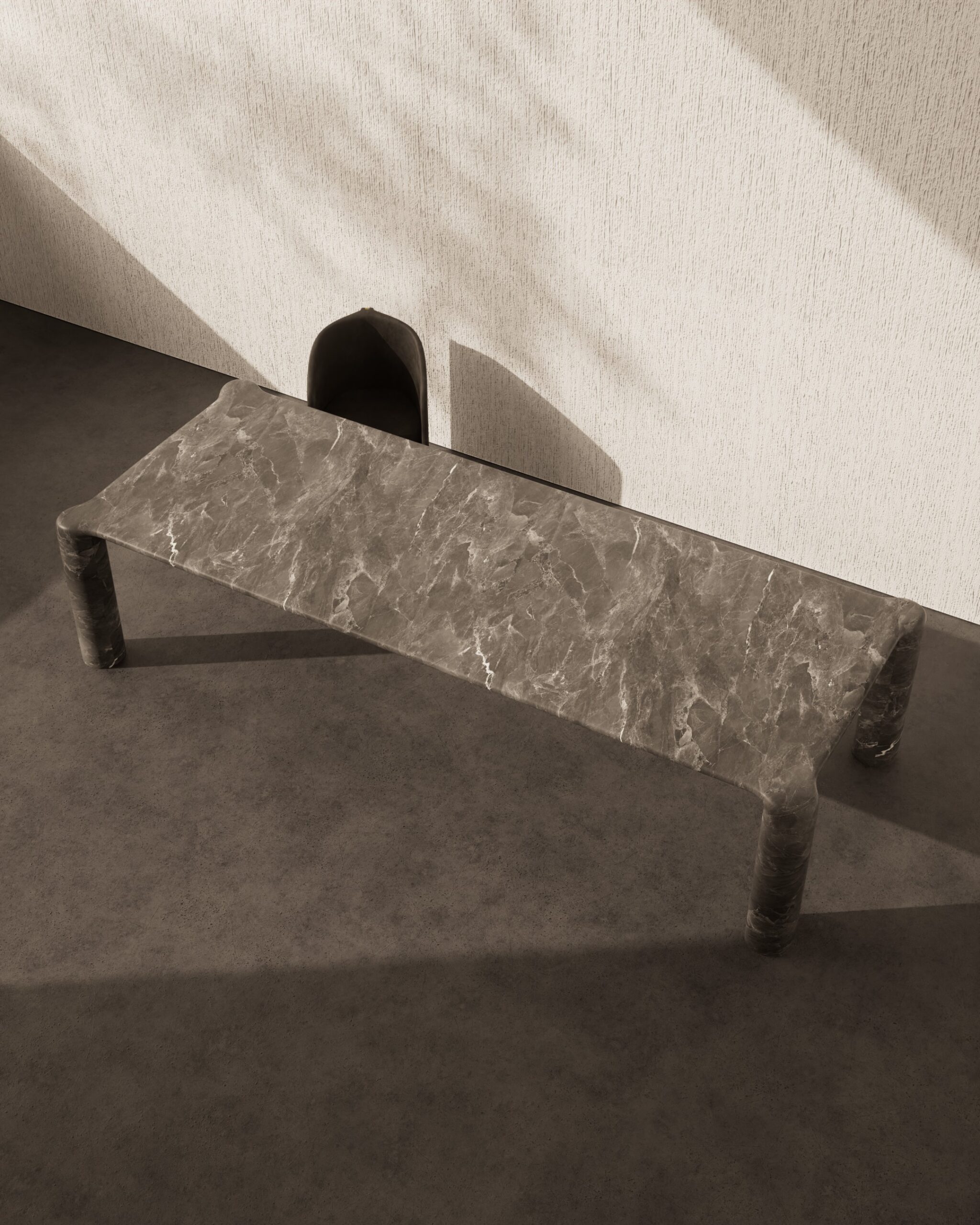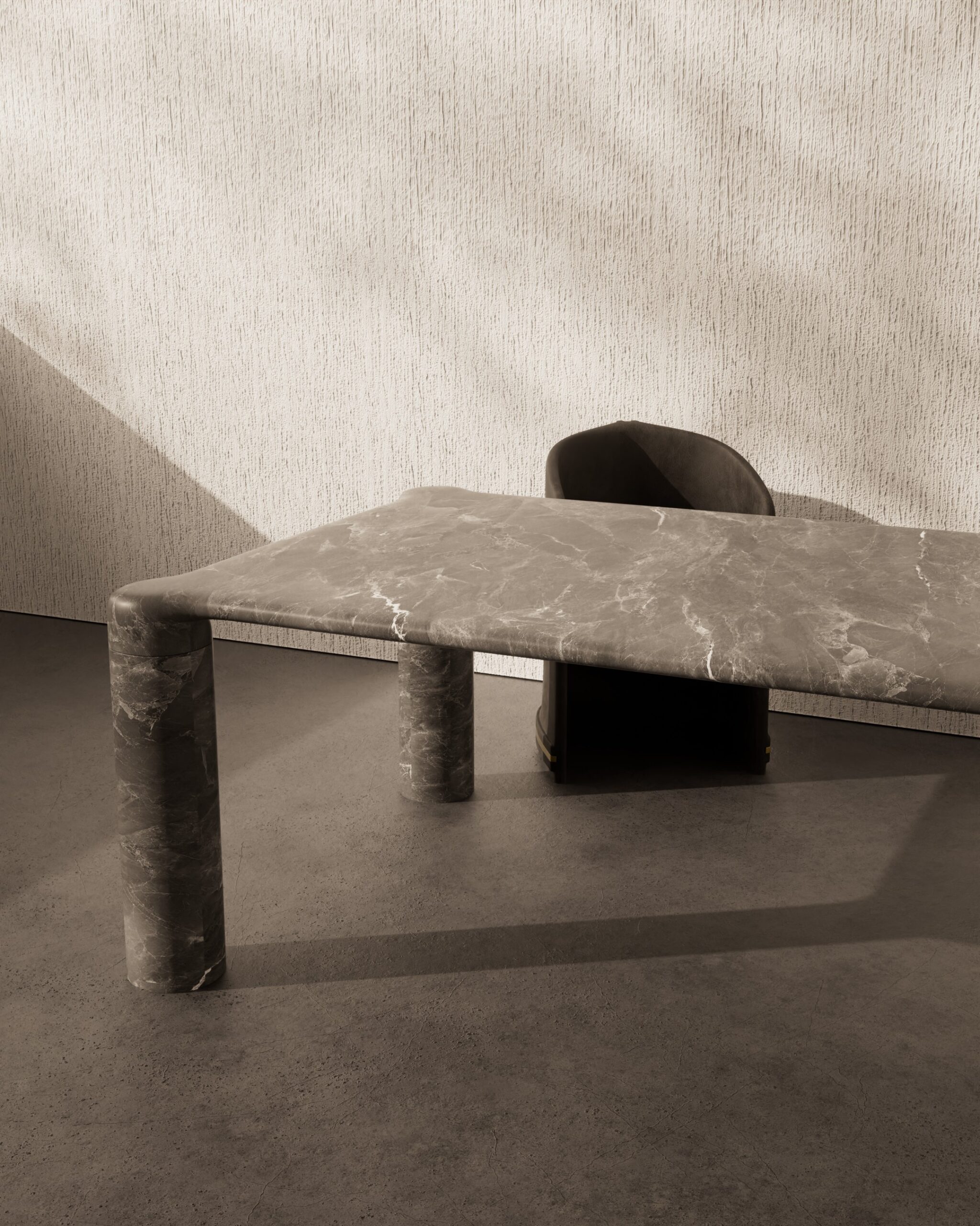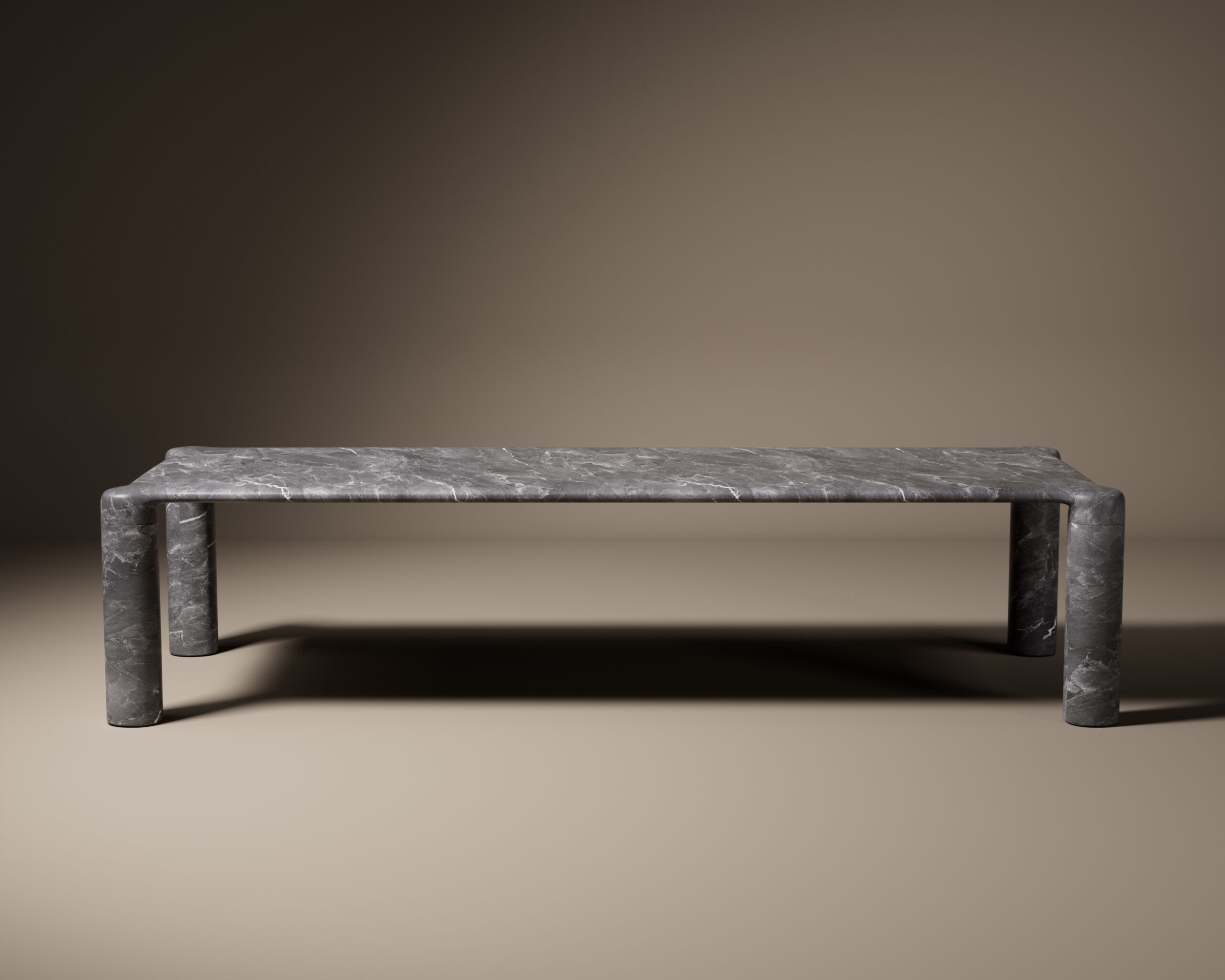 The FEAST dining table is an exploration of seamless stone materiality and structural purity. Entirely carved from a textured grey-beige marble, the piece features a vast rectangular surface defined by soft, continuous radius edges that flow into its foundation. The design is anchored by four monolithic cylindrical legs, positioned at the far corners to create a grounded, architectural silhouette. By utilizing a singular material for both the surface and the support, the FEAST table achieves a sense of permanence and understated luxury for the modern dining space.