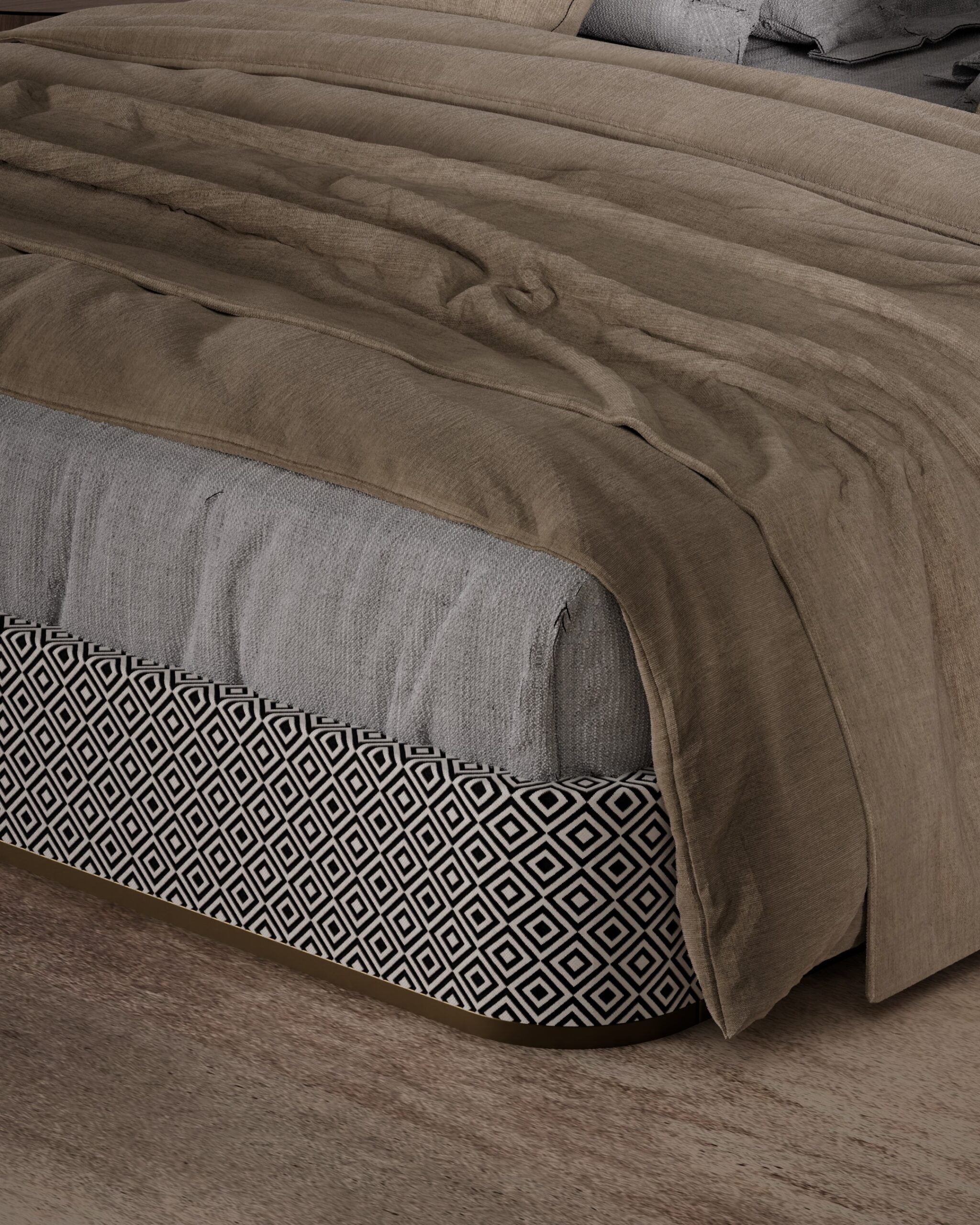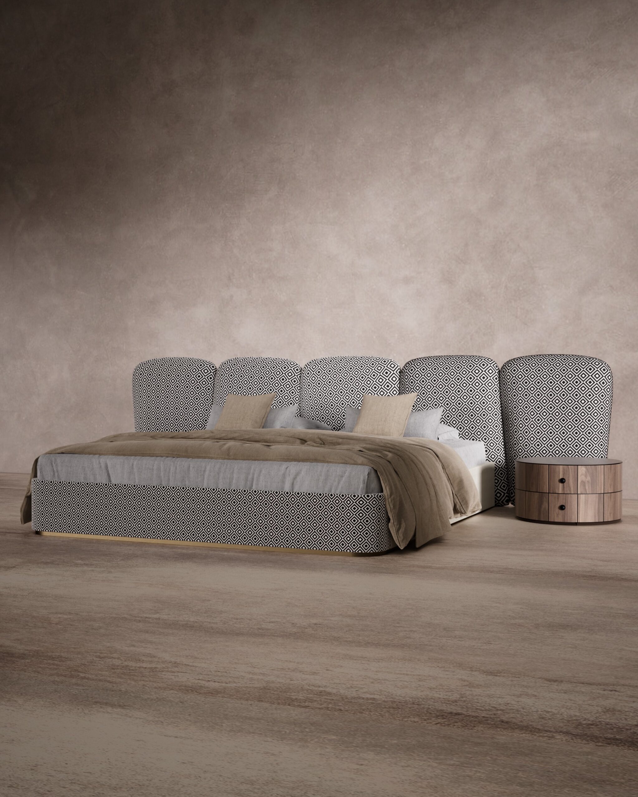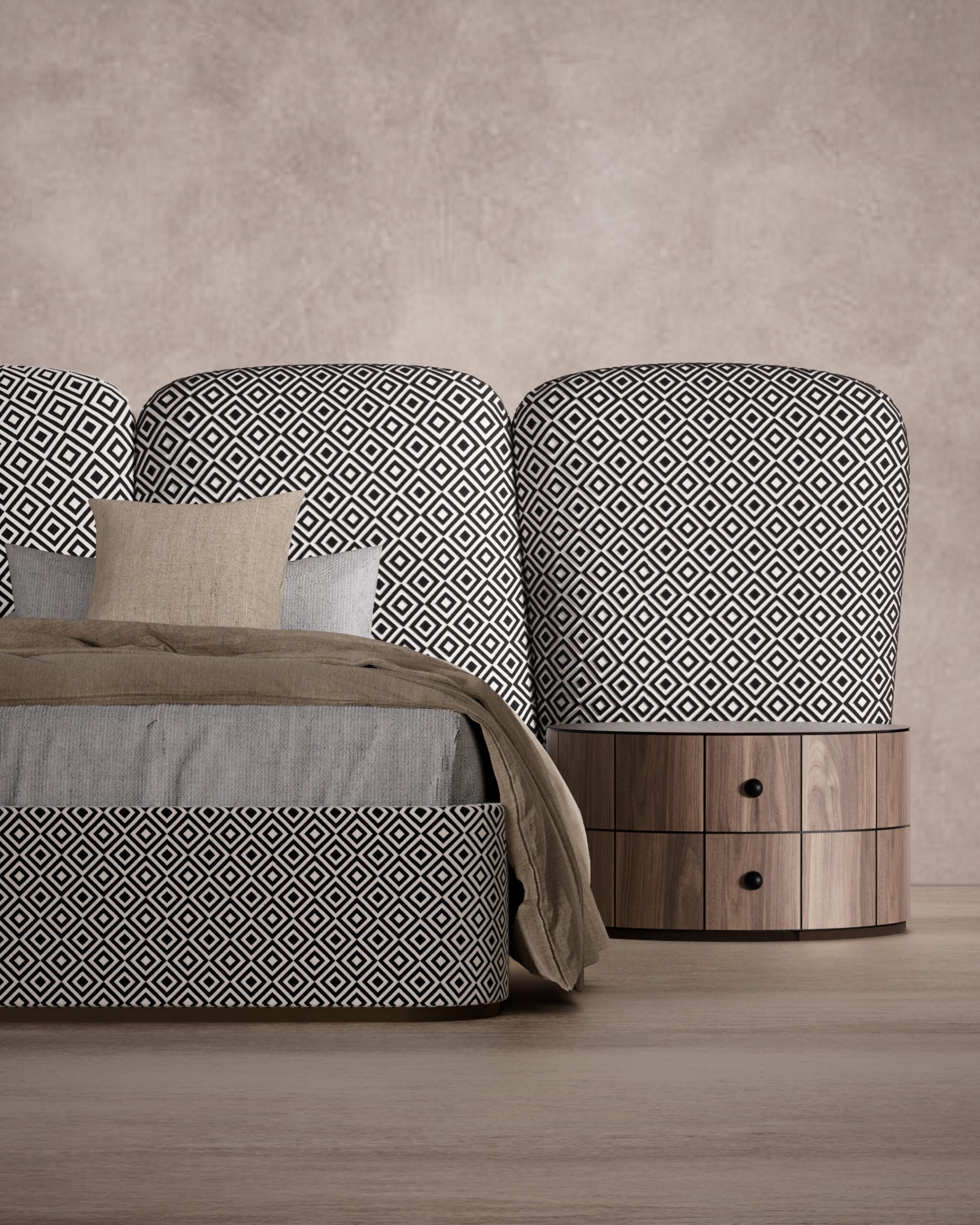 The FIVE-LEAF bed is a bold exercise in graphic rhythm and silhouette. Its namesake feature is the dramatic headboard composed of five distinct, rounded panels that stand side-by-side, creating a scalloped architectural backdrop. The entire frame is upholstered in a mesmerizing black and white diamond geometric pattern that adds a retro-modern optical pop to the space. This striking monochrome look is grounded by sleek, cylindrical walnut nightstands with simple black hardware, offering a warm, natural contrast to the busy textile.